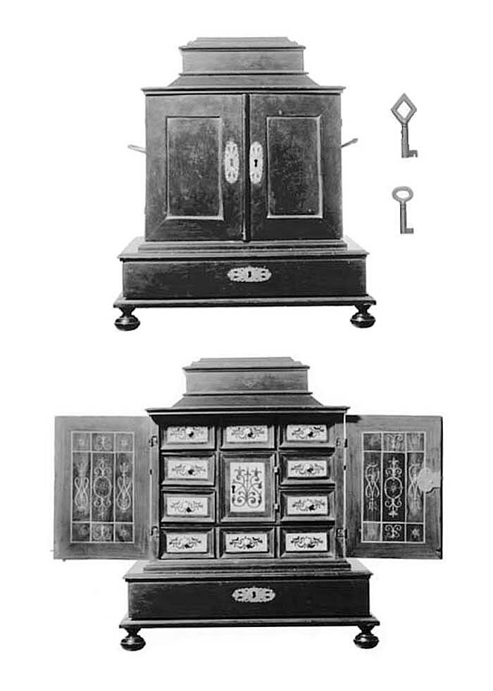 KABINETTSKÅP, 1600-talets förra hälft. Av svartbetsat trä med inläggningar av elfenben och ebenholts. Stående avlångt med raka former, indraget överstycke, två dörrar på gångjärn av järn samt hög sockel på fyra kulfötter. Inköpt av Wilhelmina von Hallwyl i december 1888 från antikhandlare Eduard Kahlert, Eisenach, för 115 mark.