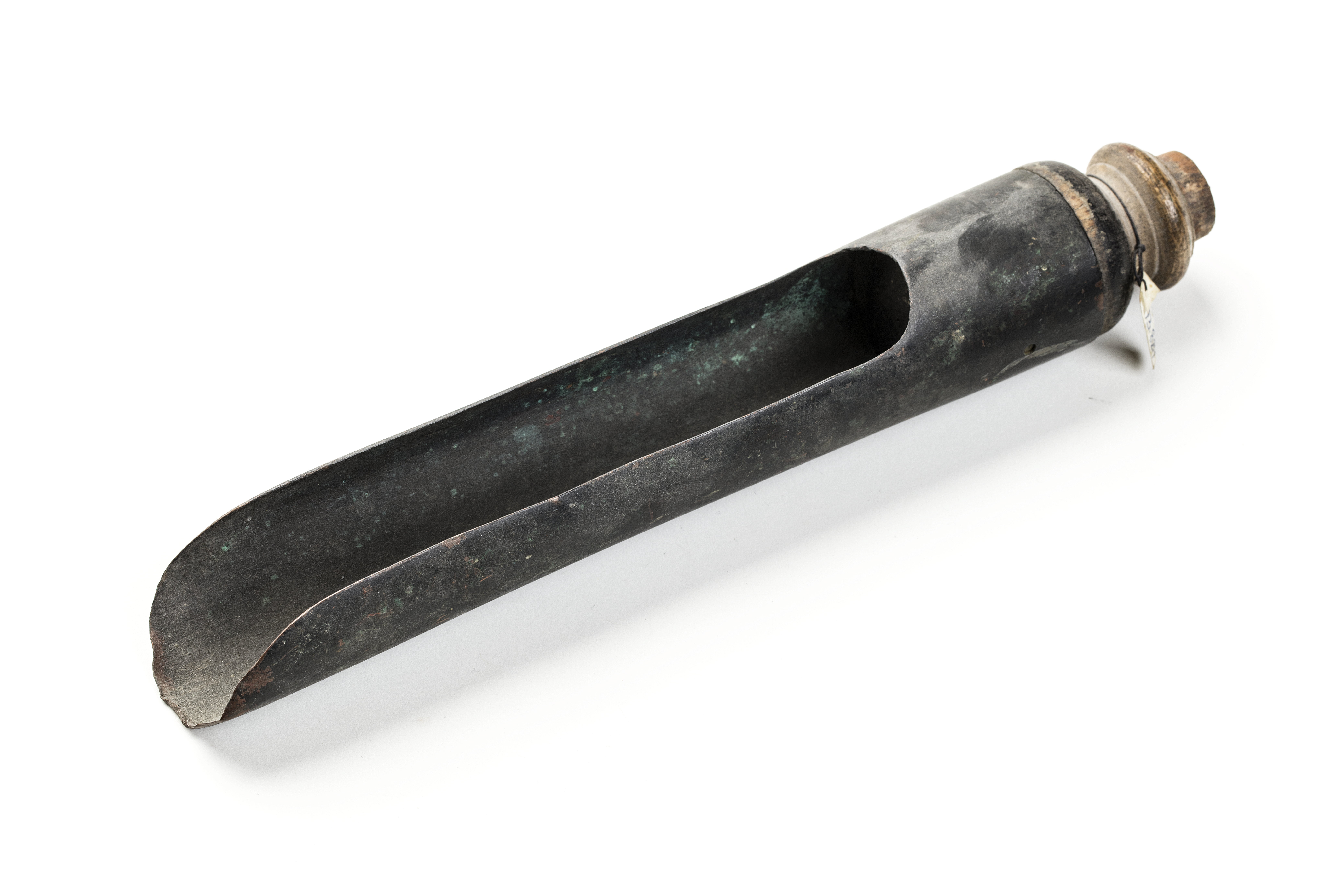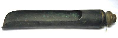 Skyffel av svartmålad kopparplåt, cylindrisk med på ovansidan en 165 mm lång öppning, framtill med snedskuren kant. I änden en inpressad botten, ca 76 mm lång med bakre delen utskjutande till ett 37 mm långt utåt avsmalnande hantag med svarvade ringar.