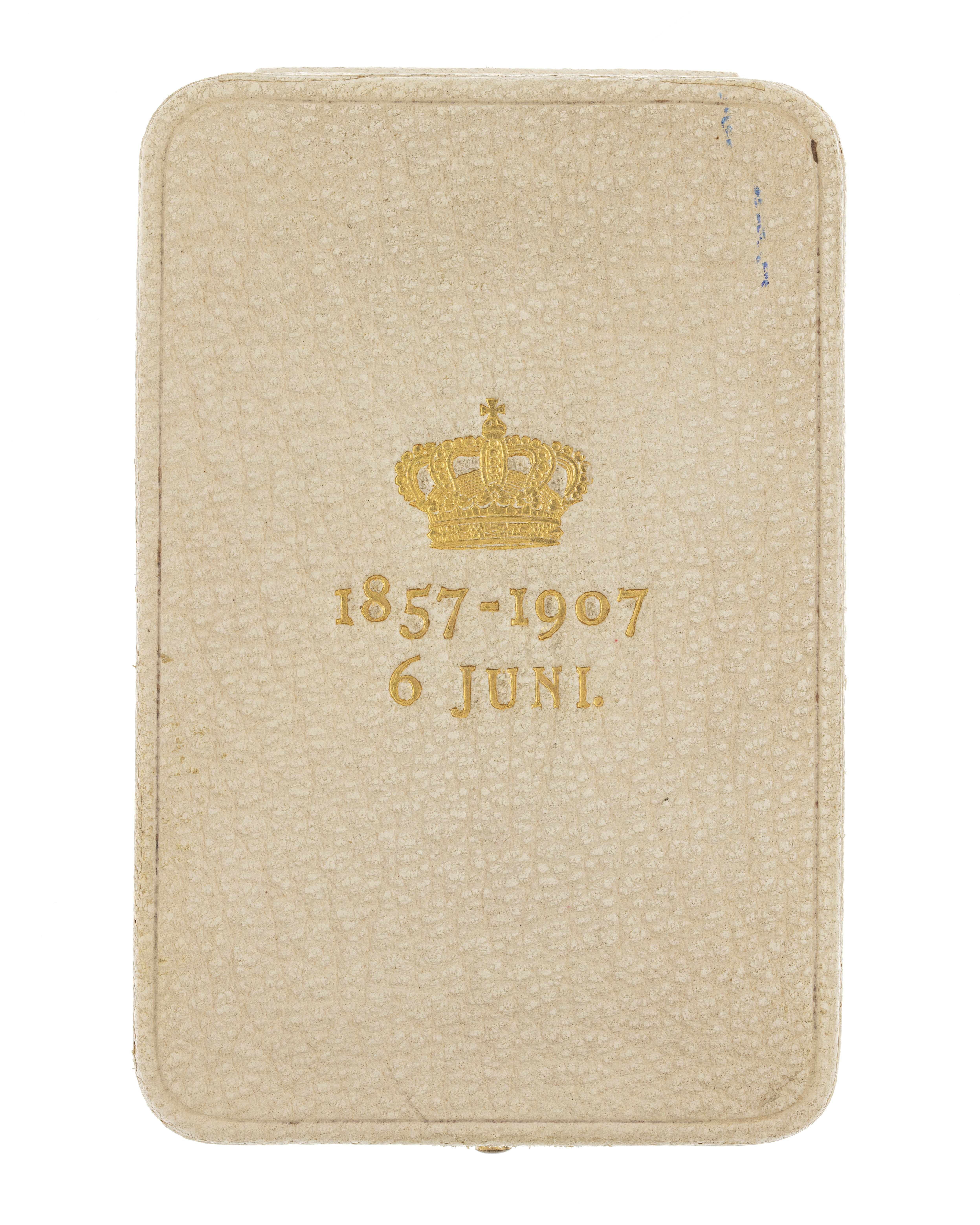 Rektangulärt etui av trä med rundade hörn och svagt välvt lock. Utvändigt klätt med benvitt skinn, på locket i guldpressning en kunglig krona och därnedanför: "1857-1907((6 JUNI." Fjäderlås av gulmetall, överklätt gångjärn. Locket invändigt klätt med vitt siden, firmamärke tryckt med guldfärg: hovjuvelerare C F Carlman, Stockholm. I underdelen fast insats klädd med gråvit sammet, upphöjning med urtag för det stora tecknet.