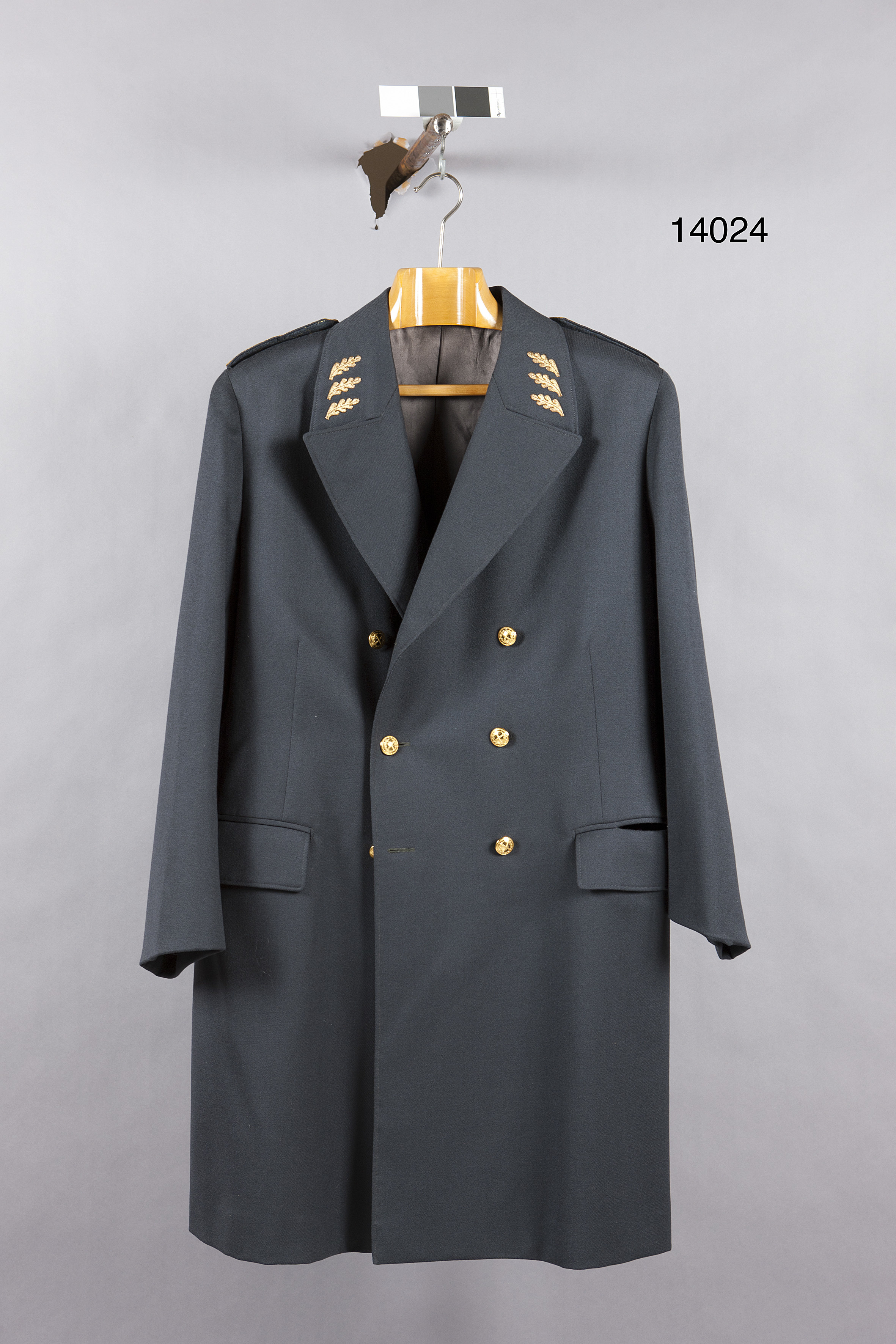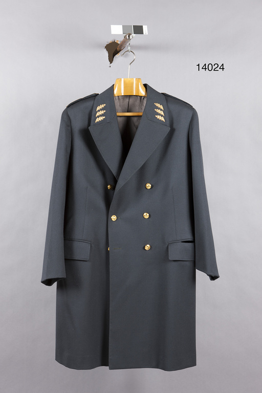 Uniformskappa av blå-grå yllediagonal, modellenlig. I höger innerficka firmaetikett: "AB Nilsson & Lindman // Stockholm den jan 1961 // H.M. Gustaf VI Adolf". På axelklaffarna fyra stjärnor av guldlav.