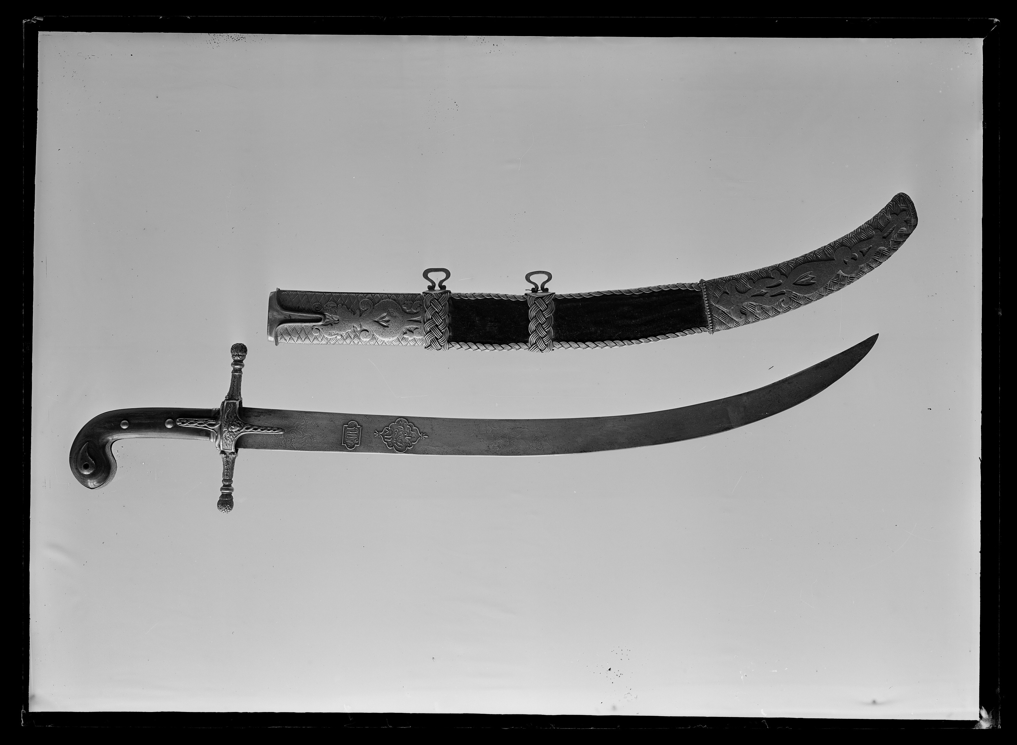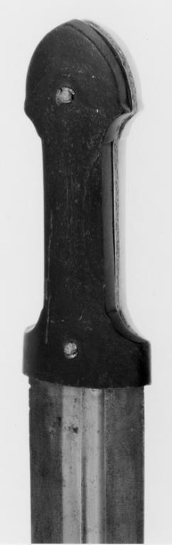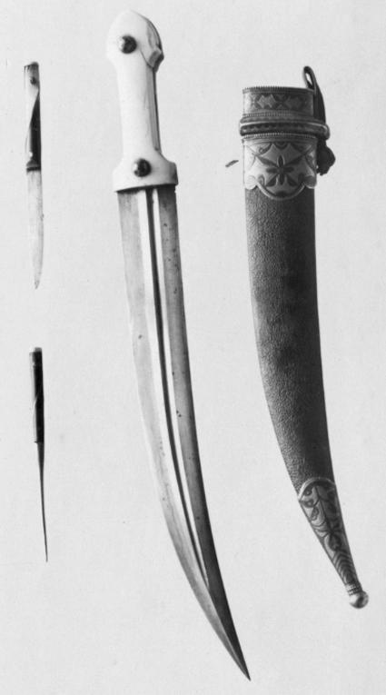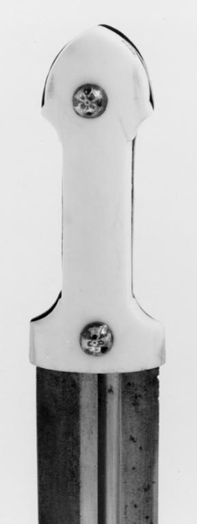Fäste av kama-typ, smalare på mitten klätt på insidan av mörkbruna horn på utsidan av elfenben fäst med två runda välvda nitar av silver med rosettformiga inläggningar i niello. Mellan plattorna smal skena av silver med nielloarbete. Klinga av stål 40 mm bred, böjd, tvåeggad med osymmetriskt placerad hålkäl på var sida. Eggarna bestrukna med nafta (?).