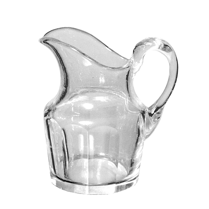 Gräddkanna av färglöst glas. Rund, med snås och hänkel.