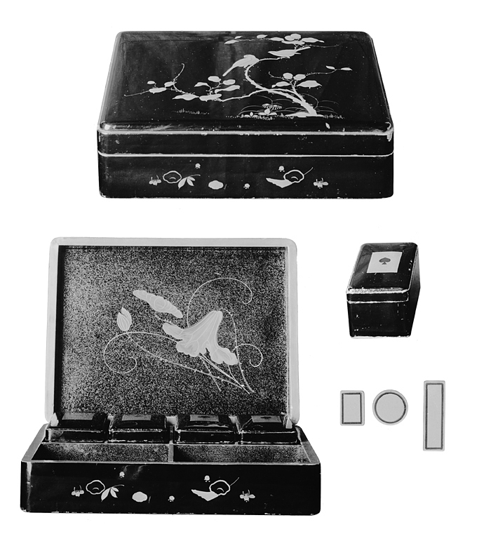 SPELMARKSSKRIN Innehållande fyra askar med spelmarker. Skrin och askar av trä, svartlackerade, med dekor i guld och färger. Rektangulära med rundade hörn och kanter samt svagt kupiga lock, skrinet med fäll- och askarna med trycklock. Skrin: På locket ett prunusträd med blad, frukter och två fåglar, allt med teckning ' i rött. Det inre avdelat i fyra fack. Höjd: 7,1 cm; längd 24,3 cm; bredd: 18,2 cm Askar: På varje lock ett av de fyra ässen med svitmärket i respektive färg. Höjd: 4,9 cm; längd: 8,6 cm; bredd: 5,2 cm Spelmarker: Av vitt ben. I varje ask 40 stycken. 10 rektangulära korta ("fyrkanter"), 10 runda, 20 rektangulära långa ("pinnar"), alla med kantkäl på båda sidor, i rött, blått, gult eller grönt. Rektangulära korta, längd: 3 cm; bredd: 2 cm Runda, diameter: 3 cm Rektangulära långa, längd: 5,8 cm; bredd: 1,8 cm Erhållet av Johanna Kempe på 1880-talet på obekant sätt.