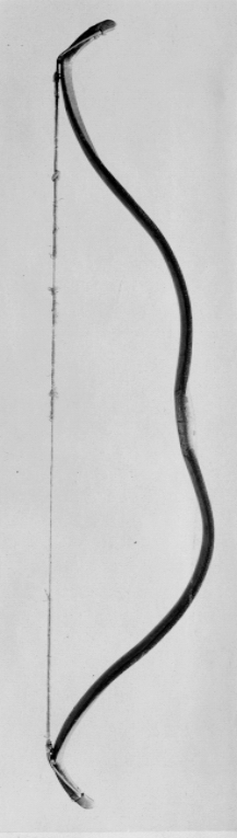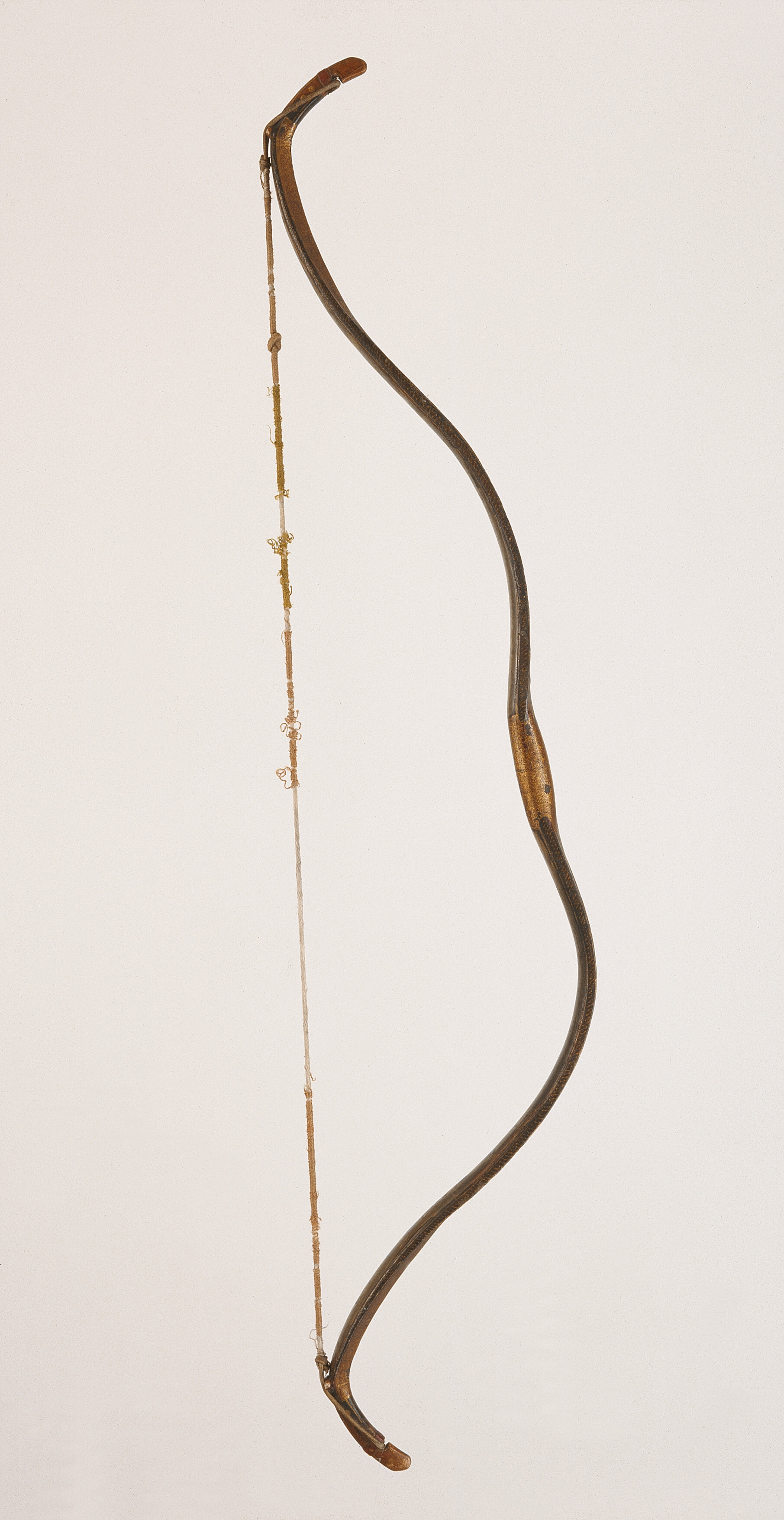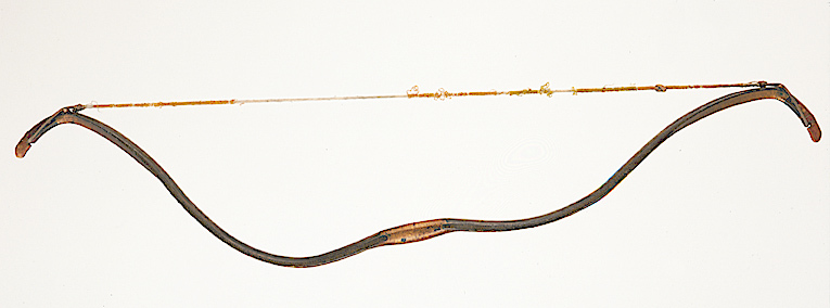 Sammansatt båge med buk av horn och rygg av läder och senor. Ryggen har förhöjda sidor. Runt handtag av läder. Två stränghållare av horn, kring öronen lindad röd remsa av läder. Dekor i form av lackmålningar i svart med guldbårder. På skuldrorna rött lack med guldstänk liksom på handlaget. Tillbehör: Bågsträngen lindad med gult och grönt silke.