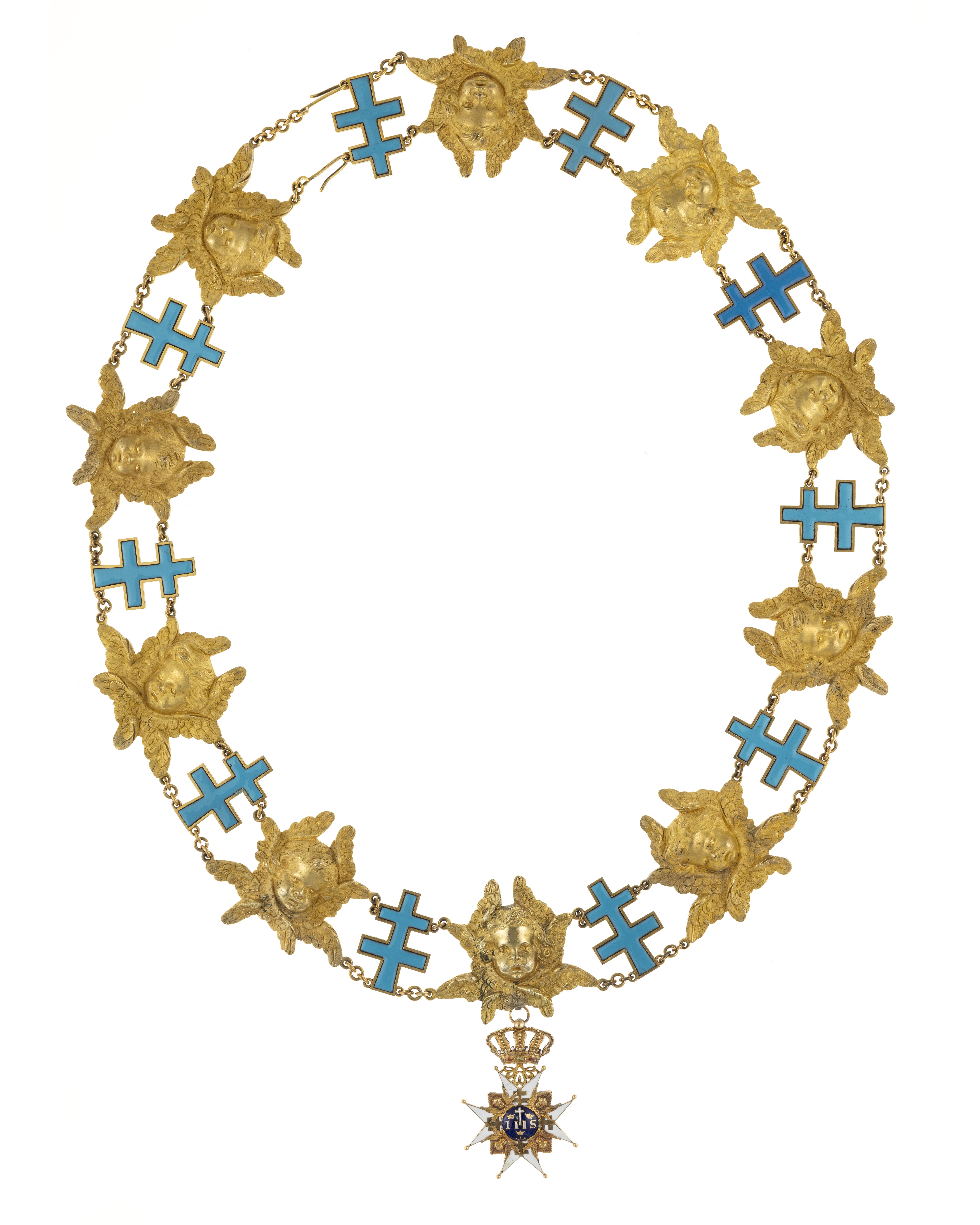 Vitemaljerat malteserkors av förgyllt silver, kulor på spetsarna, på korsarmarna förgyllda patriarkkors. Välvd medaljong täckt med mörkblå emalj, däri av guld och vit emalj I H S samt latinskt kors, av guld tre kronor och tre spikar. Frånsidans medaljong välvd och täckt med mörkblå emalj, däri guldbokstäver: F R S. Mellan och delvis på korsarmarna samt något upp på medaljongen förgyllda serafer. Mellan den övre korsarmens spetsar ett förgyllt bladverk, däri fäst med scharner en kunglig krona av guld samt vit, röd och grön emalj, igenom äpplet draget en ring, däri fäst en spiralformig ring, i vilken en droppformig, öppen bandring är fäst.