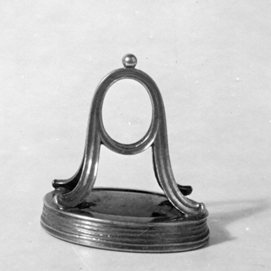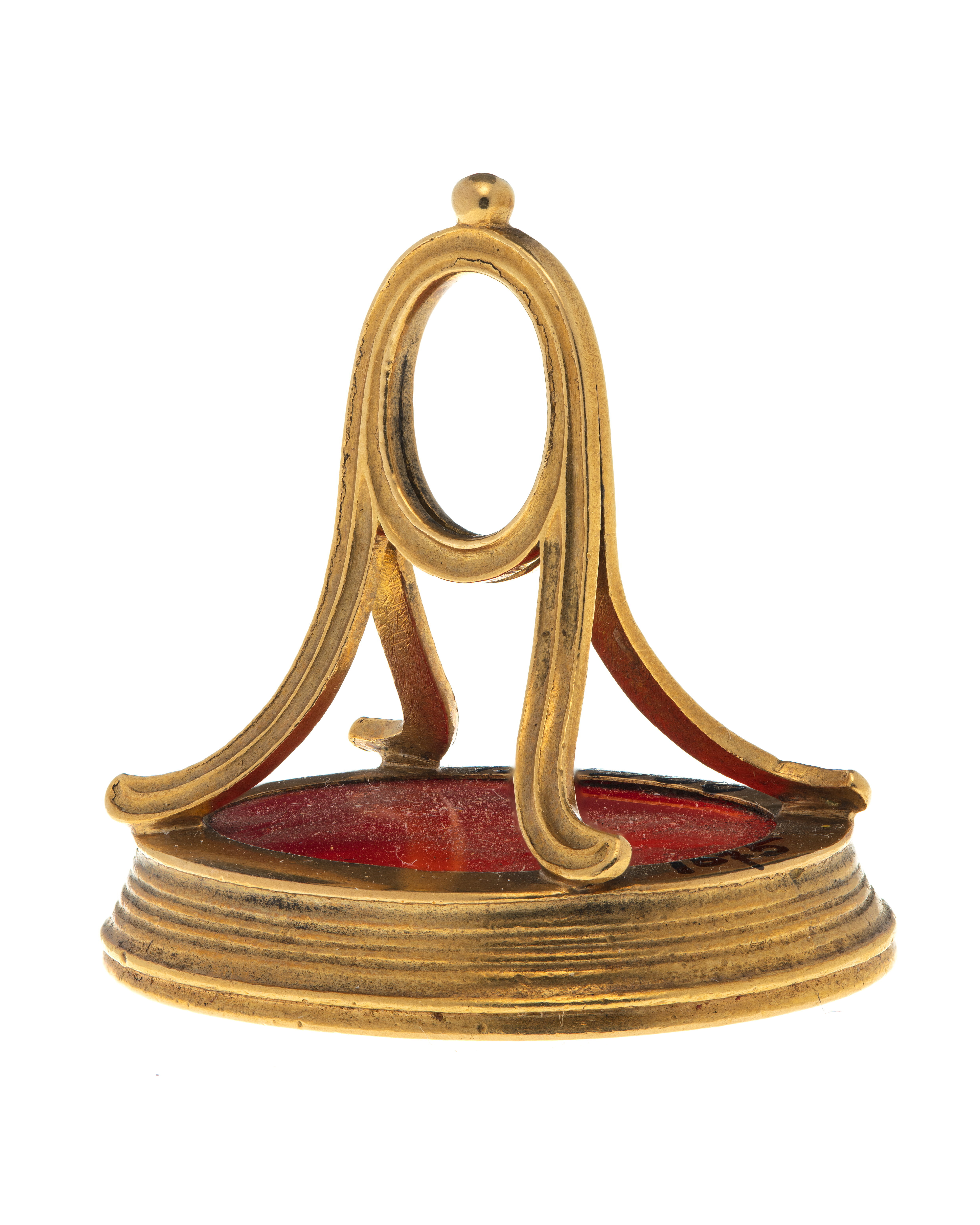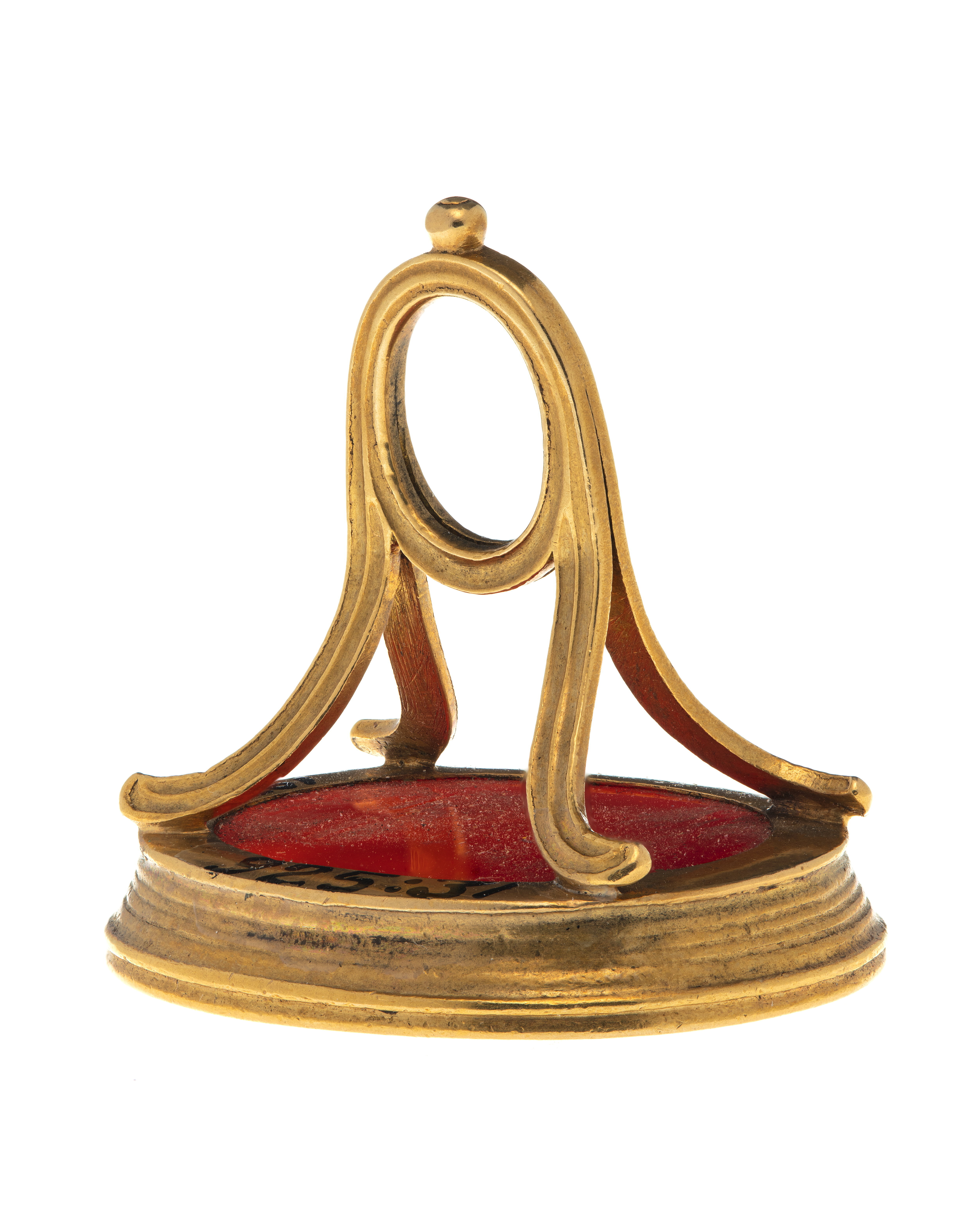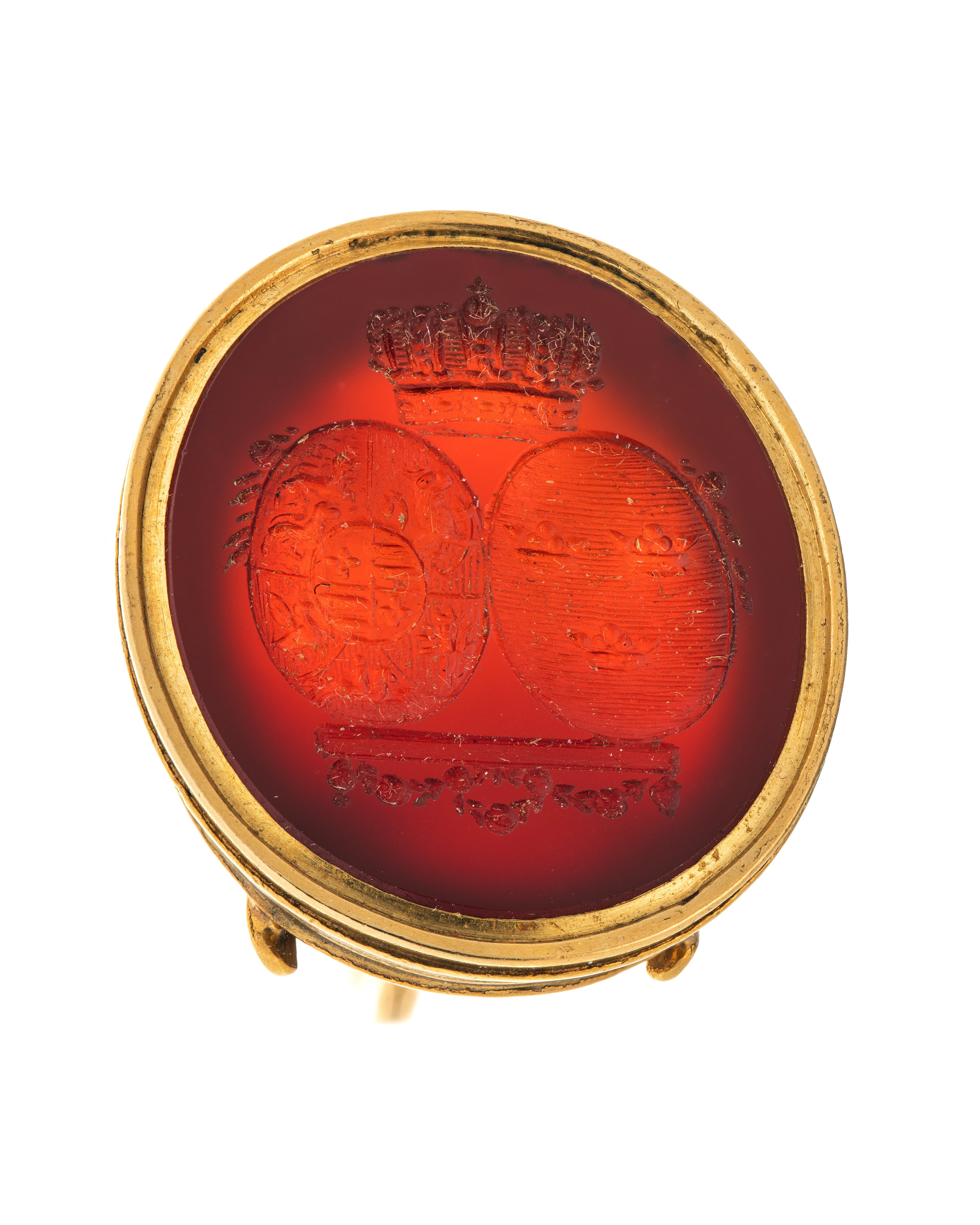Oval karneol, graverat alliansvapen, krönt av kunglig krona, ovala sköldar, till v Oldenburgs vapen, till h tre kronor. Sköldarna står på enkel konsol med nedhängande blomsterfestonger. Kistfattning á jour av guld, enkelt bygelformigt skaft övergående upptill i oval ring.