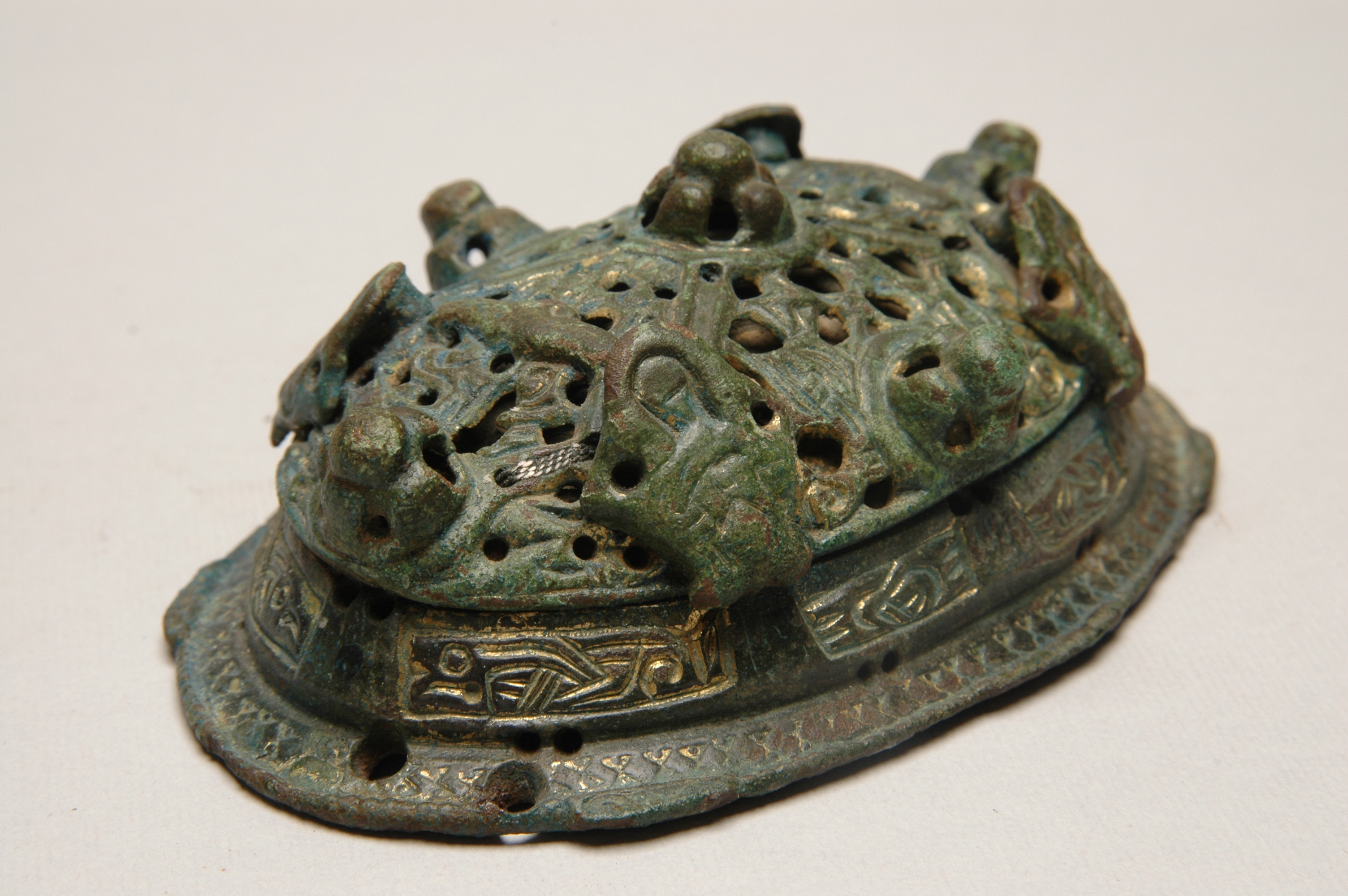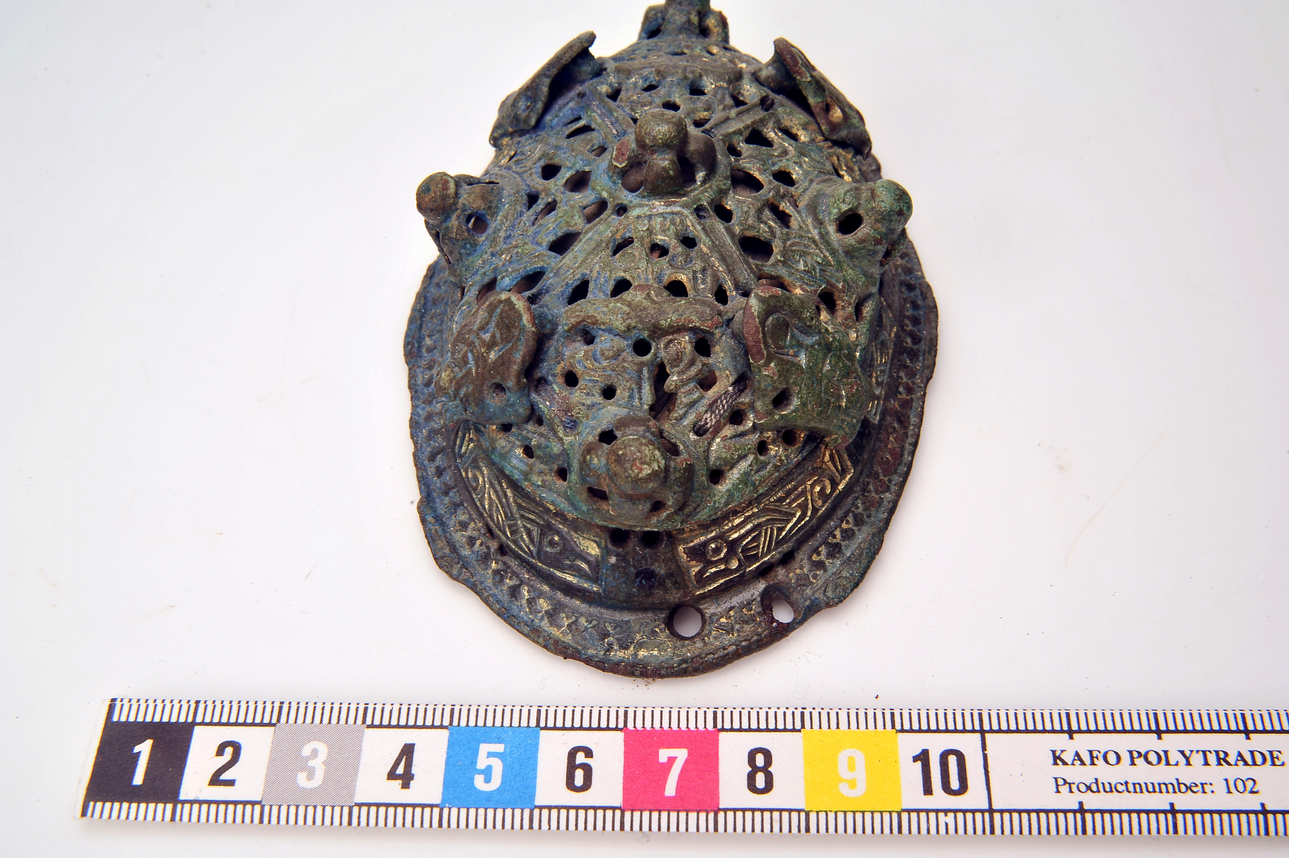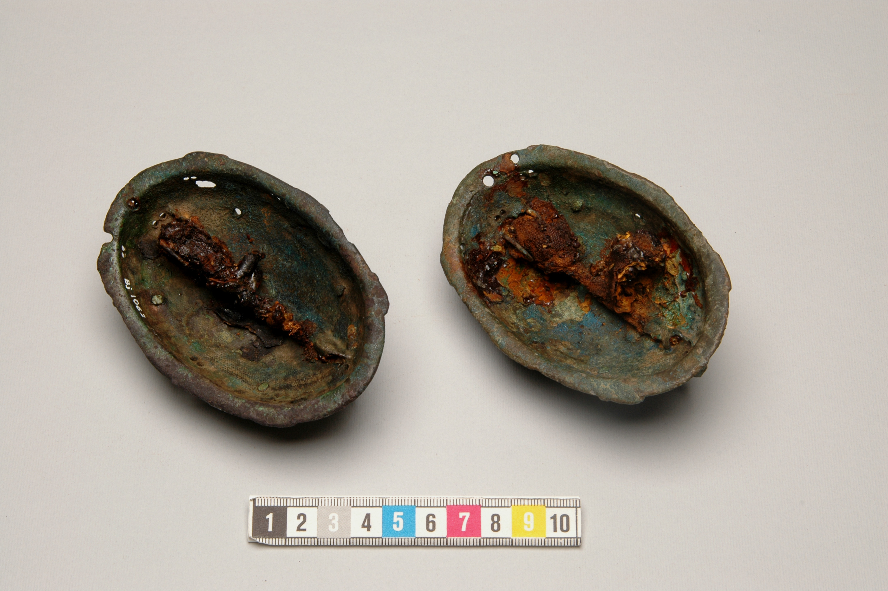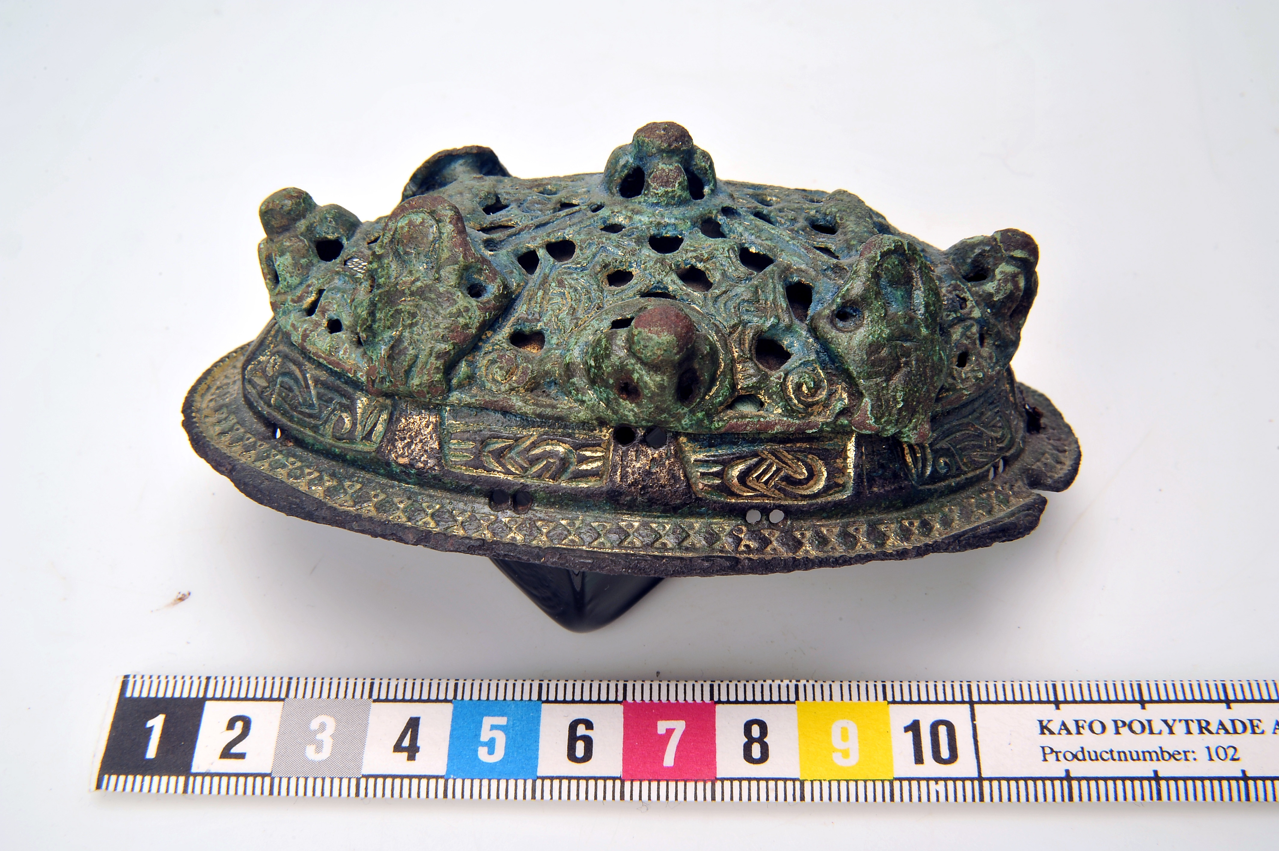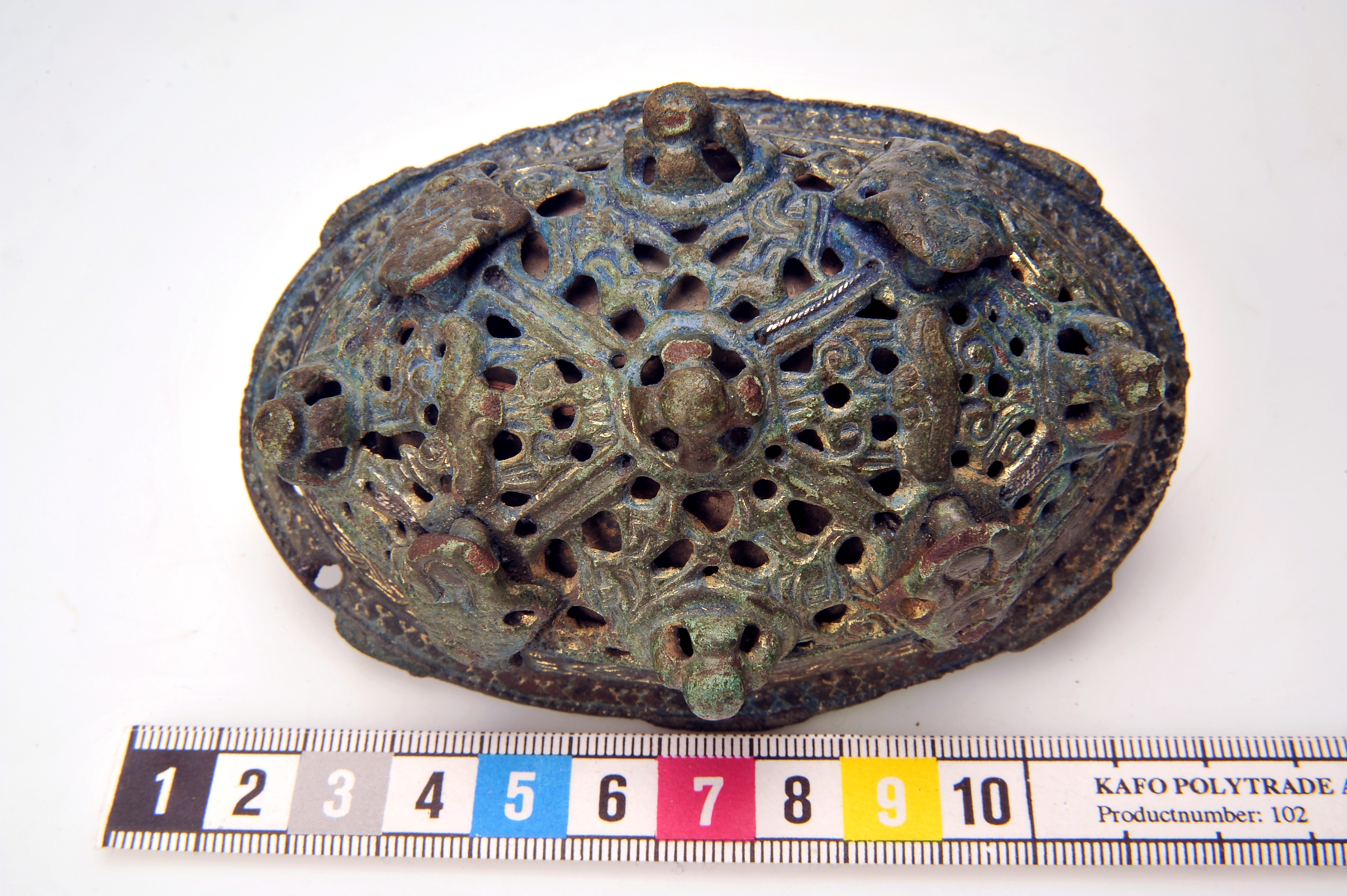 2 ovala spänbucklor av P51-typ med osedvanligt plastisk dekor. Över- och underskållorna hålls samman av gjutna bronselement.