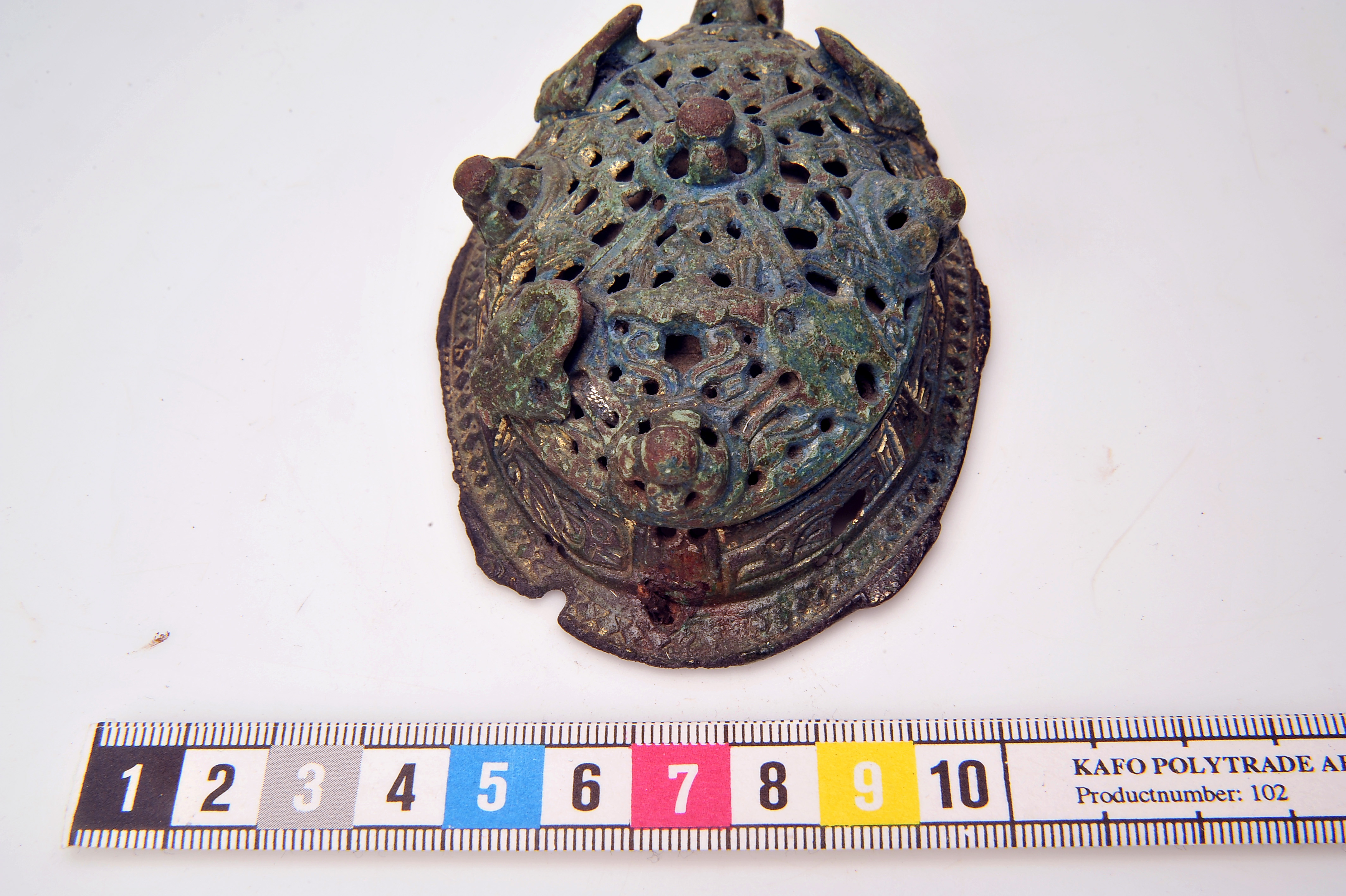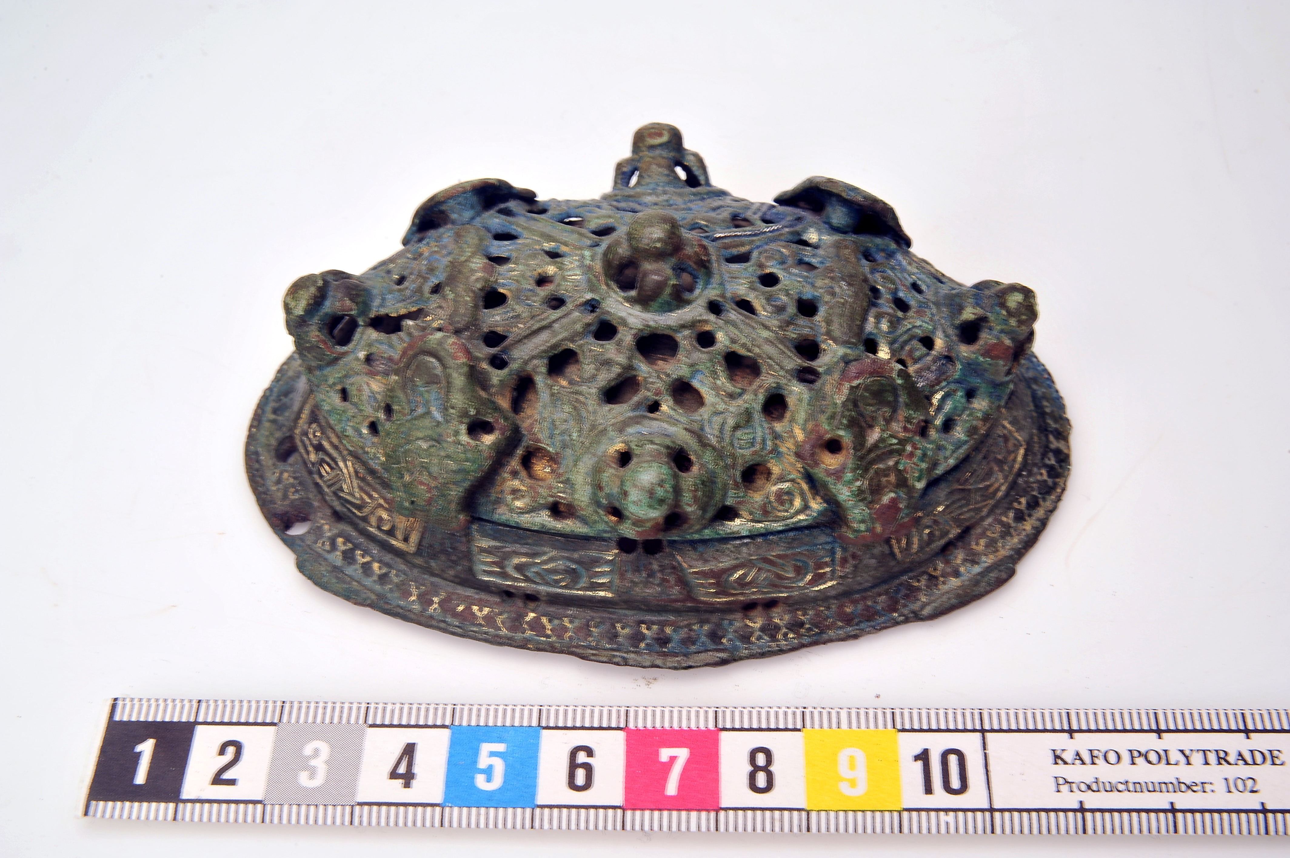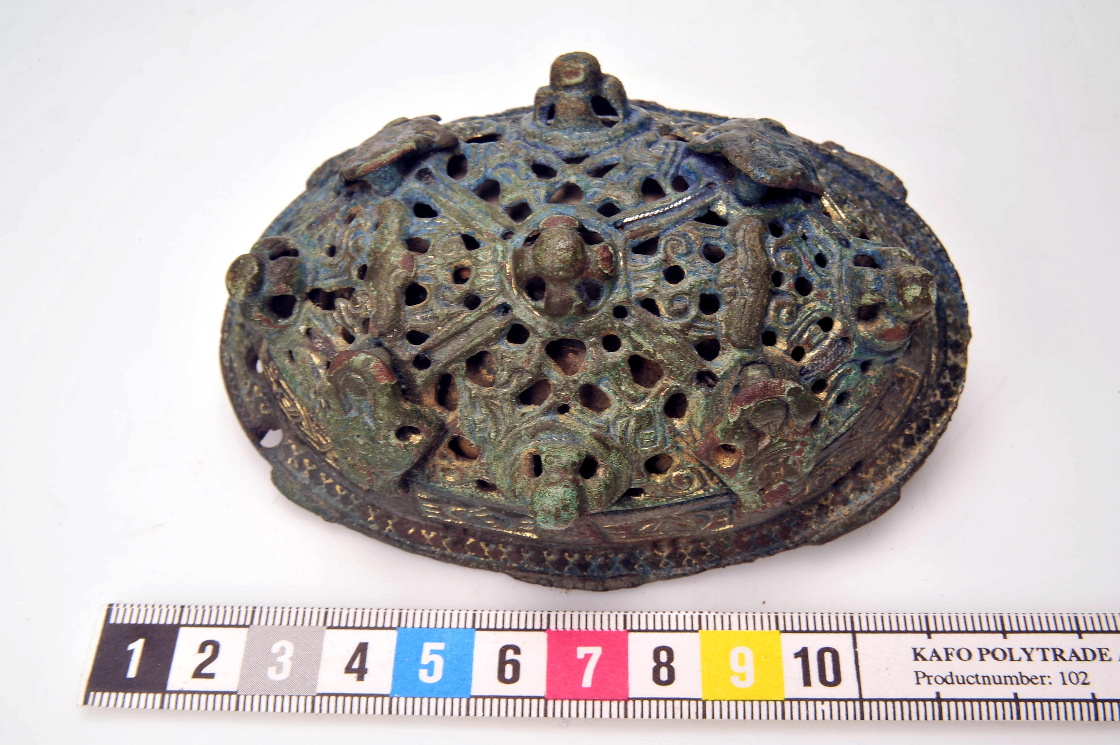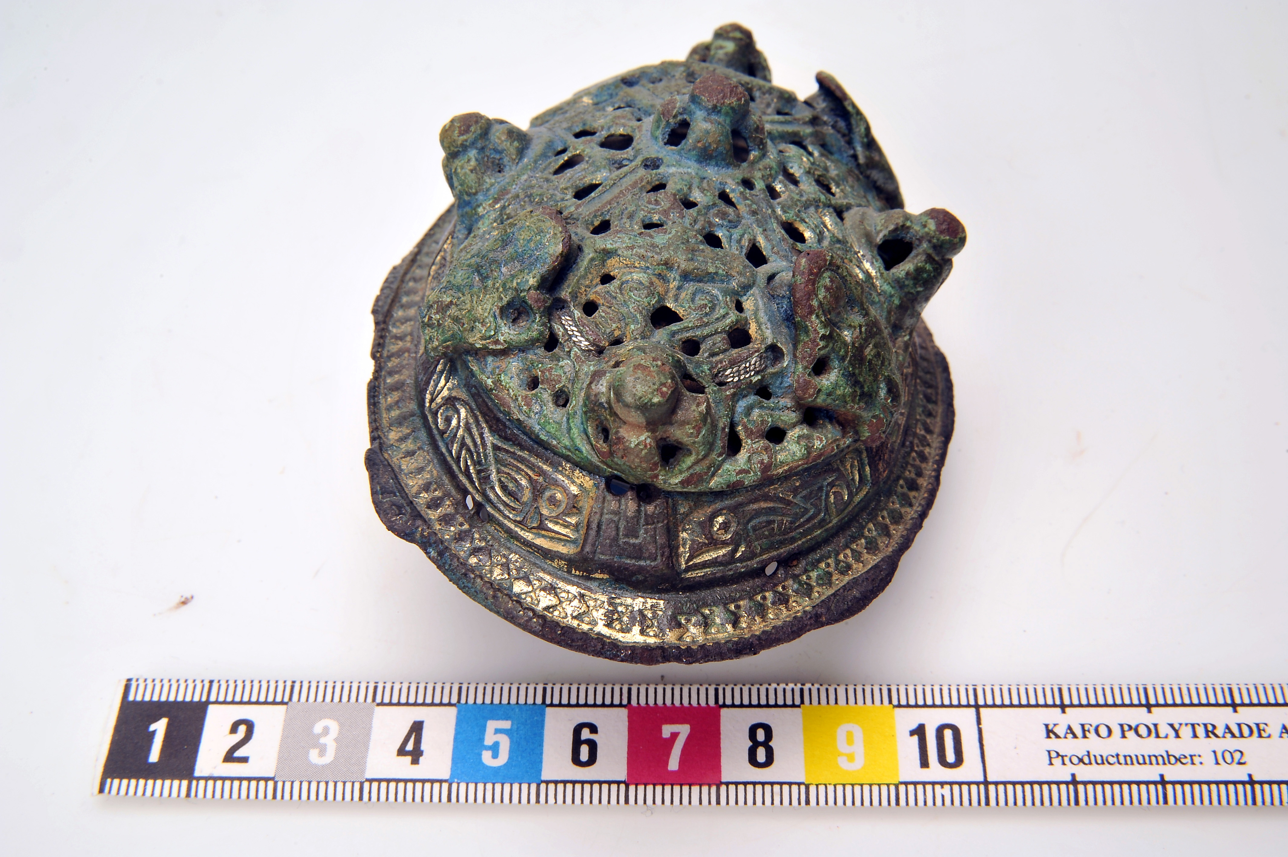 2 ovala spänbucklor av P51-typ med osedvanligt plastisk dekor. Över- och underskållorna hålls samman av gjutna bronselement.