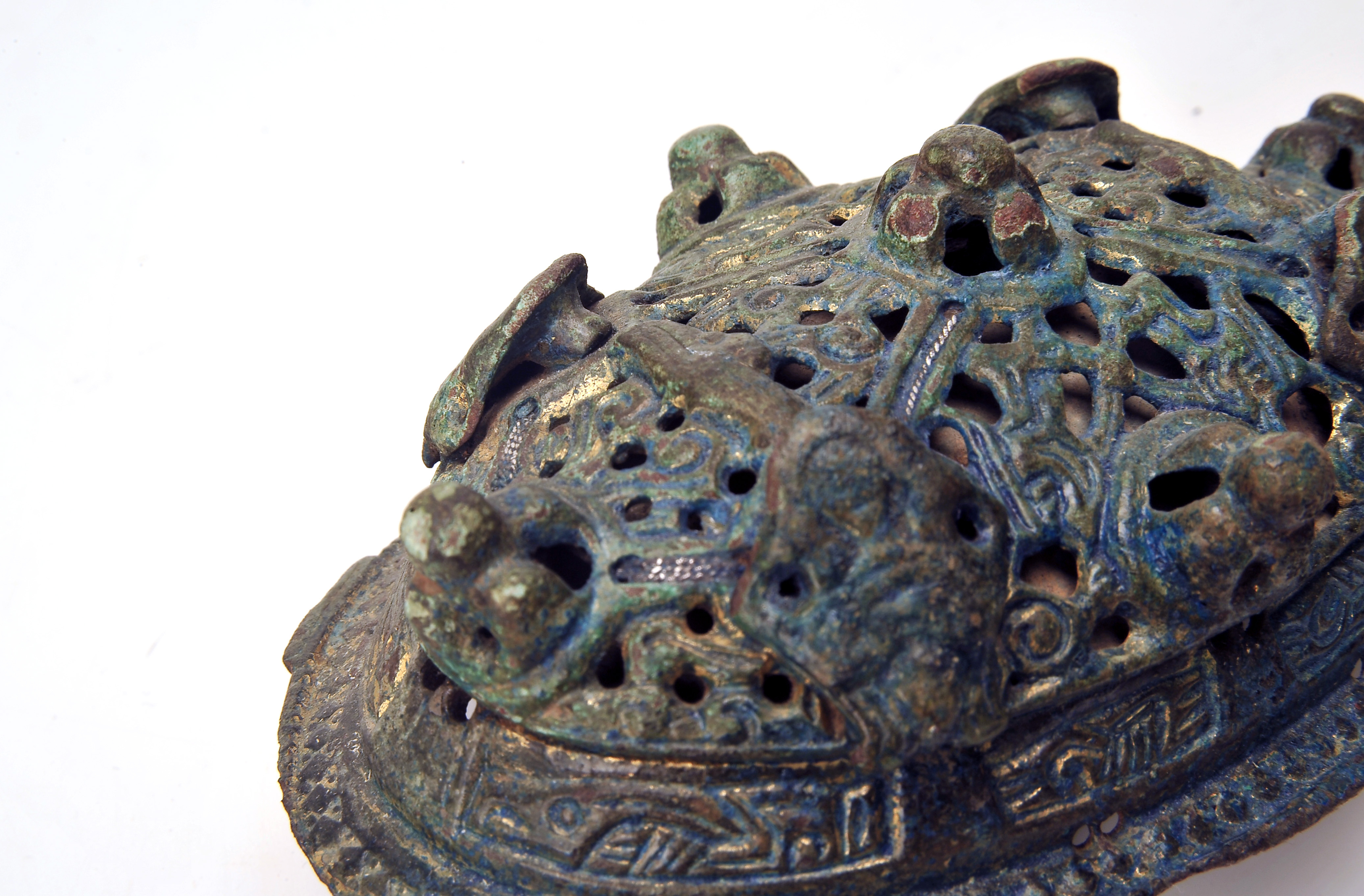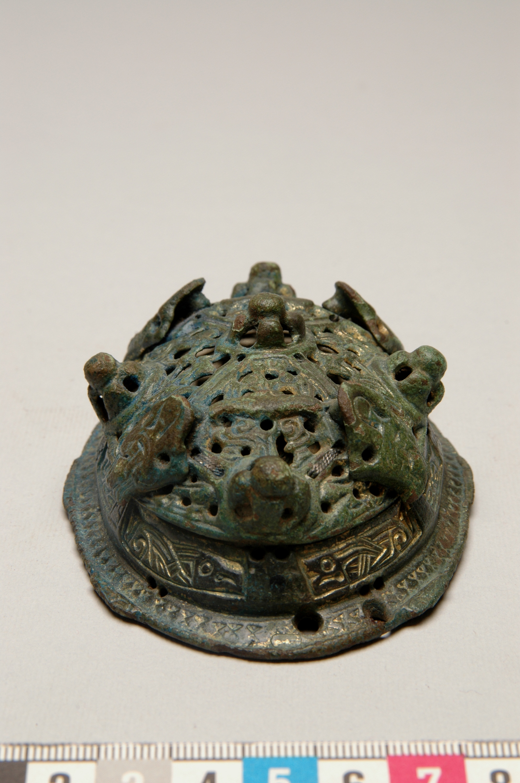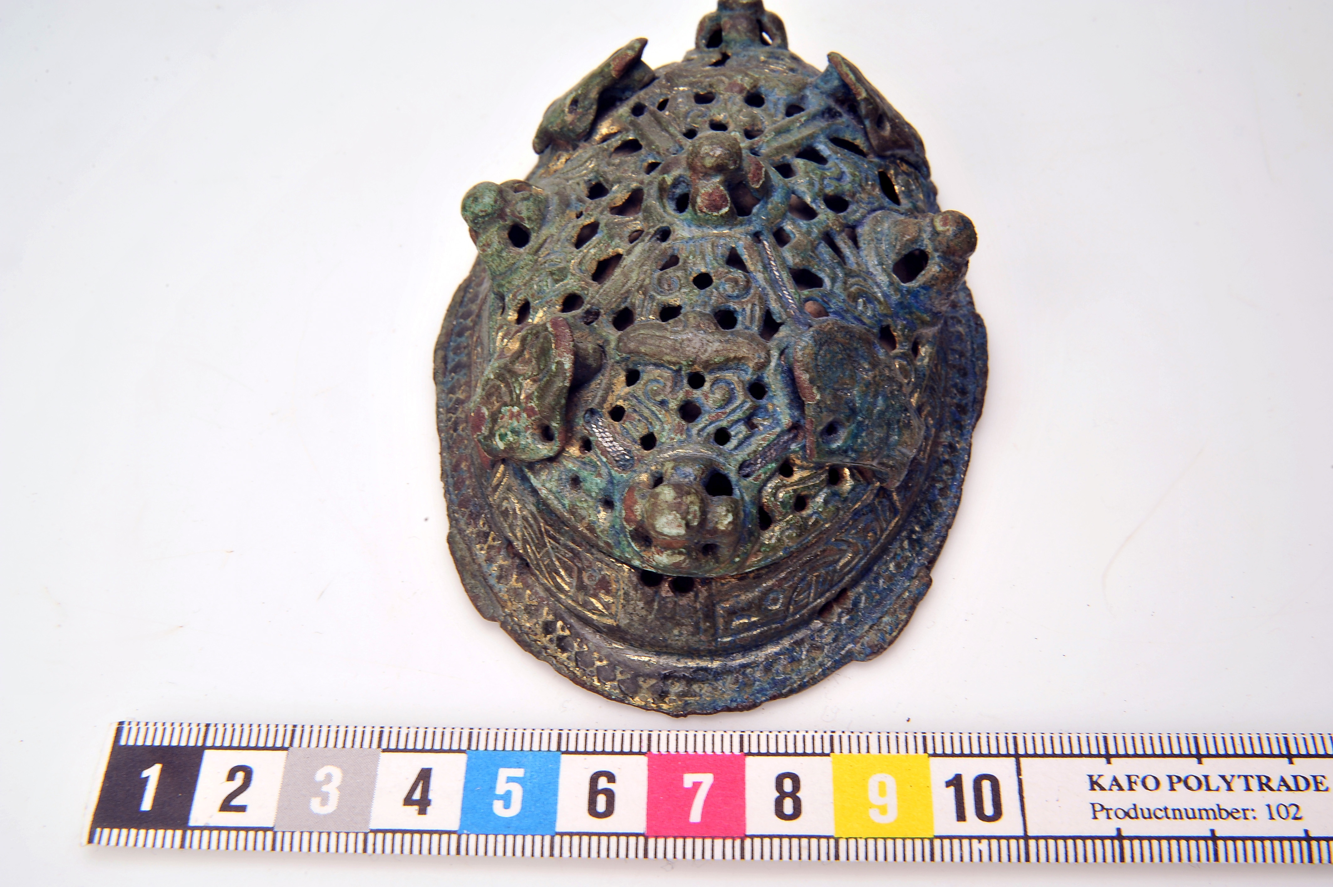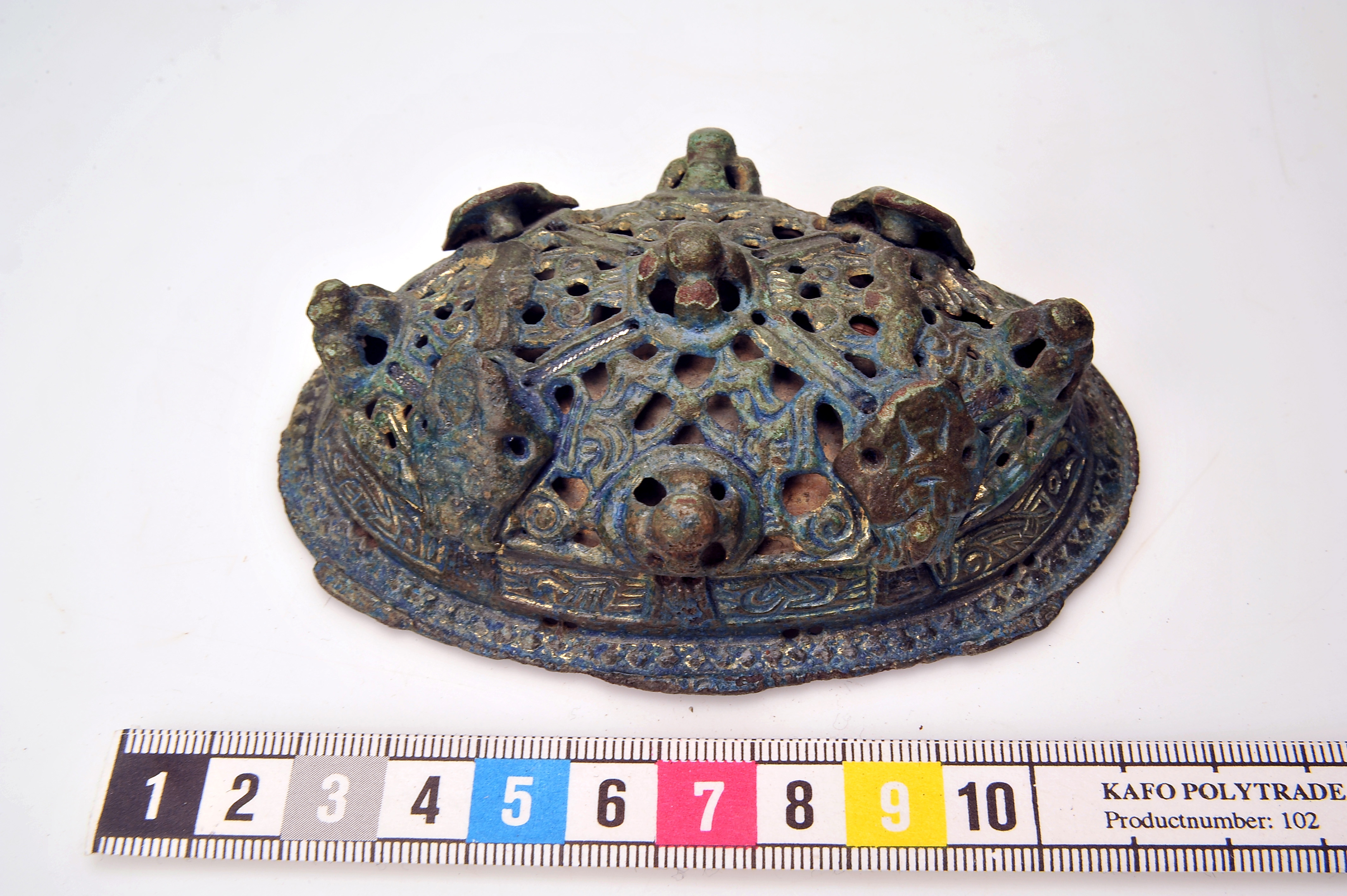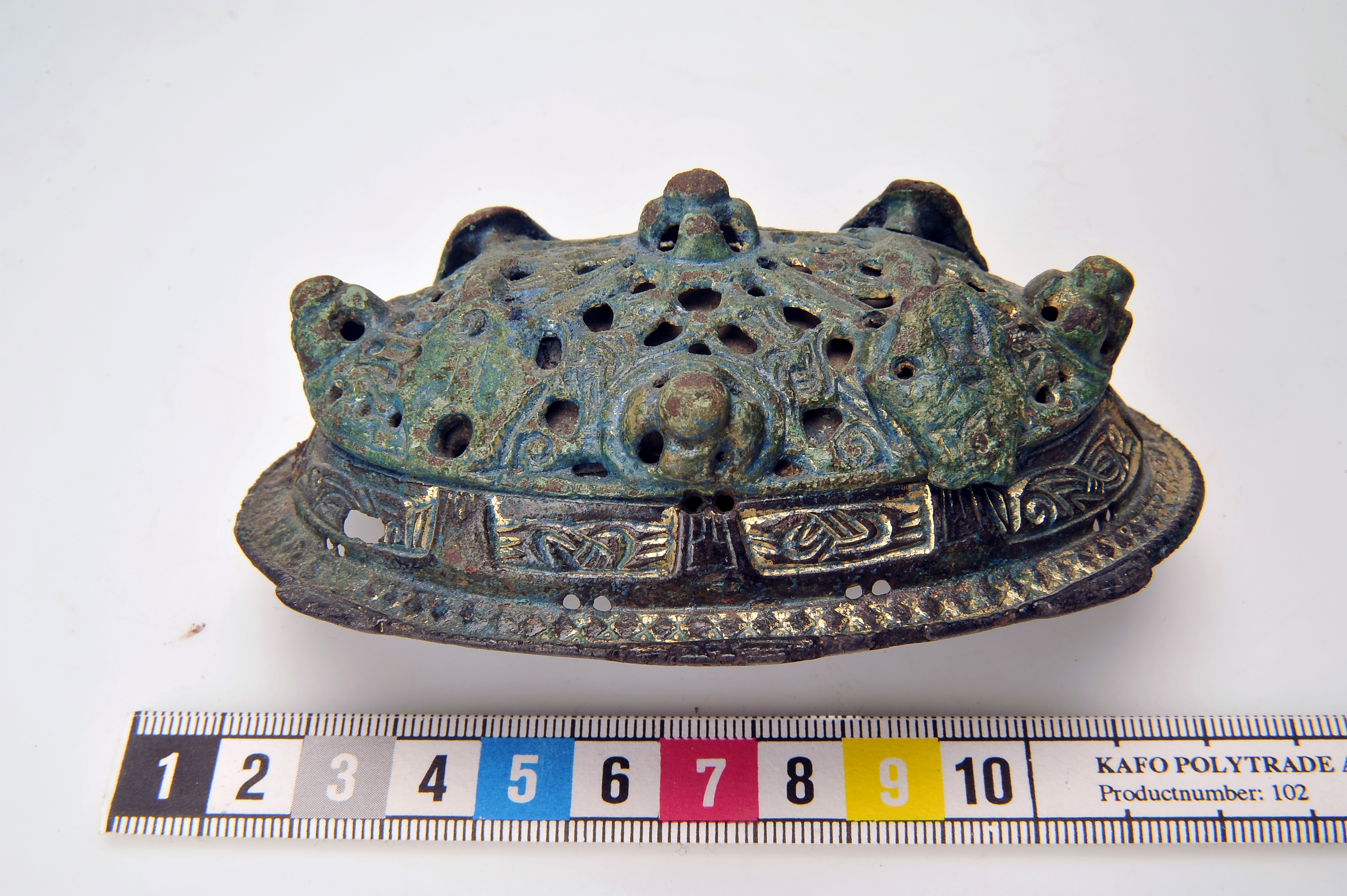 2 ovala spänbucklor av P51-typ med osedvanligt plastisk dekor. Över- och underskållorna hålls samman av gjutna bronselement.
