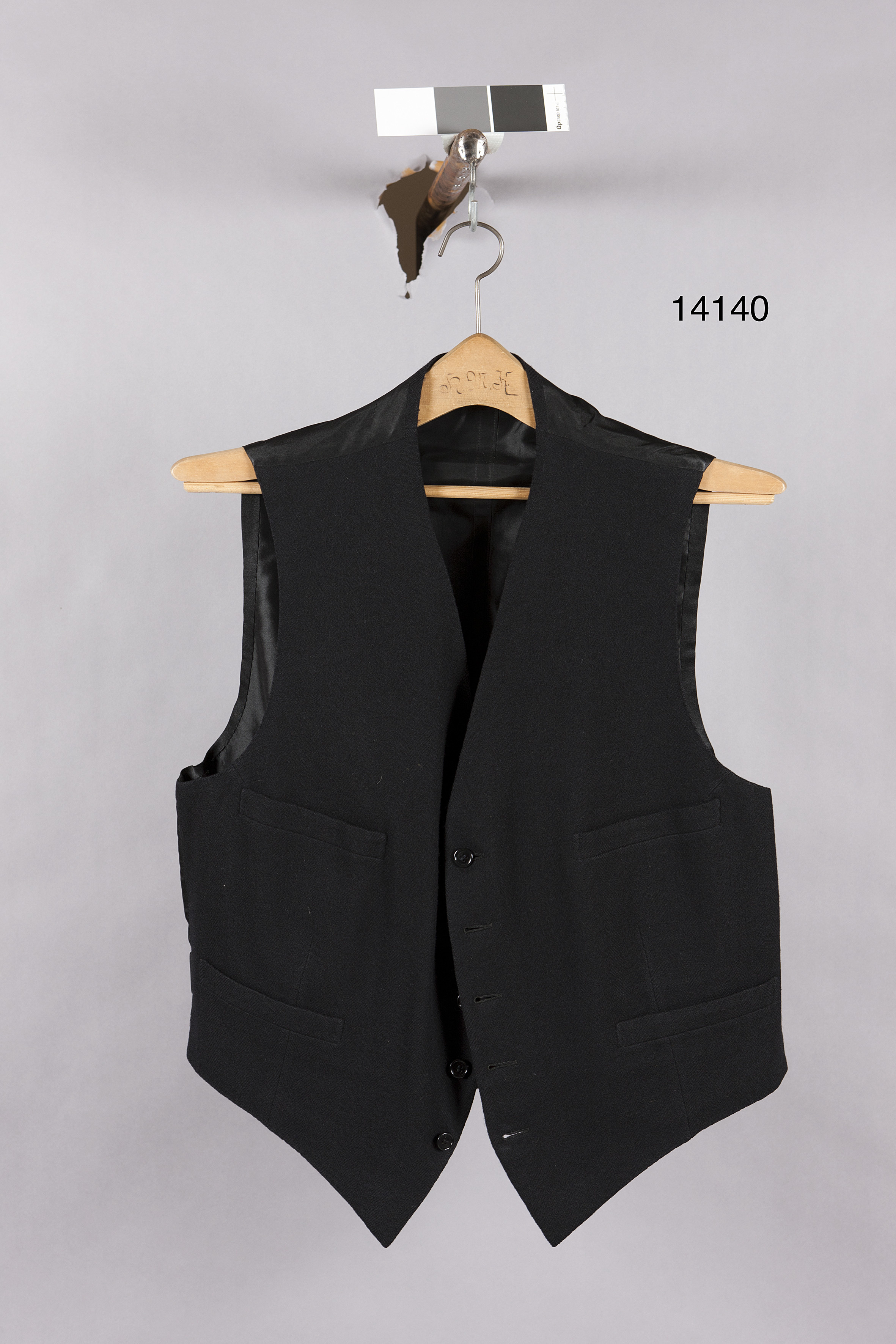 Väst till jackett med framstycken av svart ylle, fiskbensmönstrat. Enkelknäppning med fem svarta plastknappar, med diameter 14mm, på motsatt framstycke fem knapphål. På vardera sidan enbröstficka och en nedre ficka. I ryggen spänntampar med en svart metallsölja: "PRIMA". Ryggstycke av svart siden. Framstyckena med foder av svart siden. I fodret två öppna veck för extra vidd mitt på vardera framstycket, även i sidorna veck för mer vidd.