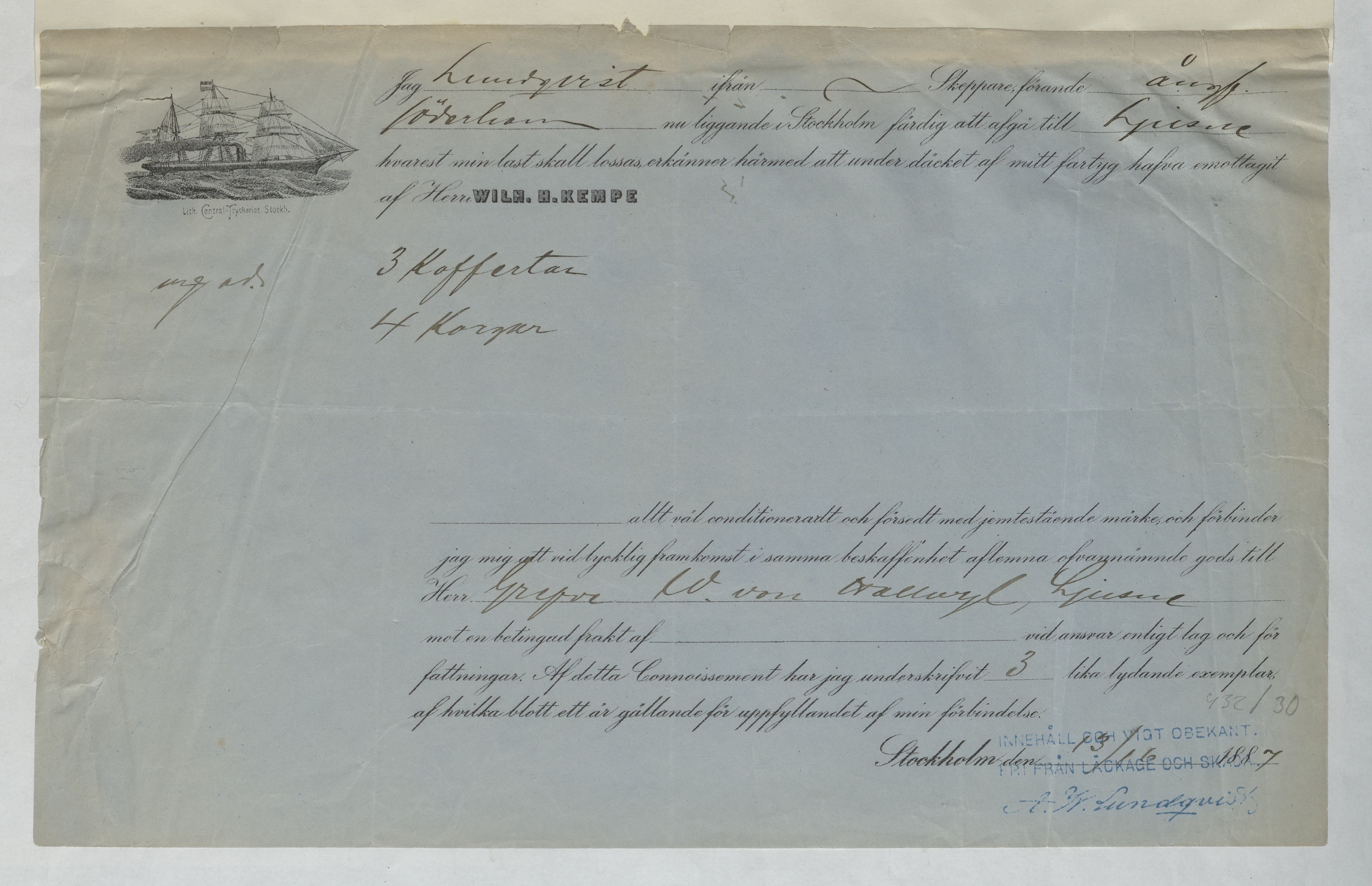 Verifikation från Firma Wilh. H. Kempe. Gällande frakt av 3 koffertar och 4 korgar till Ljusne.