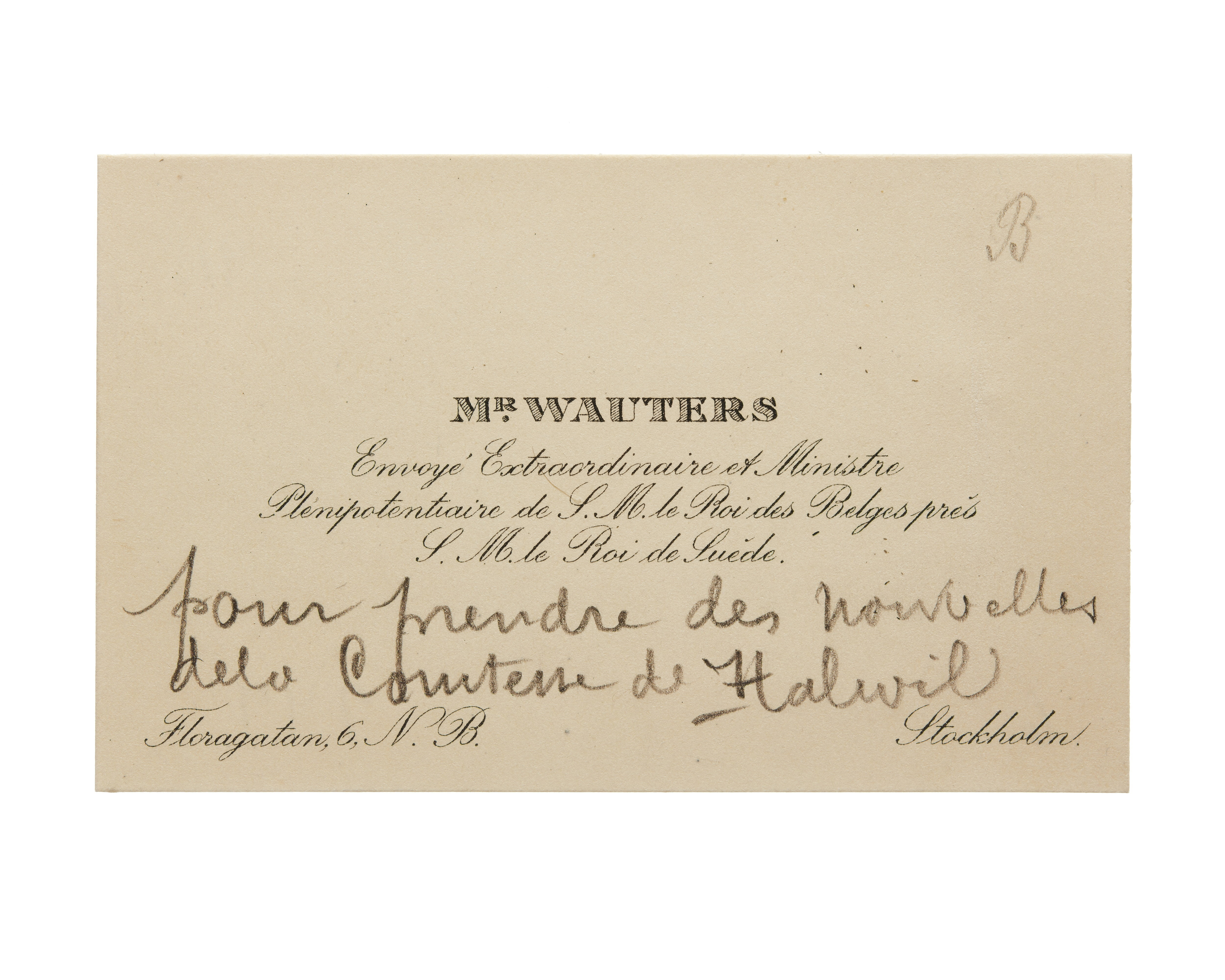 Åtta visitkort från Mr Wauters, Ministre de Belgique (vissa med beskrivningen Envoyé Extraordinaire et Ministre Plénipotentiaire de S.M.le Roi des Belges prés S.M.le Roi de Suède). Första kortet är utan datum, vikt i högra sidan. Andra kortet är utan datum, vikt i högra sidan. Tredje kortet är utan datum, vikt i högra sidan. Adress (nedre högra hörnet) Stockholm, (nedre vänstra hörnet) Floragatan 6, N. B. Fjärde kortet daterat 1914, vikt i högra sidan. Femte kortet daterat 1915, vikt i högra sidan. Handskrift "p. p. n". Överlämnat i samband med Wilhelminas bilolycka i 1915. Sjätte kortet daterat 1915, vikt i högra sidan. Handskrift "Pour prendre des nouvelles de la Comtesse de Halwil". Överlämnat i samband med Wilhelminas bilolycka i 1915. Sjunde kortet daterat 1916, vikt i högra sidan. Åttonde kortet daterat 1916, vikt i högra sidan.