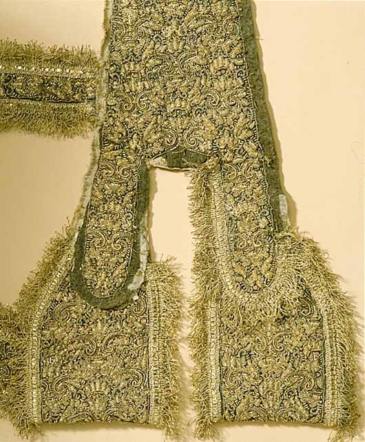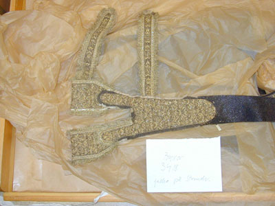 Gehänget representerar en relativt sällsynt typ av gehäng där endast det nedre partiet varit avsett att synas. Broderiet går nämligen endast upp till en höjd av 42,5 cm. Broderiet har samma mönster och rapport som de övriga plaggens. Den smala guldfransen som suttit ytterst i kanterna på remmarna och öglorna (där värjan stacks in) är delvis bortsprättad. Broderiet är utfört på mörkgrått läder som fortsätter i form av en avsmalnande rem, vars yttersta ände man t.o.m. varit tvungen att utöka med svart atlas. Den tygbeklädnad, som remmen förmodligen ursprungligen haft har tagits bort. Baksidan är fodrad med vit taft. På fodret på baksidan är gehänget med bläck märkt: N 41 (= nr i 1789-90 års inv.).