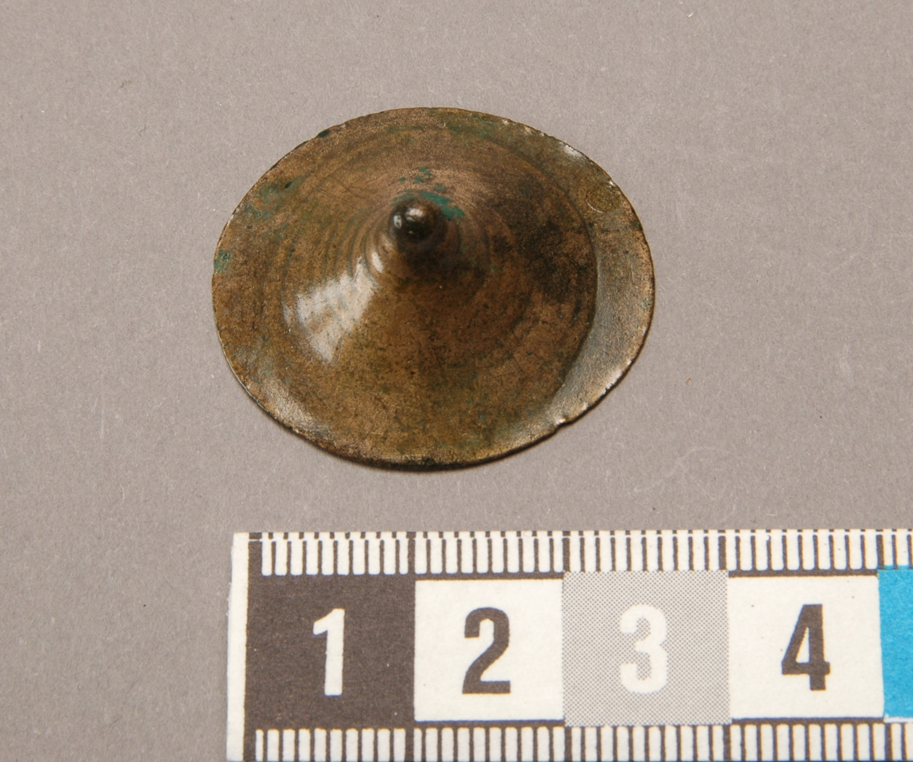Tutulus av brons med låg flat topp, utan stång. På baksidan har den en tvärslå.