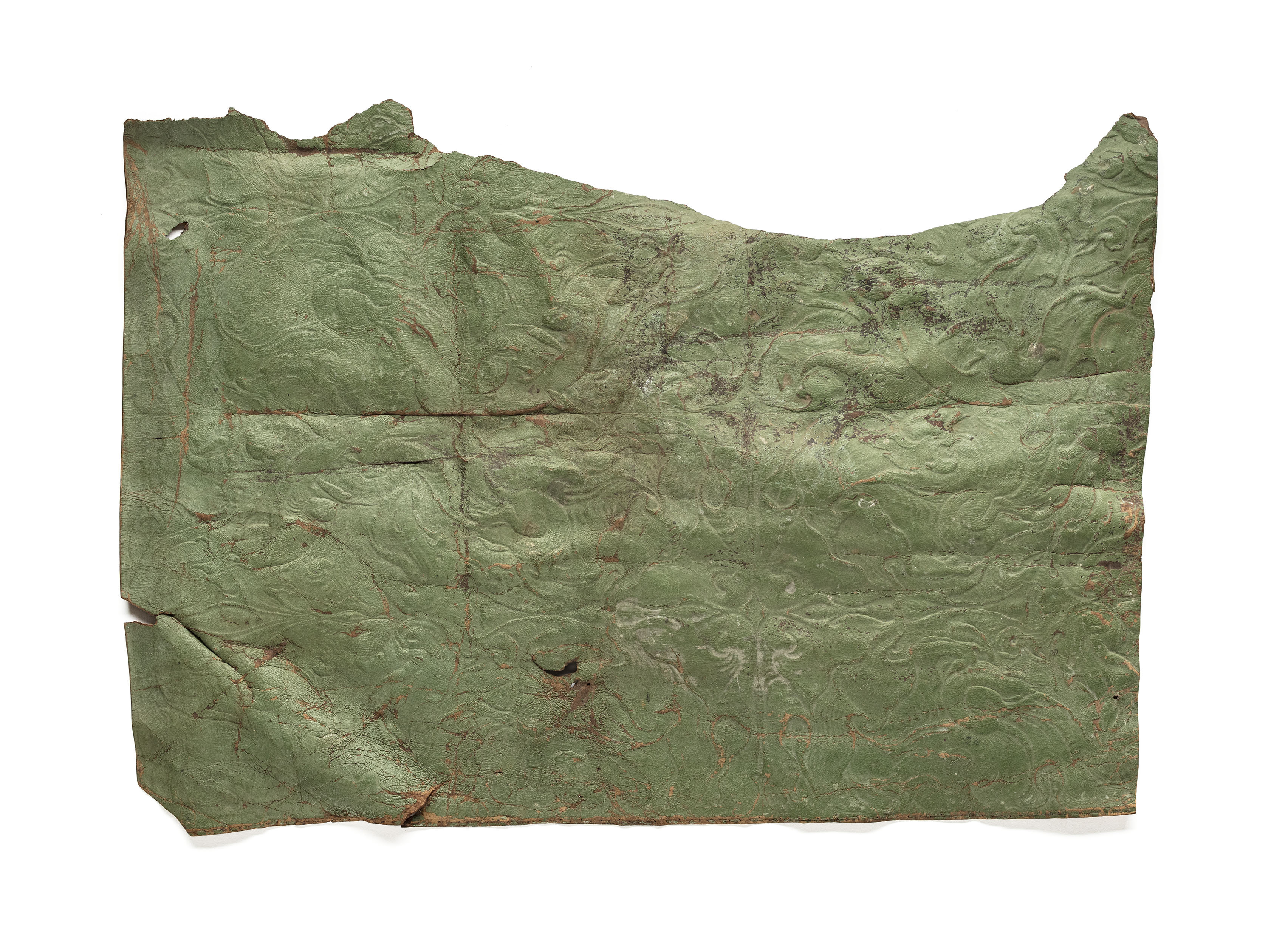 Två stycken gyllenlädersfragment med pressat mönster av broskornament i grönt.