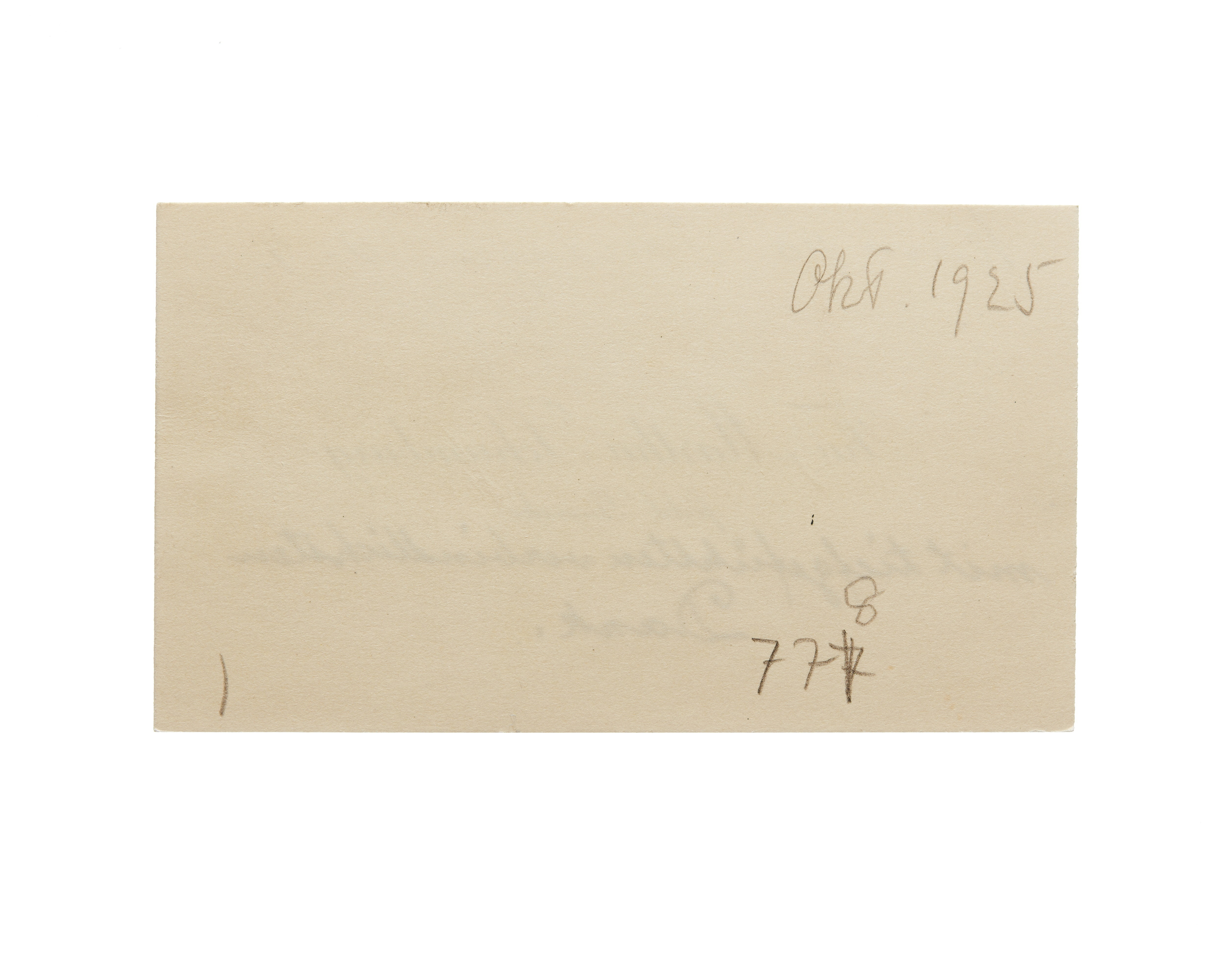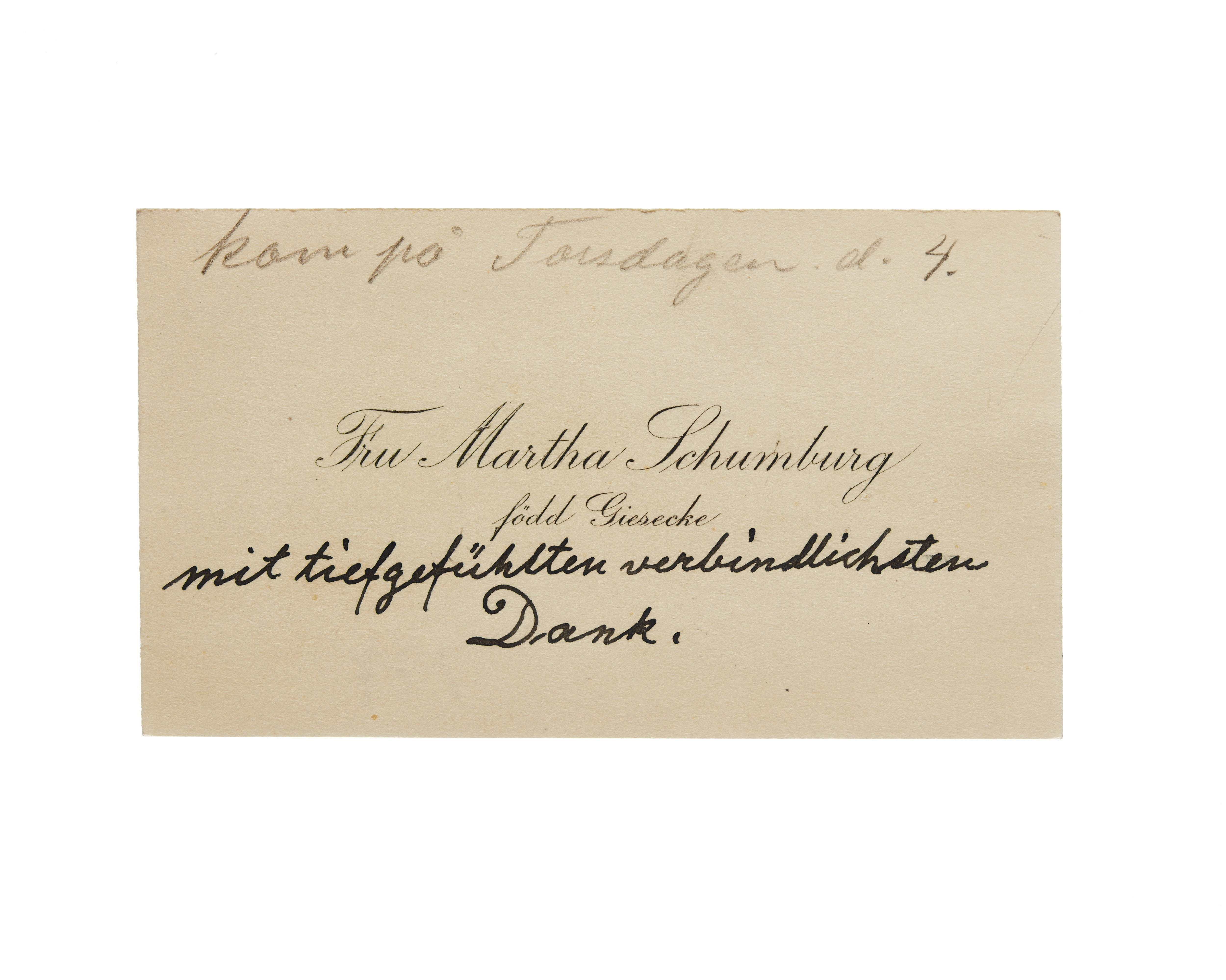 Ett visitkort från Fru Martha Schumburg, f. Giesecke, daterat 1925. Handskrift på tyska "mit tiefgefühlten verbindlichsten Dank.".
