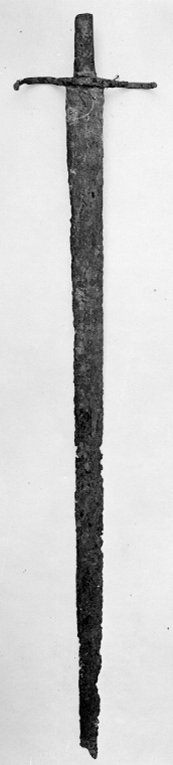 Vapnet i sin helhet med mörkbrun ytbeläggning (över gravrostskadorna) . Av stålfästet återstår endast parerstängerna, båda bågformigt böjda åt samma håll i horisontalplanet. Krysset mellan parerstängerna löst påträtt den flata tången, vars överdel är tvärt avbruten (förkommen). Klinga rak, tvåeggad, på båda sidor med längsgående, mindre tydliga räfflor. Svårt rostskadad, i synnerhet vid spetspartiet.