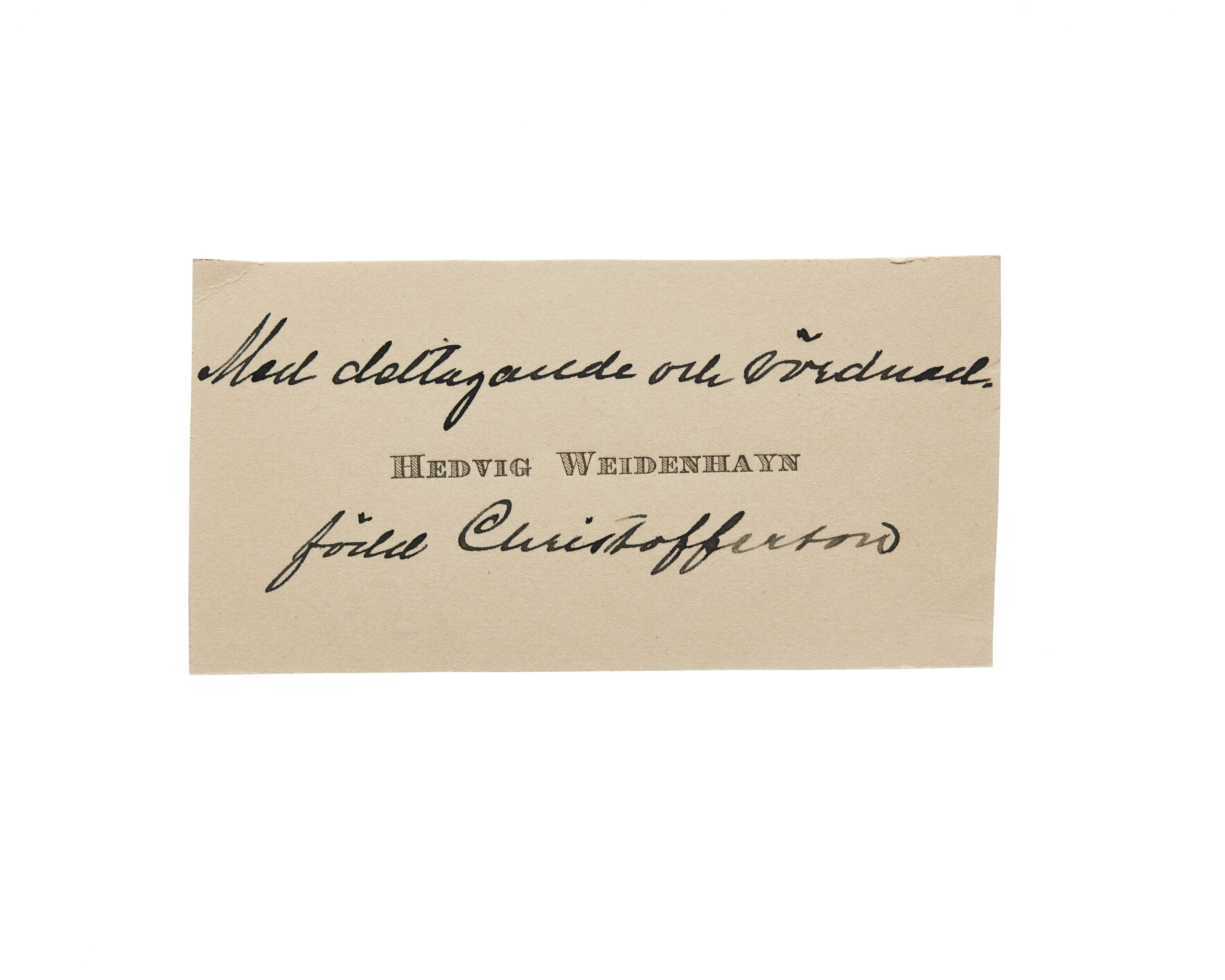 Ett visitkort från Hedvig Weidenhayn, f. Christofferson, daterat 1921. Handskrift "Med deltagande och vördnad" samt "född Christofferson".