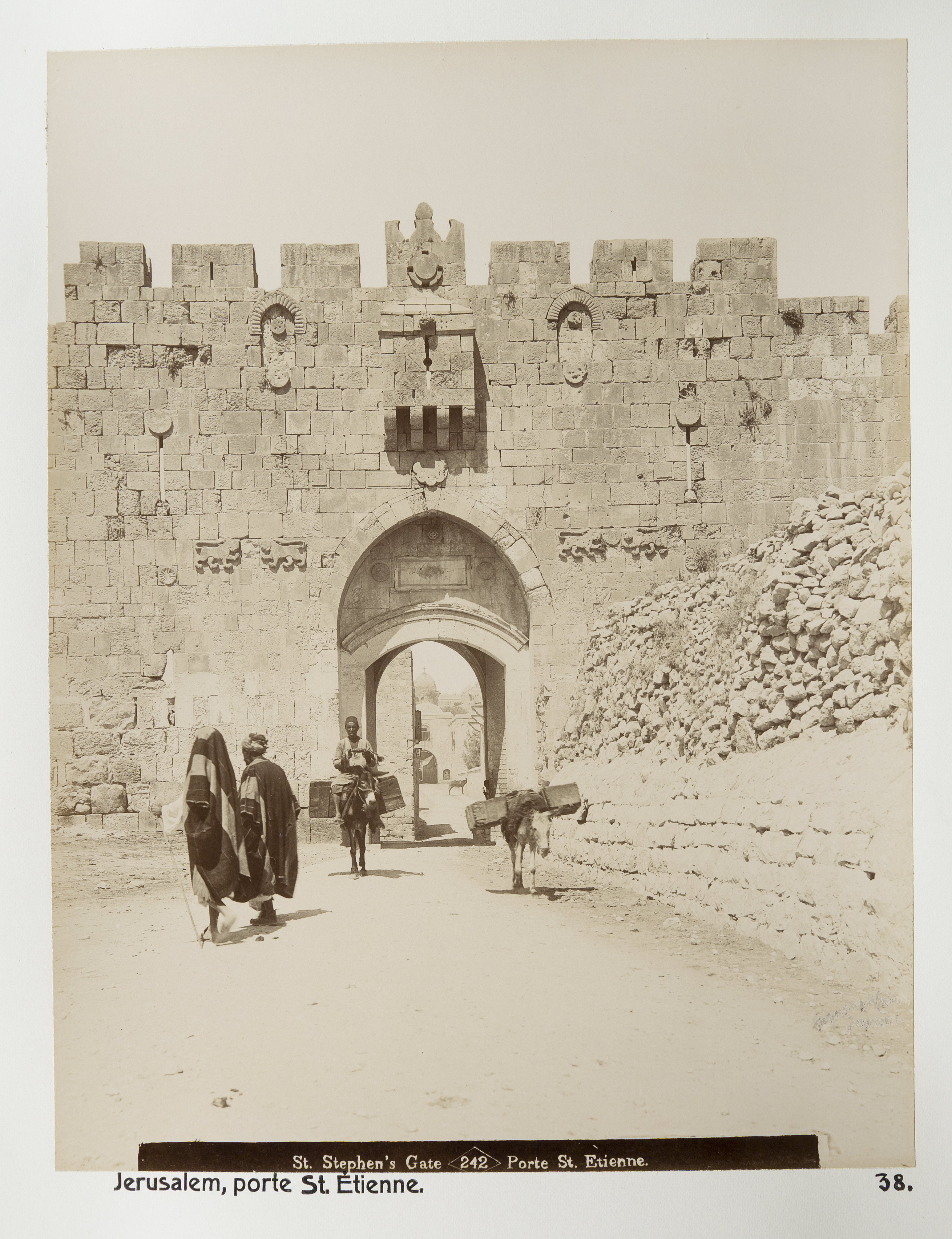 Lejonporten i Jerusalem. Text på originalet: "St. Stephen's Gate/Porte St. Ètienne". Fotografierna LXVI:N.01.-180. kommer från resan till Palestina och Syrien som Wilhelmina och Walther von Hallwyl gjorde den 30 mars-27 april 1901. De lämnade Sverige den 5 november 1900 för Egypten, där de stannade till den 28 mars 1901, då de fortsatte till Palestina. Med på resan var Wilhelminas sällskapsdam, fröken Ida Uhse. Den 27 april fortsatte de till Turkiet och Mindre Asien. De mindre fotografierna (utom de från Samos) LXVI:N.90.-100. är tagna av Wilhelmina själv, under en resa till häst från Jerusalem till Damaskus 8-20 april 1901. Övriga fotografier är inköpta av Wilhelmina i Jerusalem, Damaskus och Beirut. Alla uppgifter kommer från Ida Uhses reseanteckningar.