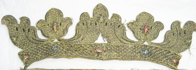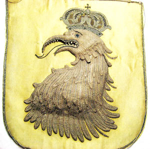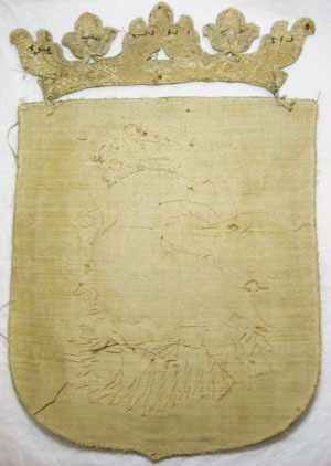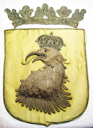 Vapensköld av gul sidenatlas kantad av en bård bestående av en snodd av silverlan och silvertråd virade runtom en silkeskärna samt av en tvinnad silvertråd och ytterst av ett smalt vävt band av vit silkestråd och silvertråd utdragen i små öglor. Mitt på skölden ett applikationsbroderi i hög relief föreställande ett griphuvud, krönt av en sluten krona broderad direkt på sidenatlasen. Griphuvudet är huvudsakligen broderat i läggsöm med silvertråd, röd blekt silkestråd och veckade silverlan. På halsen har fjädrarna markerats av flikar, kantade med smala snören av silvertråd och brun silkestråd. Gripen har ett öppet gap kantat av en snodd av silverlan, silvertråd och brun silkestråd runtom en silkeskärna samt av ett smalt snöre av silvertråd och brun silkestråd. På insidan av gapet är broderat med blekt röd silkestråd. Gripen har 14 vassa tänder av ben samt en utsträckt tunga av svart snodd av svart silkestråd och silvertråd runtom en silkeskärna. Ögat är av svart silkestråd samt av en svart pärla, markerat av två rader av kantilj av silvertråd och med ett ögonbryn av svart silkestråd och silvertråd. Gripen kröns av en sluten krona med fem stiliserade byglar. Kronan är broderad med silvertråd och silverlan, med byglarna kantade av små prickar av kantiljer av silvertråd samt med tre små prickar av kantiljer av silvertråd på kronringen. Kronan kröns av ett kors av kantiljer av silvertråd stående på en glob av silvertråd. Mellan byglarna är ifyllt med svart silkestråd. Skölden kröns av en öppen krona, påsydd i två hörn. Kronan av silvertråd med spår av förgyllning. Den har en 30 mm bred kronring kantad av snodd av silvertråd och silverlan virade runtom silkeskärna samt av ett smalt vävt band av vit silkestråd och silvertråd utdragen i små öglor. Kronringen är broderad i plattsöm av silvertråd med spår av förgyllning i ett schackliknande mönster, kallat gaufrure. På kronringen är broderat fem stenimiterande ovaler av silverlan kring vilka virats blå respektive röd silkestråd. Runtom dessa sitter små prickar av kantiljer av silvertråd. Kronan har fem spetsar föreställande stiliserade blommor och blad. De är likaså broderade i plattsöm av silvertråd med spår av förgyllning, kantade av tvinnad silvertråd och med konturer av en smal snodd av silvertråd runtom silkeskärna. På vardera blomma och blad sitter omväxlande stående och liggande stenimiterande ovaler av silverlan omvirade av röd respektive grön silkestråd. Vapnet är fodrat med pålimmad beigefärgad linnelärft.