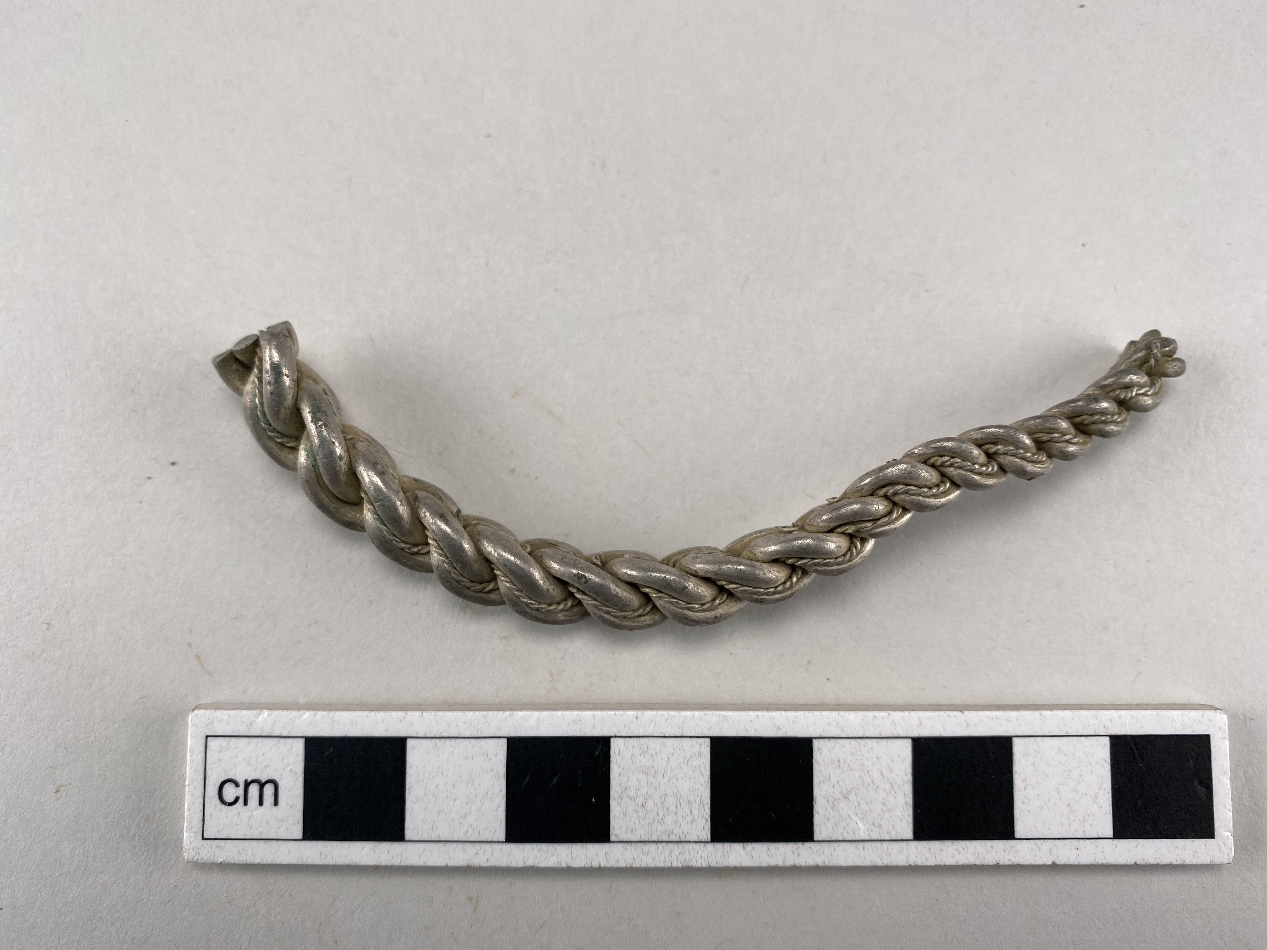 Fyra silvertenar som flätats ihop tillsammans med minst tre dekorativa trådar som vardera består av två snodda silvertrådar. Flera probermärken på tenarna.