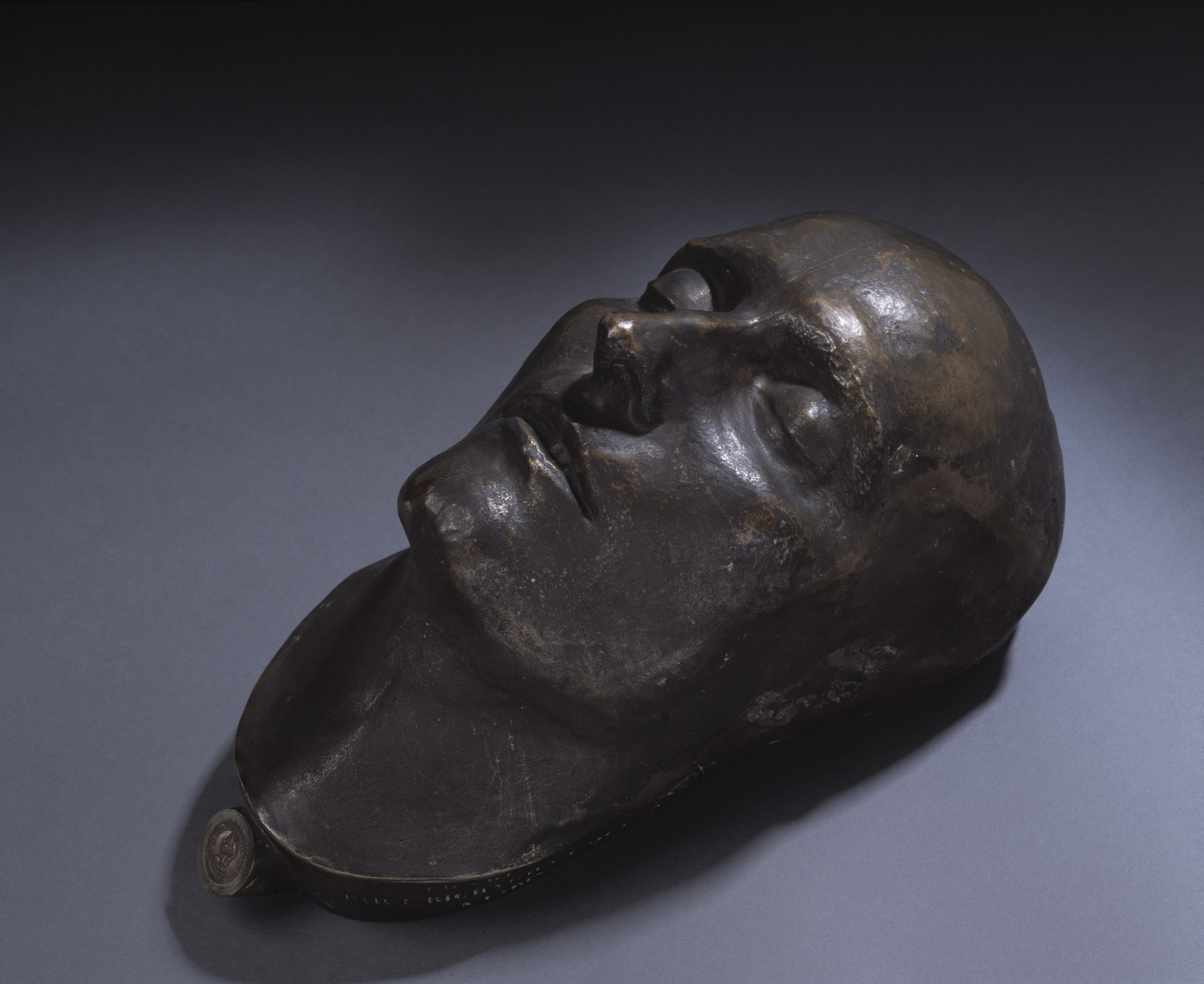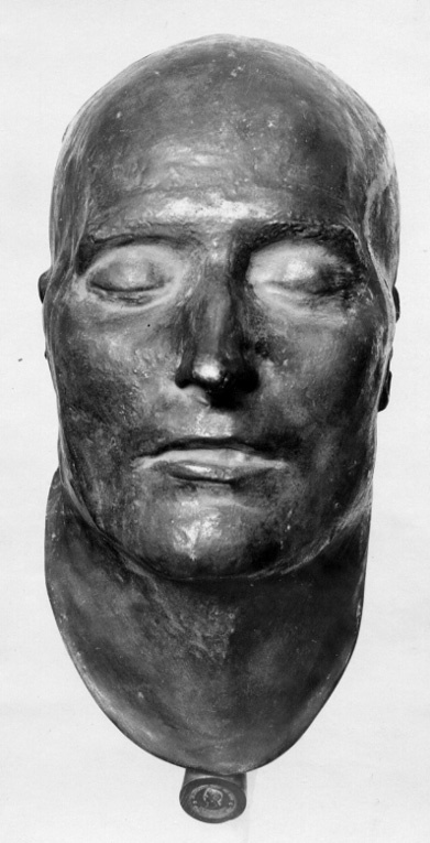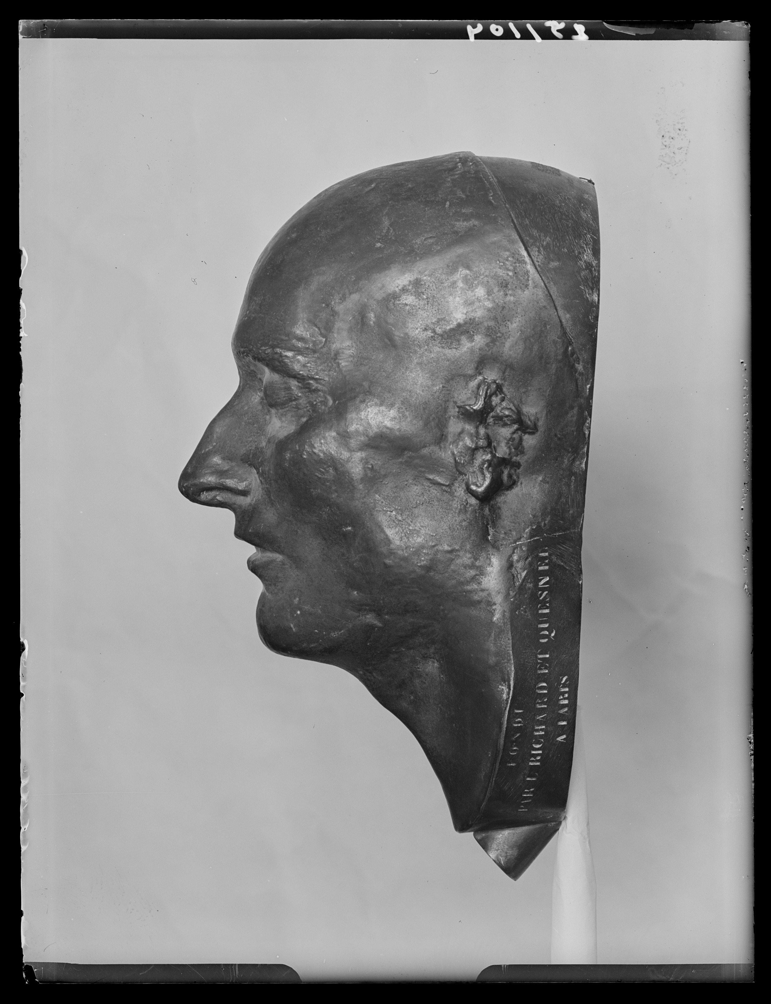 Mask av brons, bågformigt halssnitt, h: ca 40 mm, därpå otydlig text, de smala strecken saknas, till v:"D.R F:ANTOMMARCHI", till h: "FONDE // PAR L RICHARD ET QUESNEL // A PARIS". På nederkanten ett cylindriskt utskott, ovansidan rak avskuren, däri infattat mynt(?) med porträtt av Napolen I, halsbild, profil v, lagerkrans om håret, omskrift upptill: "NAPOLEON EMP.ET ROI", nertill "SOUSCRIPTION // D.R ANTOMMARCHI 1833". Baktill på hjässan rektangulärt fält, upphugget med bågformigt järn, därbakom hål. Baksidan ihålig, på två ställen märkt "2231" (SHM nr).