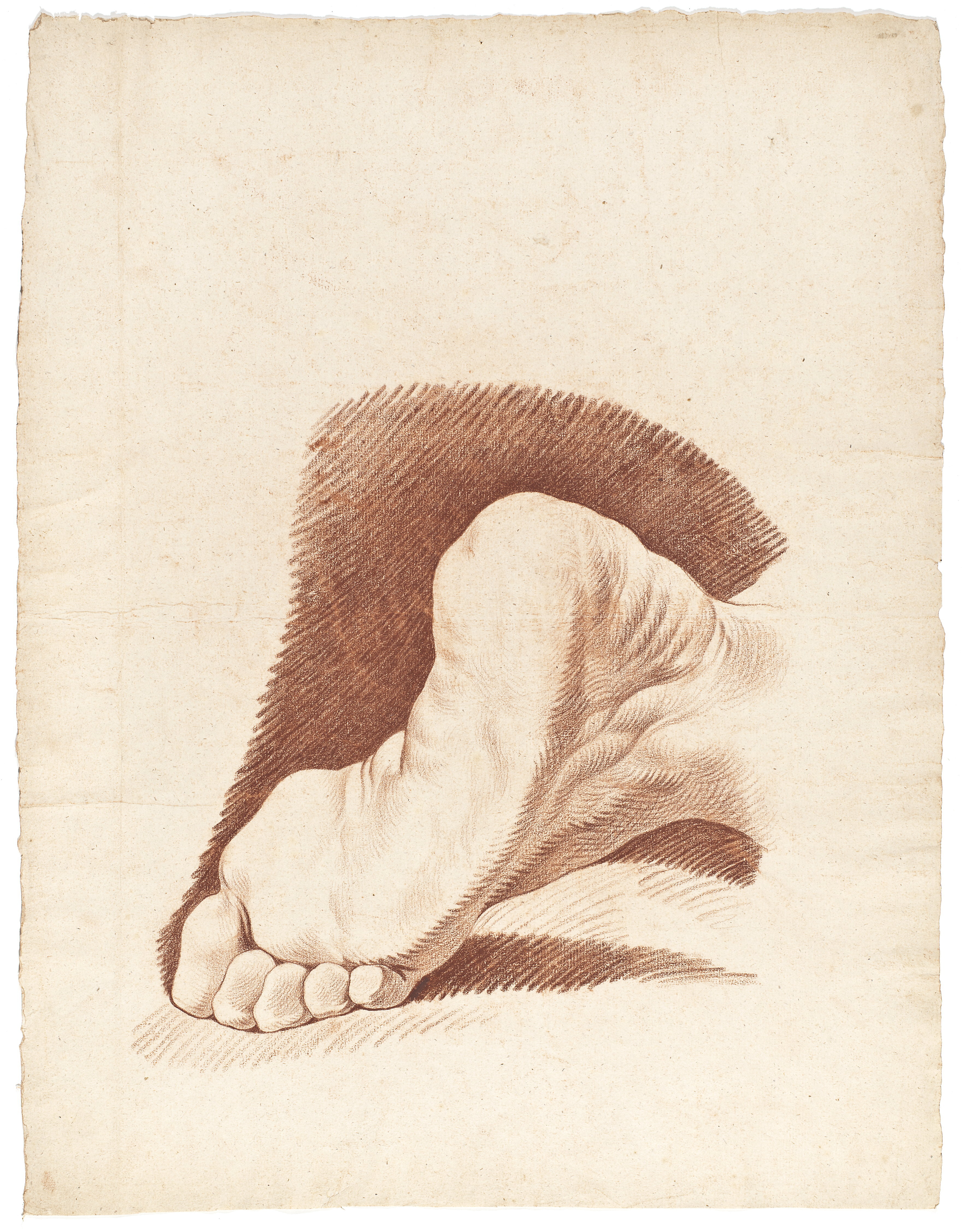 Rödkriteteckning föreställande undersidan av fot av människa. Något böjd.