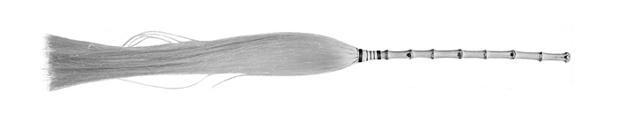 FLUGVISKA Av tagel, med skaft av bamburör. Vippa av vitt hästtagel samt sammansatt av små knippen (s.k. bindlar), fästa vid en kring skaftet lindad tråd, utanpå fästet en skoning av vitt handskinn, omlindad med mässingstråd i fem grupper. Skaft av s.k. pärlbambu i åtta korta leder. Längd: omkring 70,5 cm. Skaft, längd: 29,5 cm. Sannolikt inköpt av Wilhelmina von Hallwyl December 1900 hos en handlare i Kairo. Använd av Wilhelmina von Hallwyl under hennes resa genom Egypten, Palestina (till häst från Jerusalem till Damaskus), mindre Asien och Turkiet tillsammans med sin make, samt fröken Ida Uhse. Förestående uppgifter lämnade med ledning av fröken Ida Uhses reseanteckningar