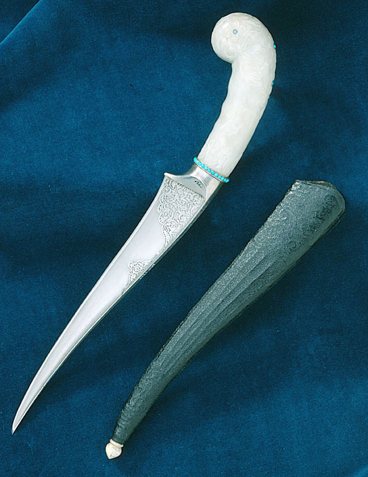 Balja av svart läder med pressade ränder och blommönster. Överkanten är mjukt rundad. Ytteränden har lökform, är av ben.