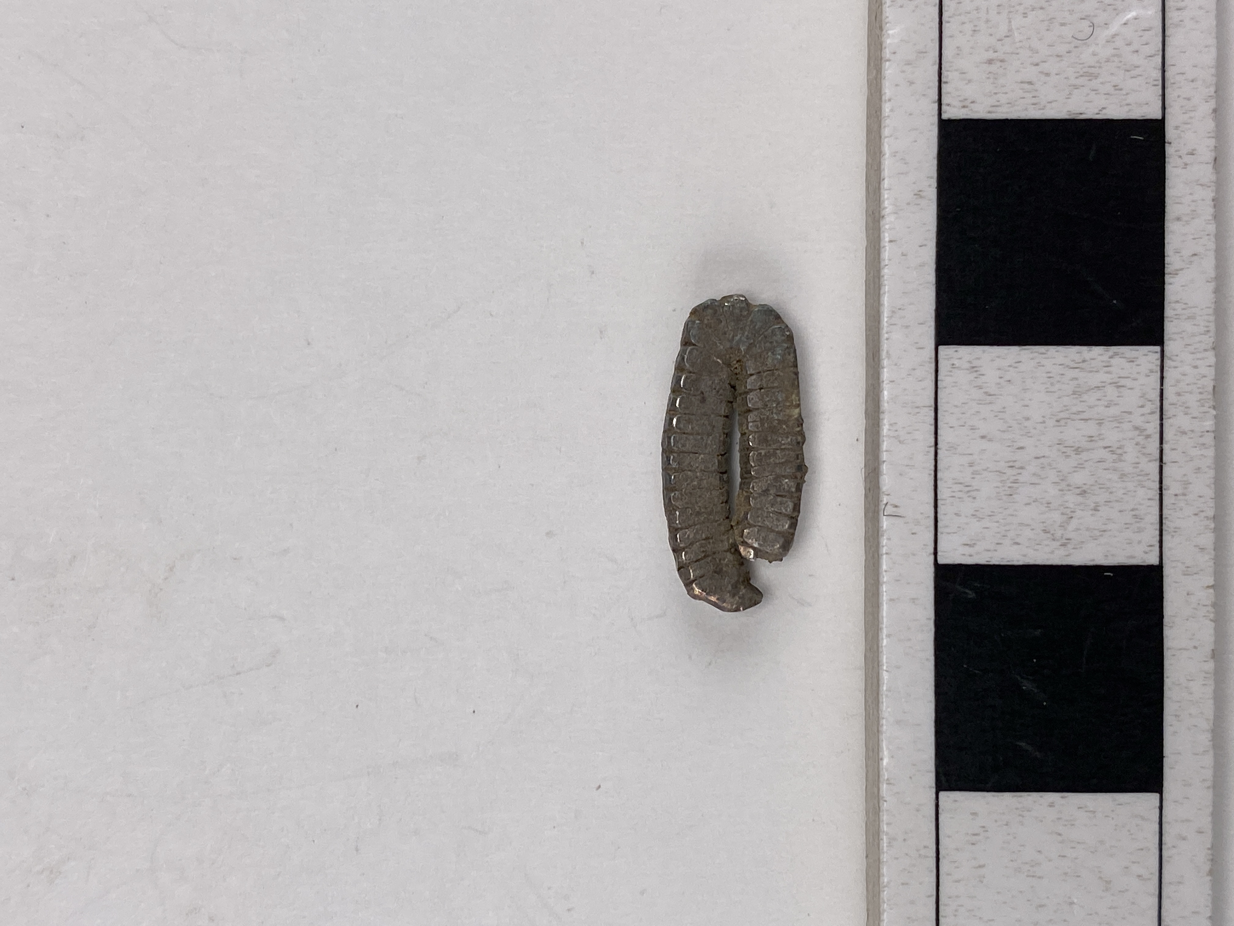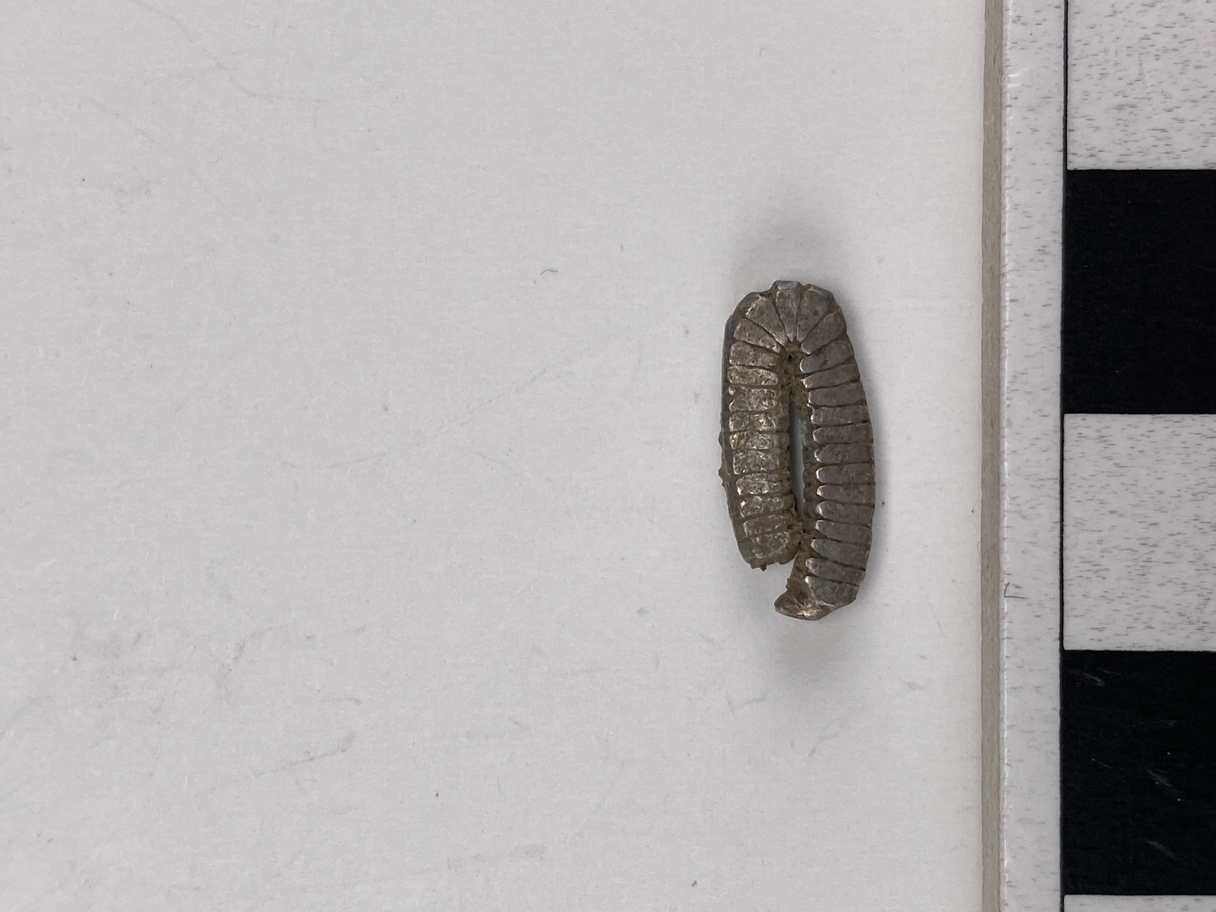 Silverband, antingen strierat eller mönster av ihopsatta silverbitar. Avfasade kanter och böjt.