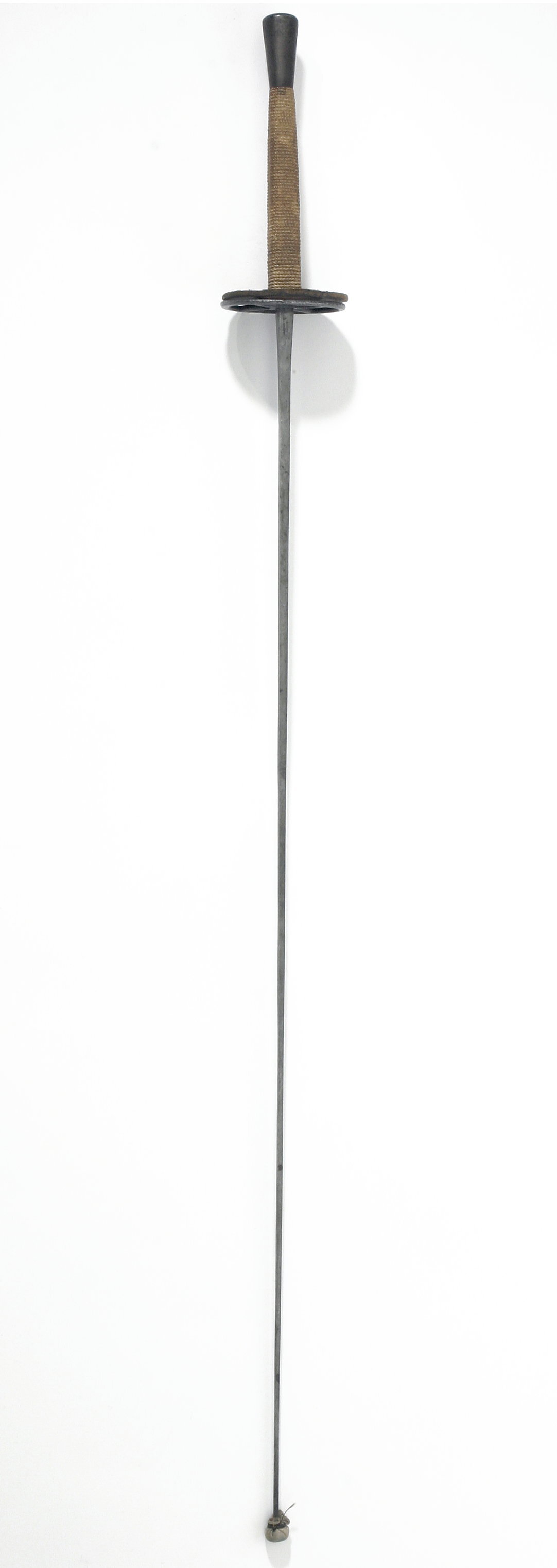 Fäste av stål. Knapp omvänt konisk, slät, översidan konvex med tångens platta nithuvud synlig. Kavel med mjukt rektangulärt tvärsnitt bestående dels av en yttre oval stålram, centrerad till klingbasen med två symmetriska, bågformigt insvängda spänger i plan med den ovala ramen och förenade med en fyrsidig mittplatta, dels av ett inre, tjockt och plant läderskydd, konturerat efter den yttre stålramen och fixerat mellan kavelns nederdel och ramens mittplatta. Klinga rak med rektangulärt tvärsnitt, vid basen på den ena av de två sidorna inslaget i två rader tillverkarnamn: "G.E.SVALLING & C // MÖLNTORP". Spetsen med en tämligen stor skyddsknopp överklädd med sämskskinn och nedtill ombunden med mörk bomullstråd.