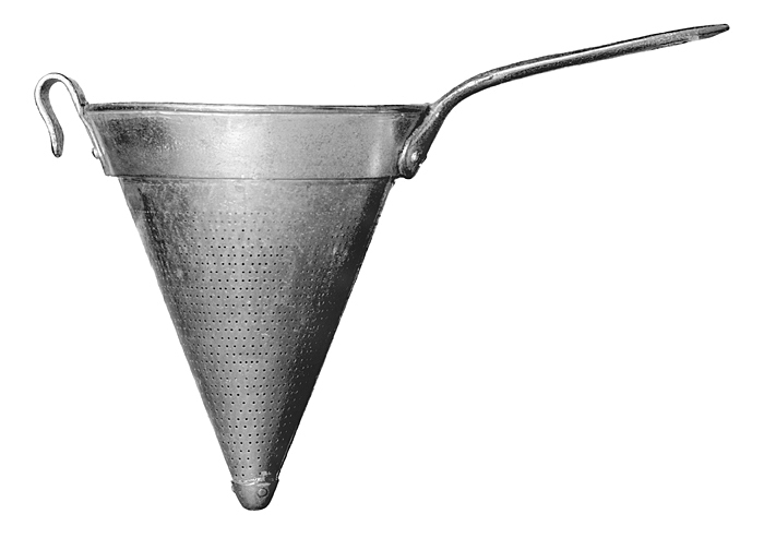 SÅSSIL Av förtent järnplåt. Omvänt konisk, med skaft och hake. Kring brädden en utstående stav, nedanför denna ett utanpåliggande brett band, silen nedanför detta genombruten med små runda hål i runtom gående ringar; på spetsen en utanpågående hel hatt, fäst med tre nitar; skaft platt, något uppsvängt vid skaftroten samt avsmalnande inåt, med flackrundade sidor och spetsig ytterände, något innanför denna ett ovalt hål; från inre änden utgående en tresidig flik, fäst med två nitar; på den skaftet motsatta sidan en utåt omböjd bred hake med utvidgad innerände samt fäst med två nitar. Längd: 17 cm.; diameter: 14,7 cm. Skaft, längd: 12,7 cm.