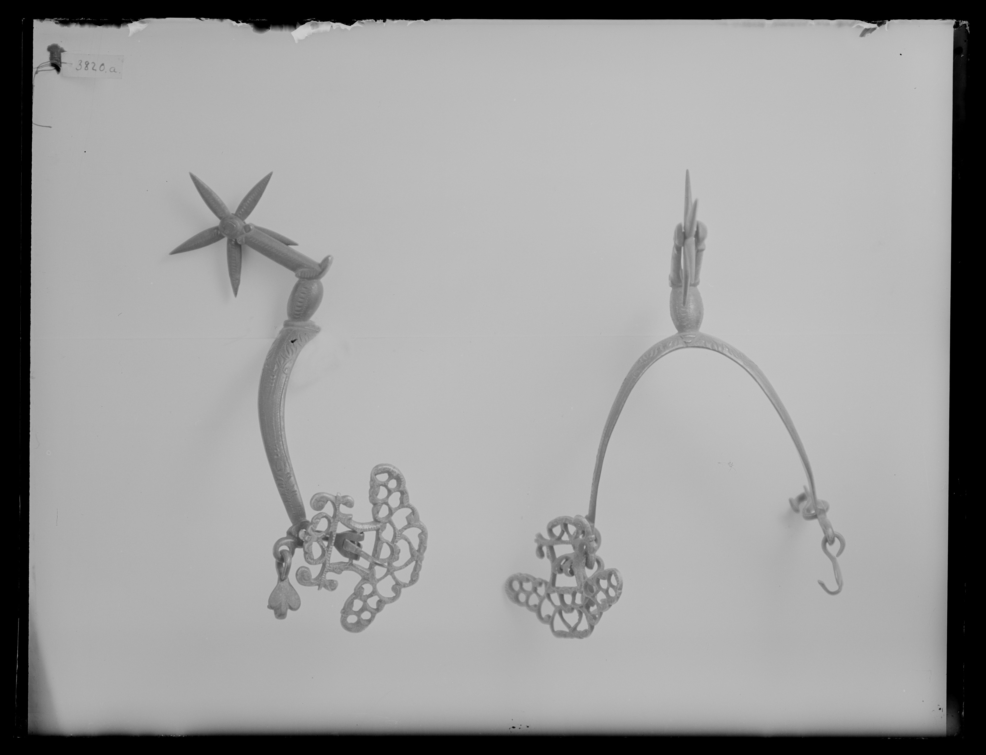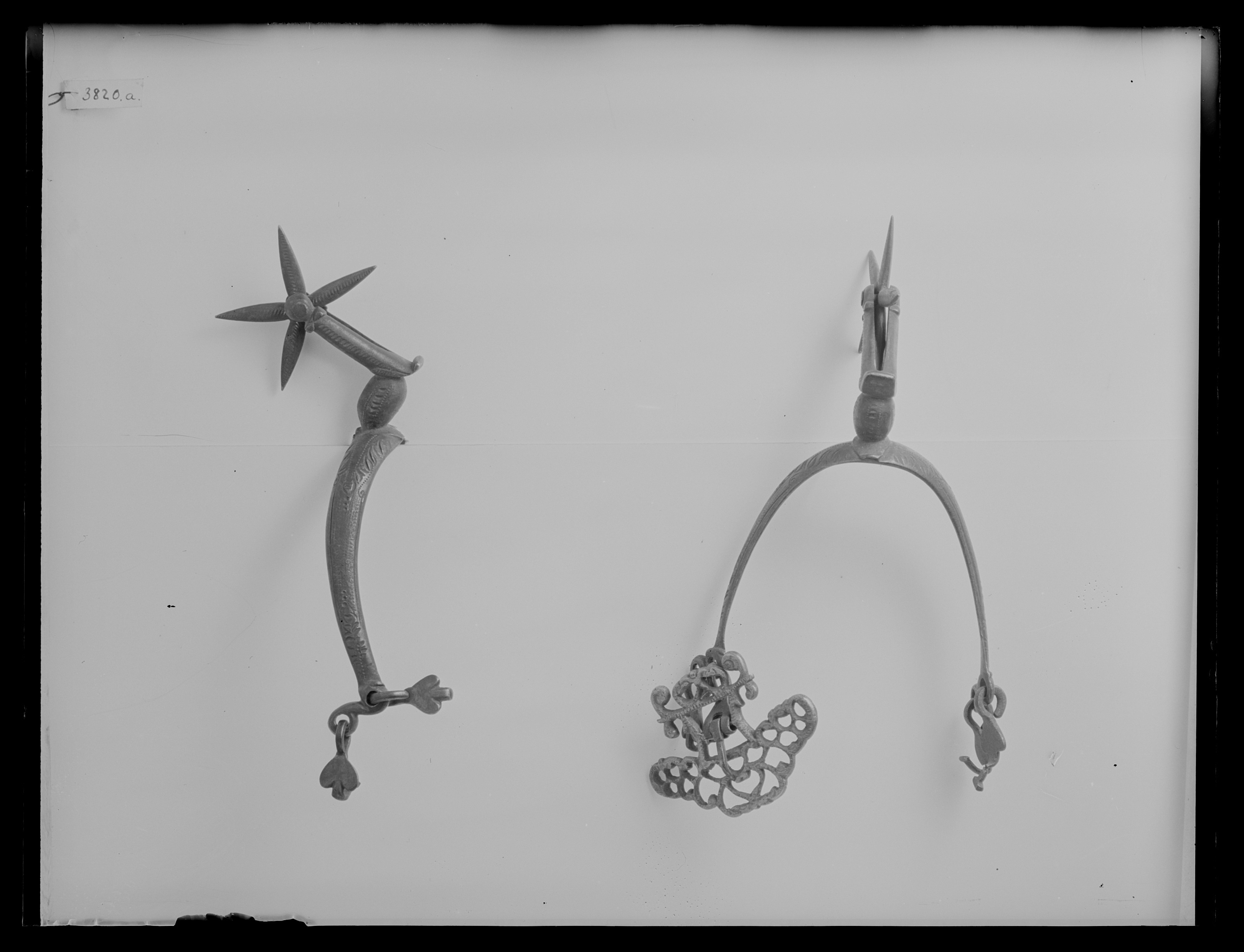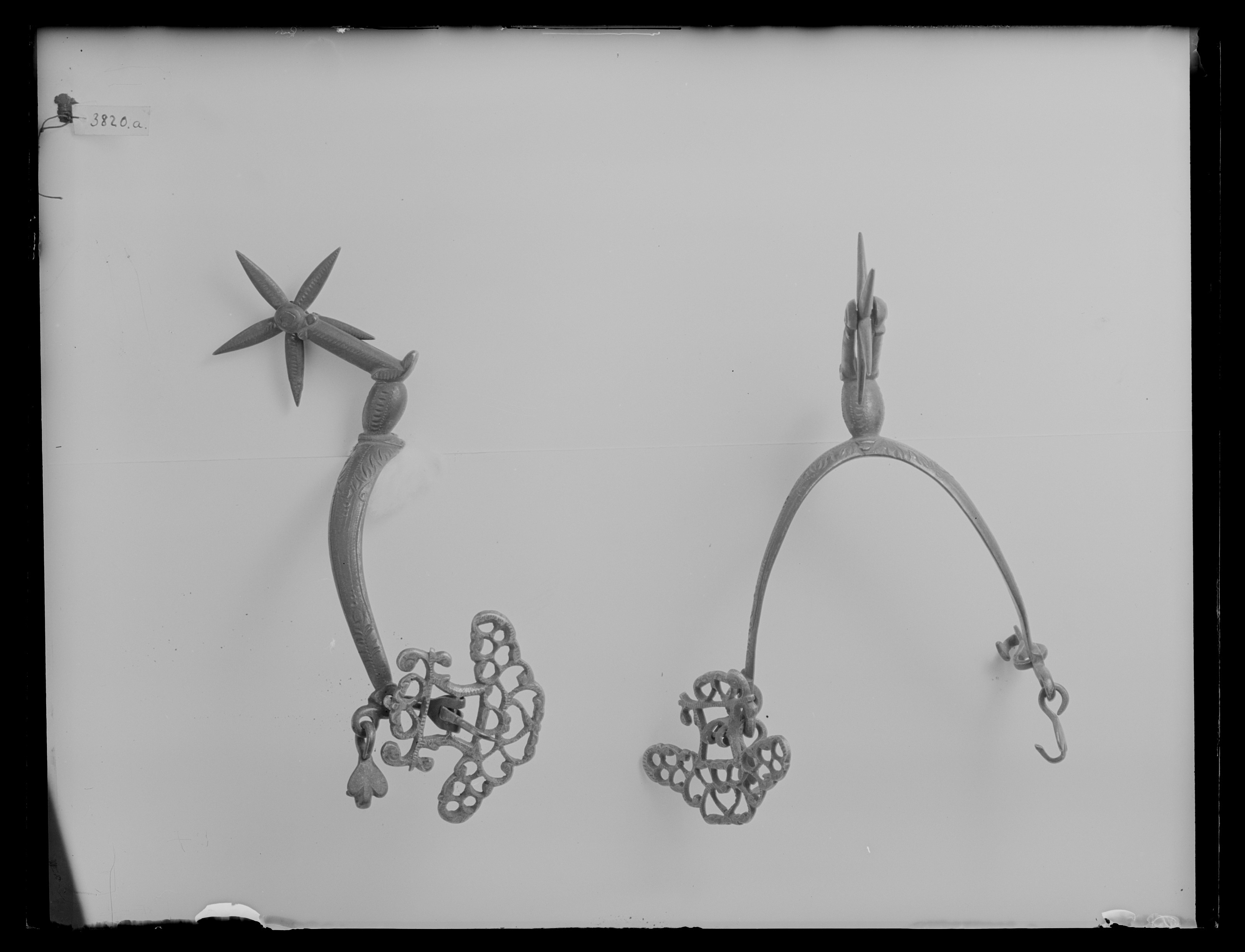 Sporre av stål med punsad dekor. U-formade skänklar med två öglor i var ytterända i vilken är fästa tre hakar och en sölja av mässing i form av ett genombrutet galler med bredare främre del. Böjd sporrhals med spolformigt basparti och rak arm. Klinga av stål, stjärnformig, med 5 taggar.