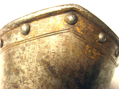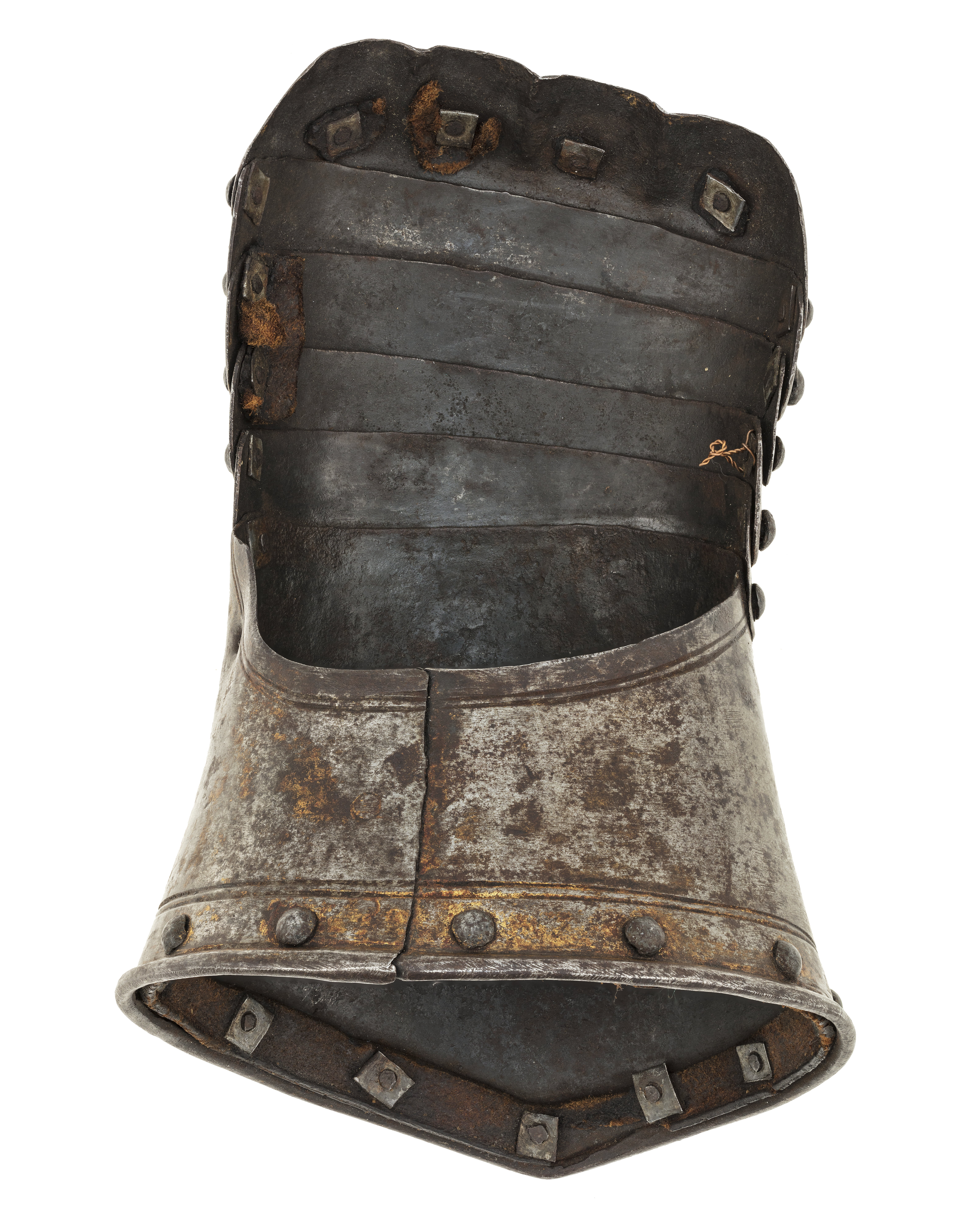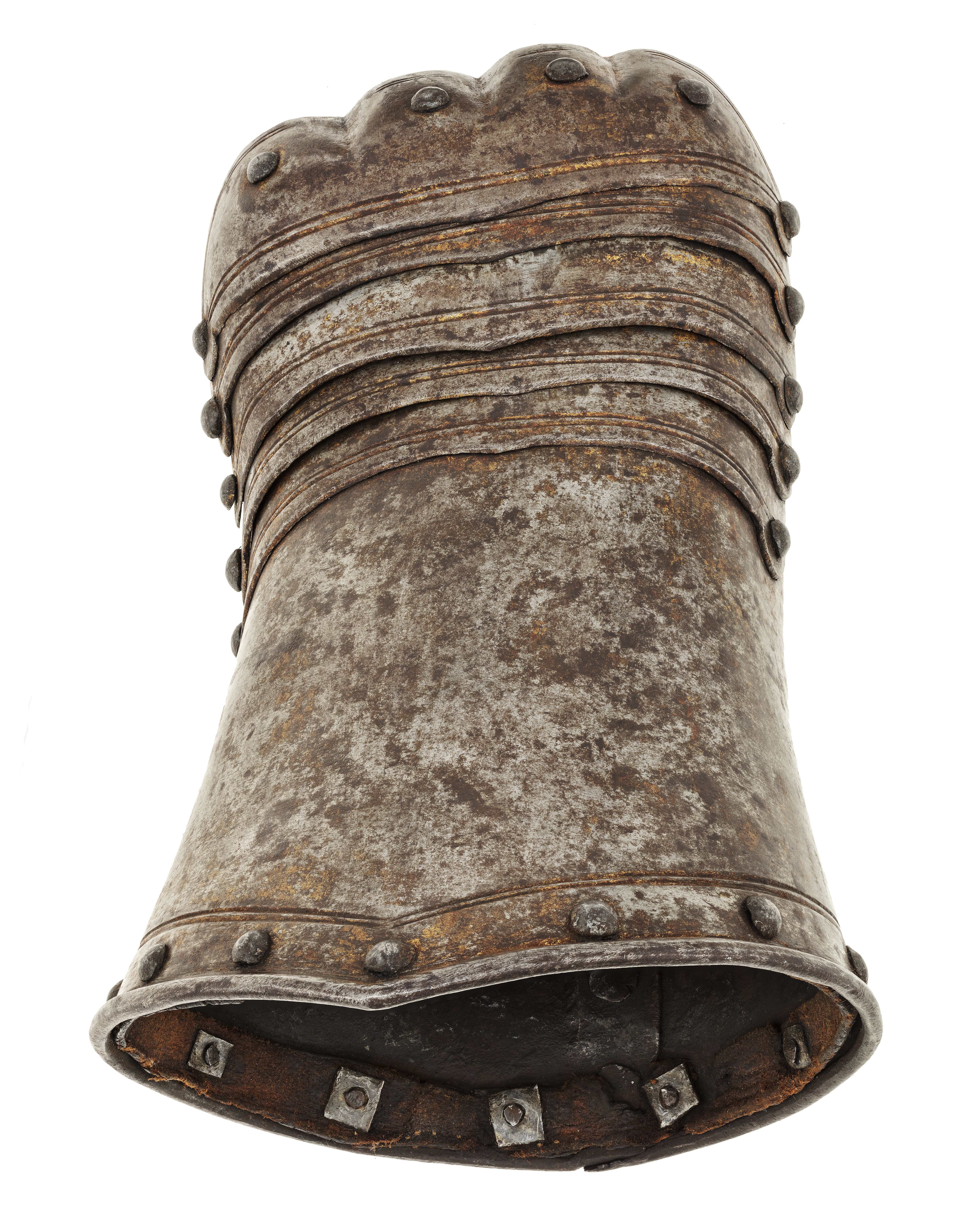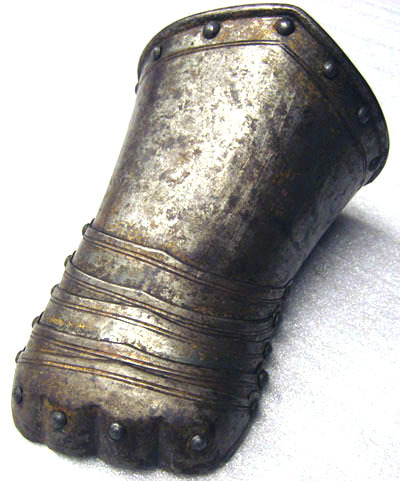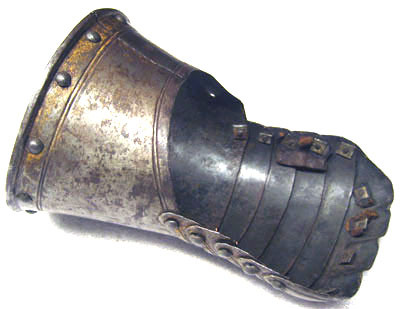 Av driven stålplåt med rester av förgyllning. Sammanlagt sex delar. Upptill krage av rörformig skena med omvikt rundsmidd kant, upptill utdragen till svag spets och nertill rak. Kullriga nitar längs kanten, innanför dessa runtom löpande ristad dubbelinje. Över handen fem välvda skenor fästade omlott med en nit i var kant. Synliga kanten i mitten utdragen till svag spets, tvärs över löpande ristad dubbelinje. Yttersta skenan med drivna förhöjningar och inpressningar för knogarna, över varje knoge en nit. Insidan svärtad med nertill runt kragen kantband av brunt läder, b 13 mm. Upptill i sidan rester av ytterligare läderband.