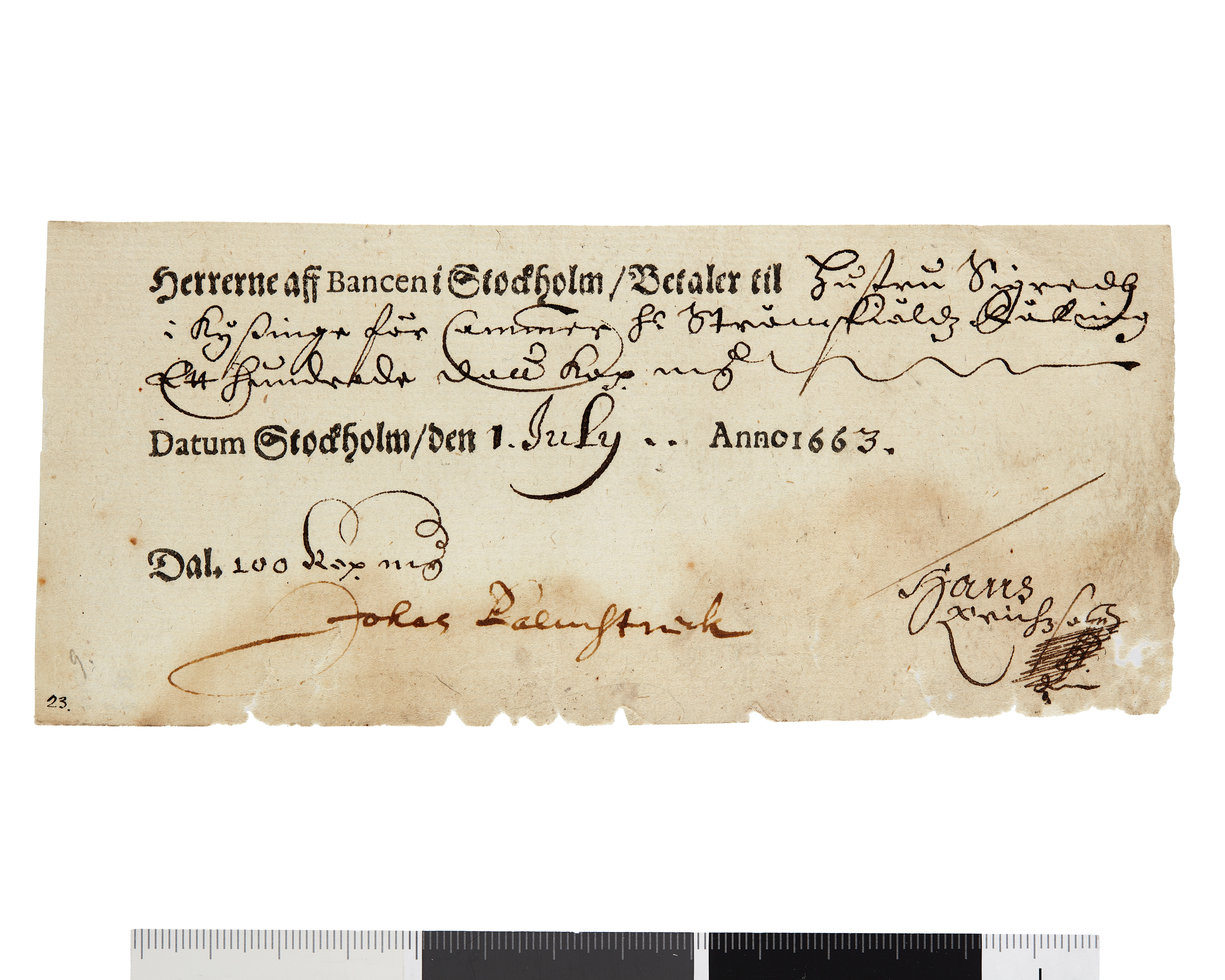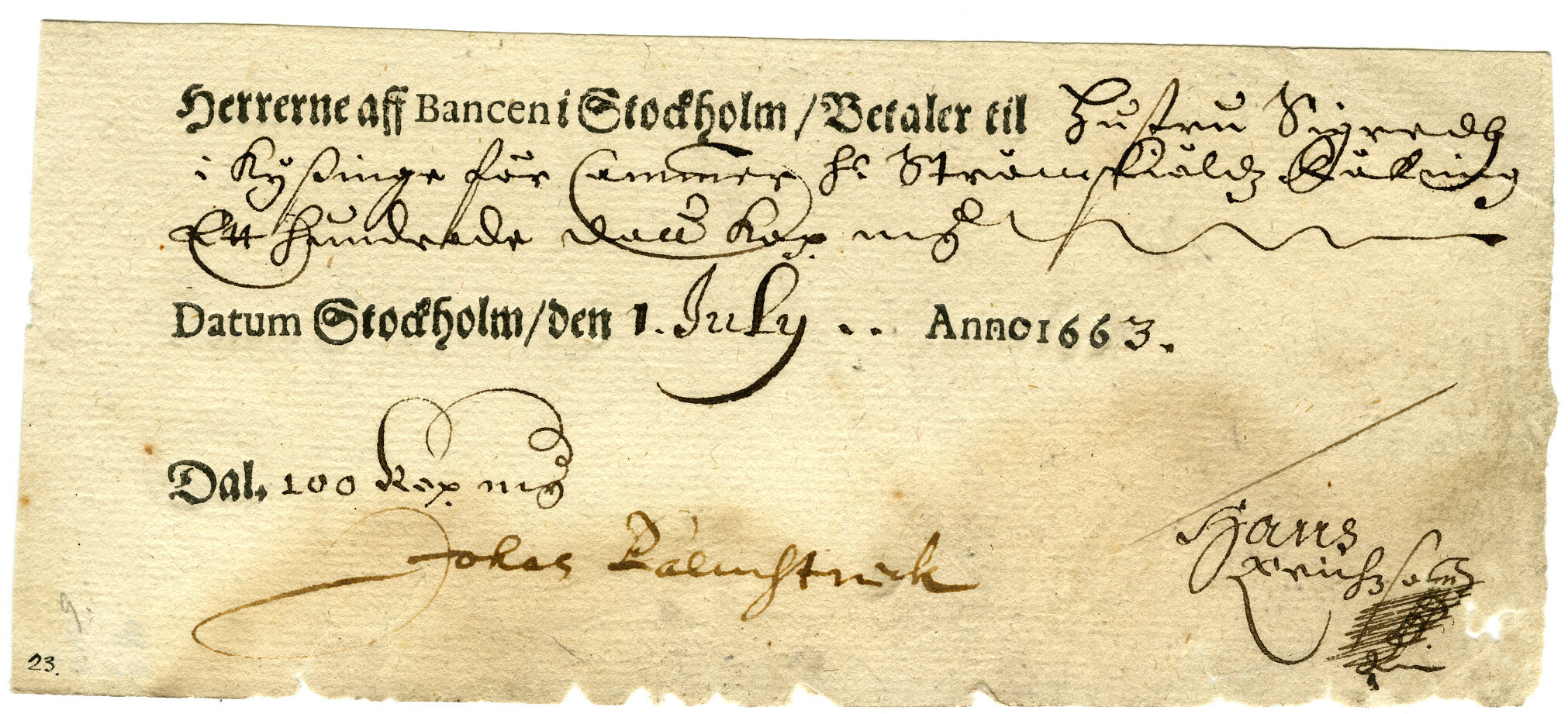Upphov: Stockholms banco. Media: Bonnevier, Helena. Ekonomiska museet - Kungliga myntkabinettet/SHM, (PDM) Upphovsrätten till detta verk har gått ut och är därmed fritt att använda på alla sätt. Ange gärna upphovsperson om denne är känd.