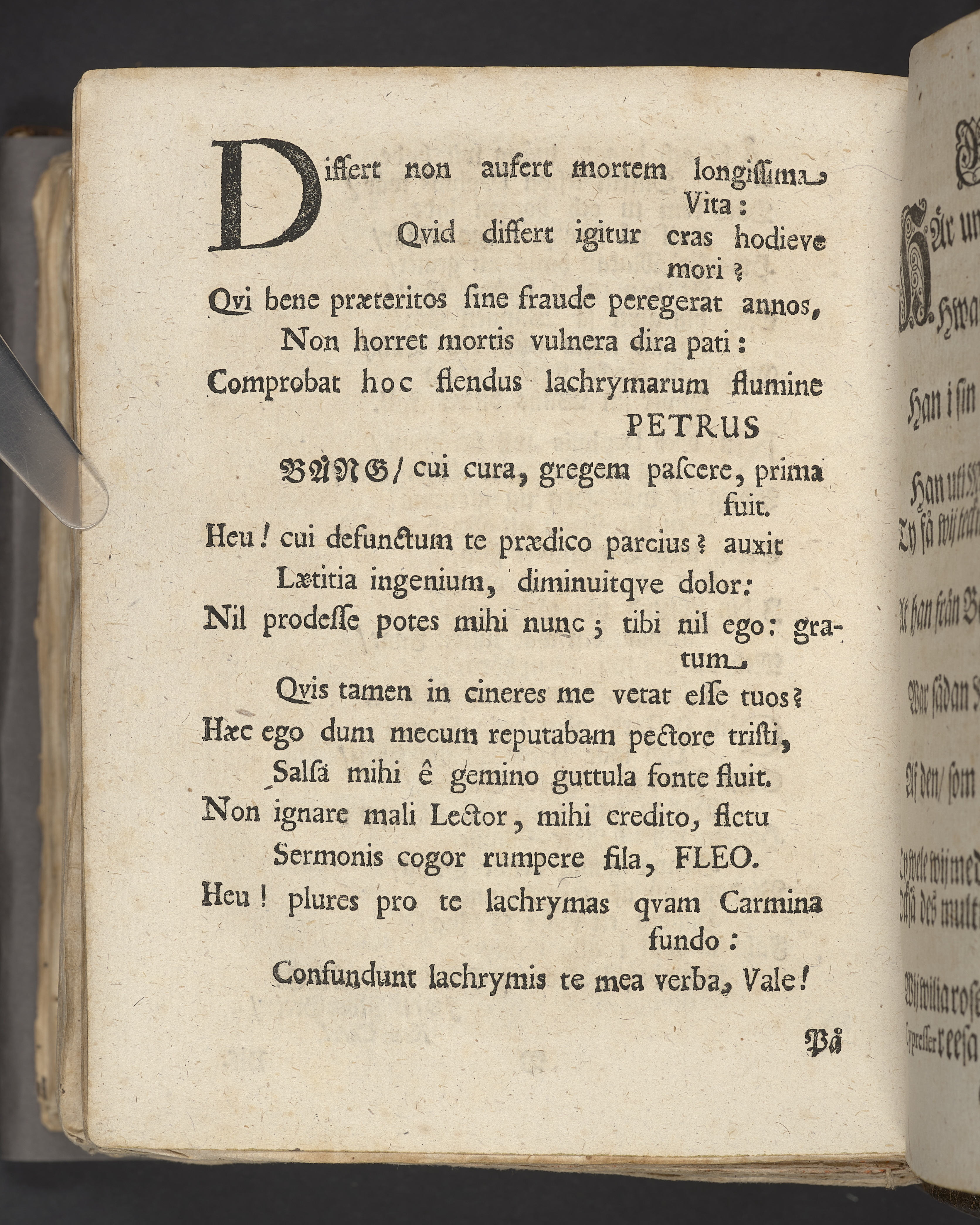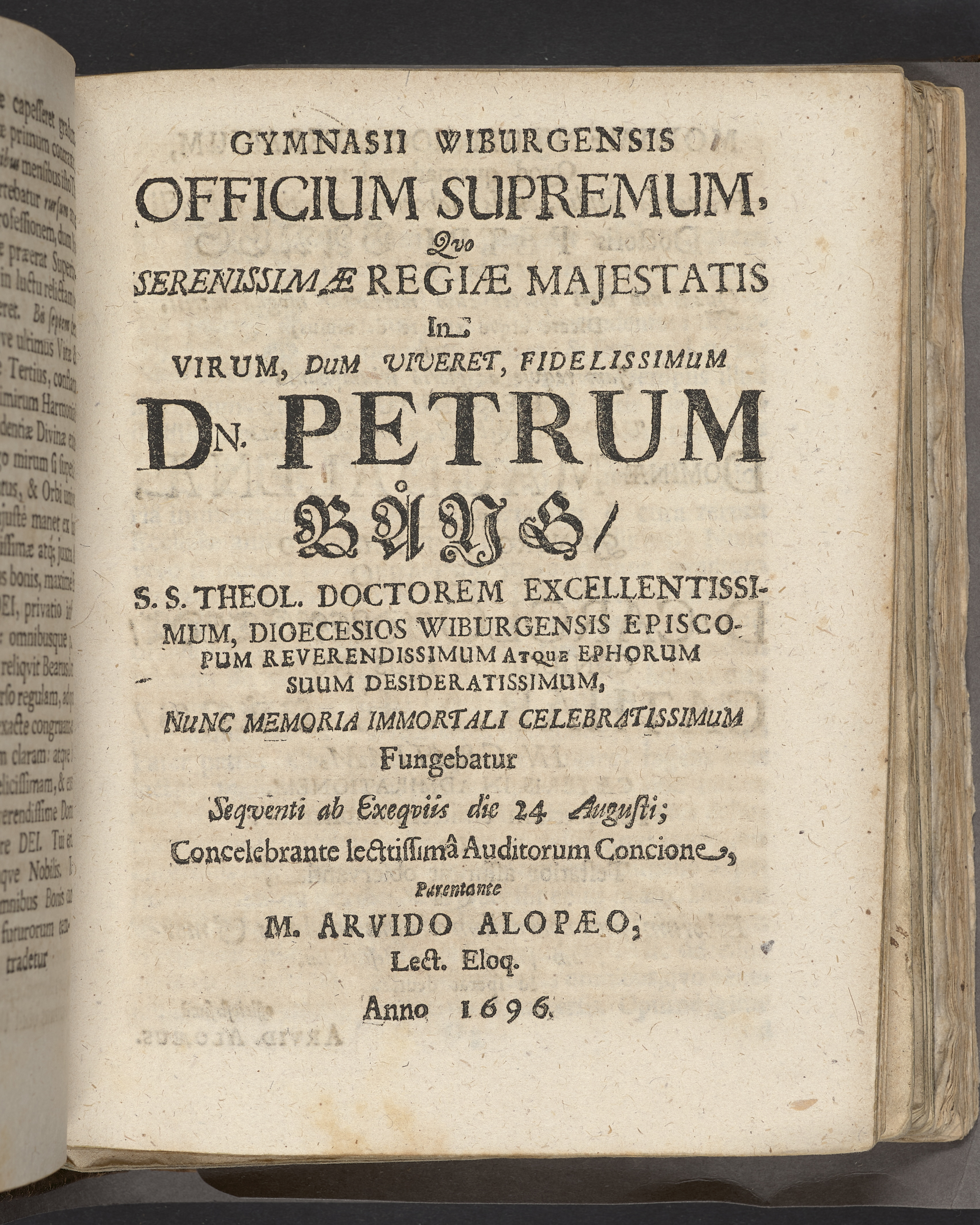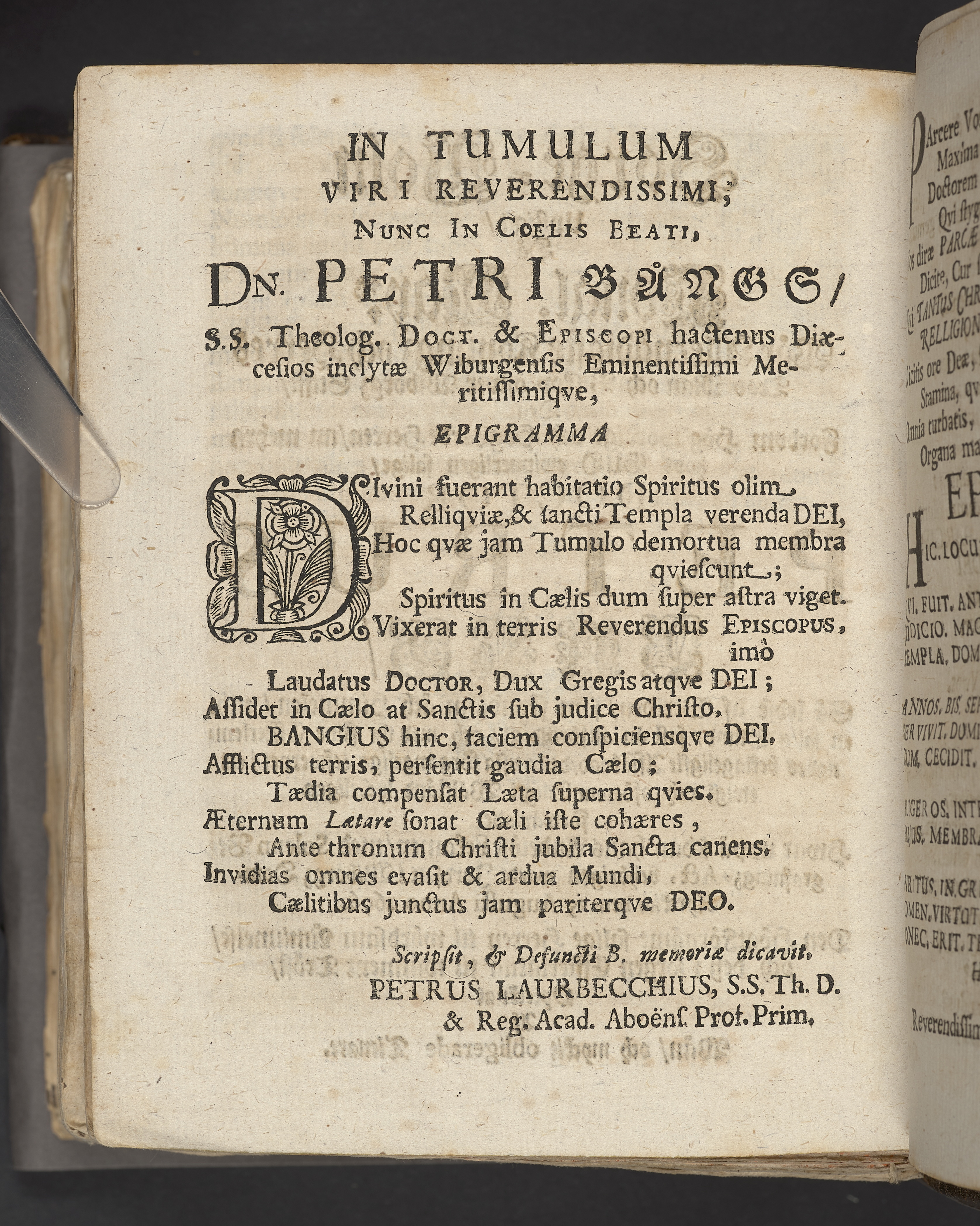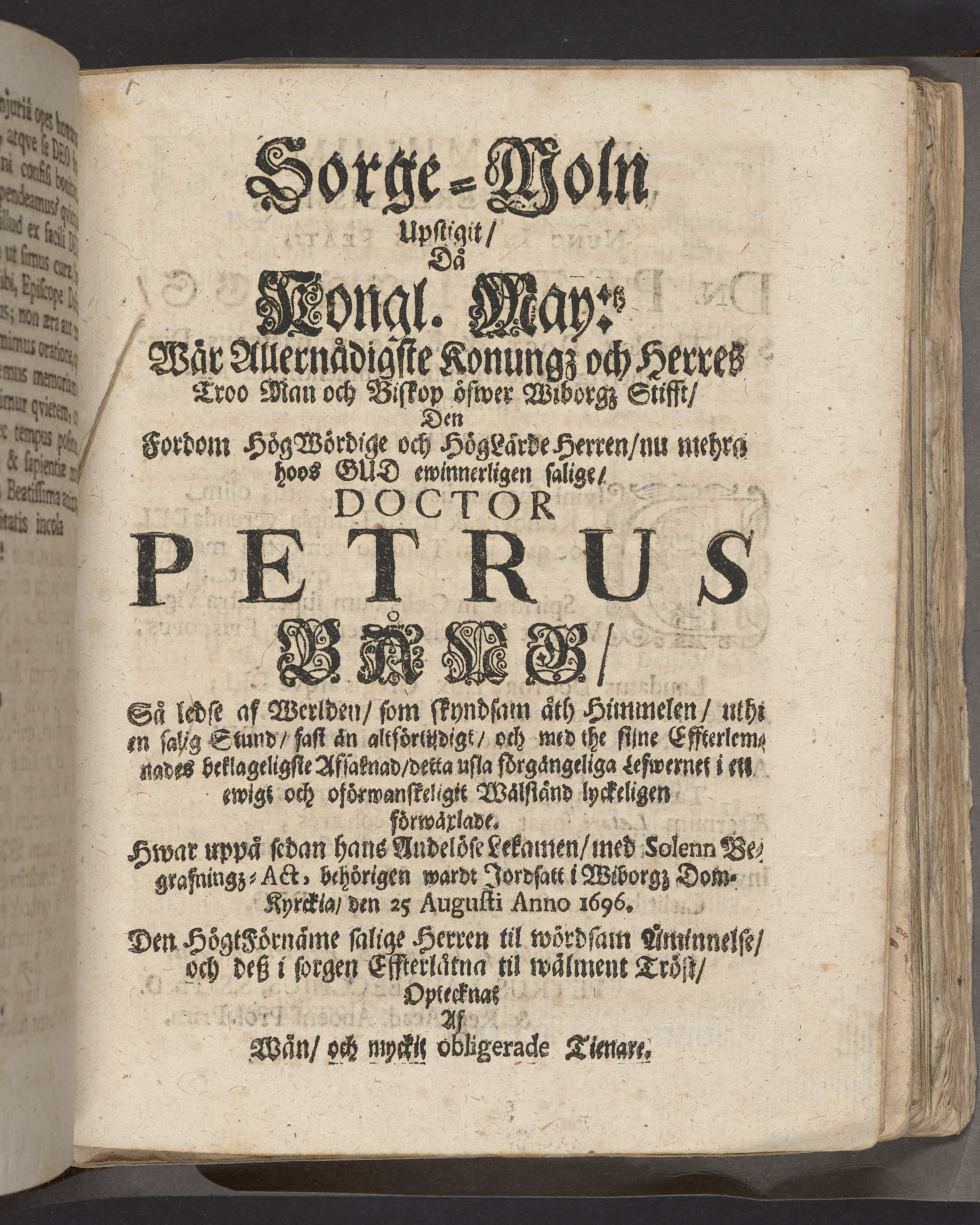 Desiderium orbis eruditi, ex occasu ... B. Petri Bång ... Aboæ die 26 augusti anno 1696 expressum in sermone panegyrico â Conrado Quensell ... Wiburgi impr. apud viduam Matth. Syngmanni.