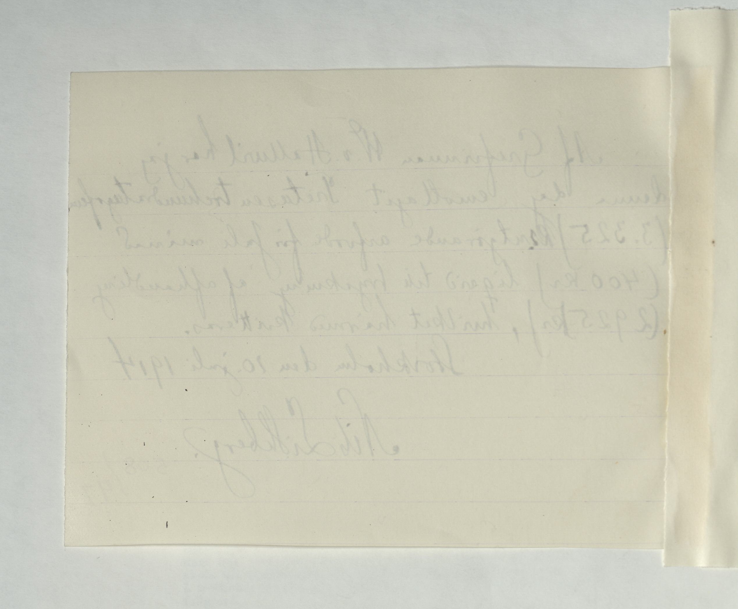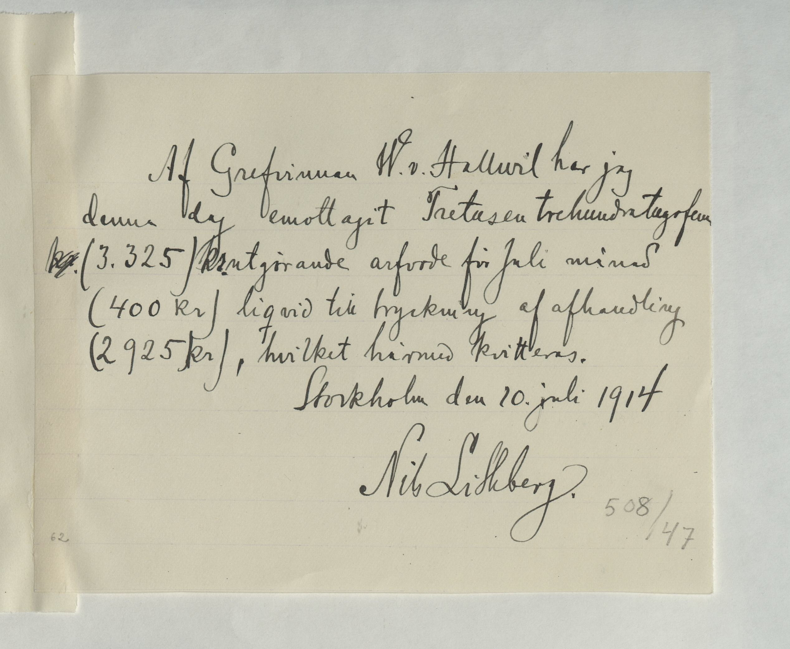 Emottagande av arvode från grevinnan Wilhelmina von Hallwyl till Nils Lithberg, 10 juli 1914