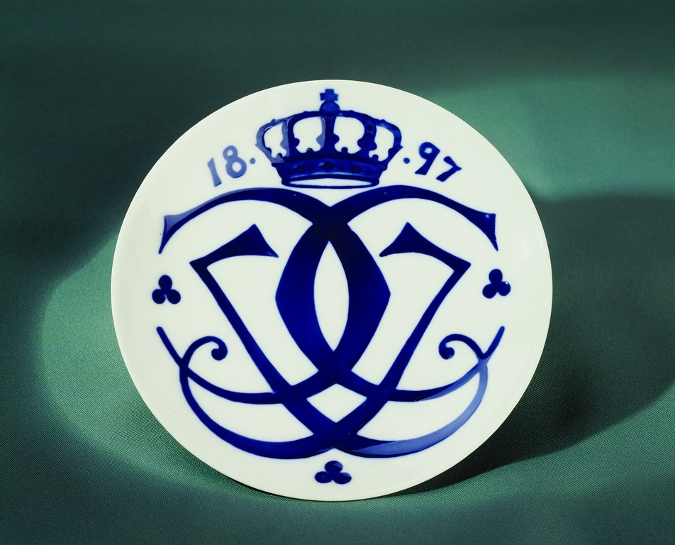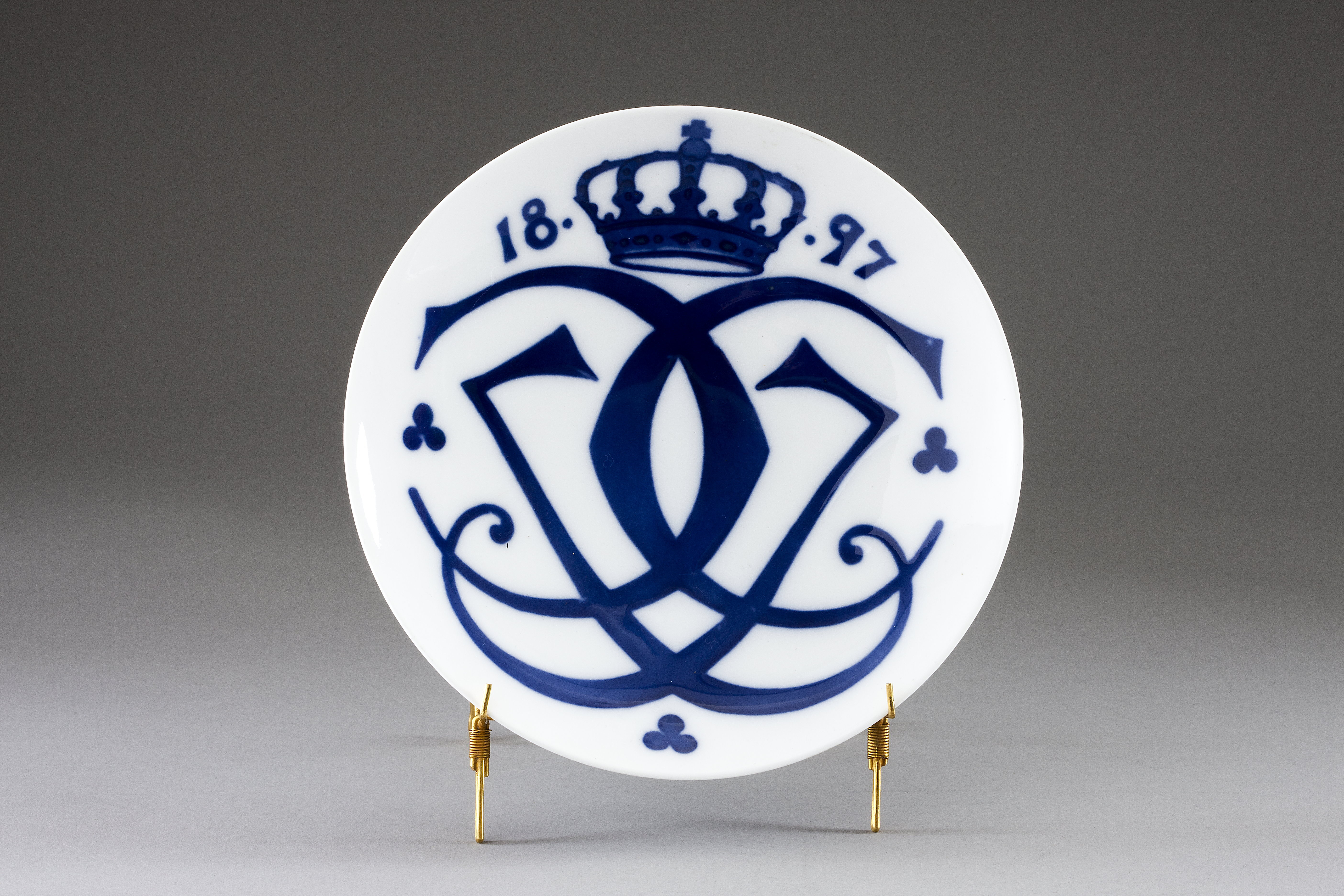 Rund, lågt skålformig tallrik med dekor i blått under glasyren. På insidan prins Carls av Sverige och prinsessan Ingeborgs av Danmarks krönta spegelmonogam jämte årtal. I fotkanten två små hål för upphängning. Fabriken grundlagd med privilegium 1775 av ett aktiebolag med Franz Heinrich Müller som teknisk ledare. Företagets grundande hade föregåtts av experiment utförda sedan 1752 under olika personers ledning, den mest kände var fransmannen Louis Fournier. Fabriken överläts 1779 till kung Christian VII varefter den kallades Den Kongelige Porcelainsfabrik. Pris: 15 Kr.