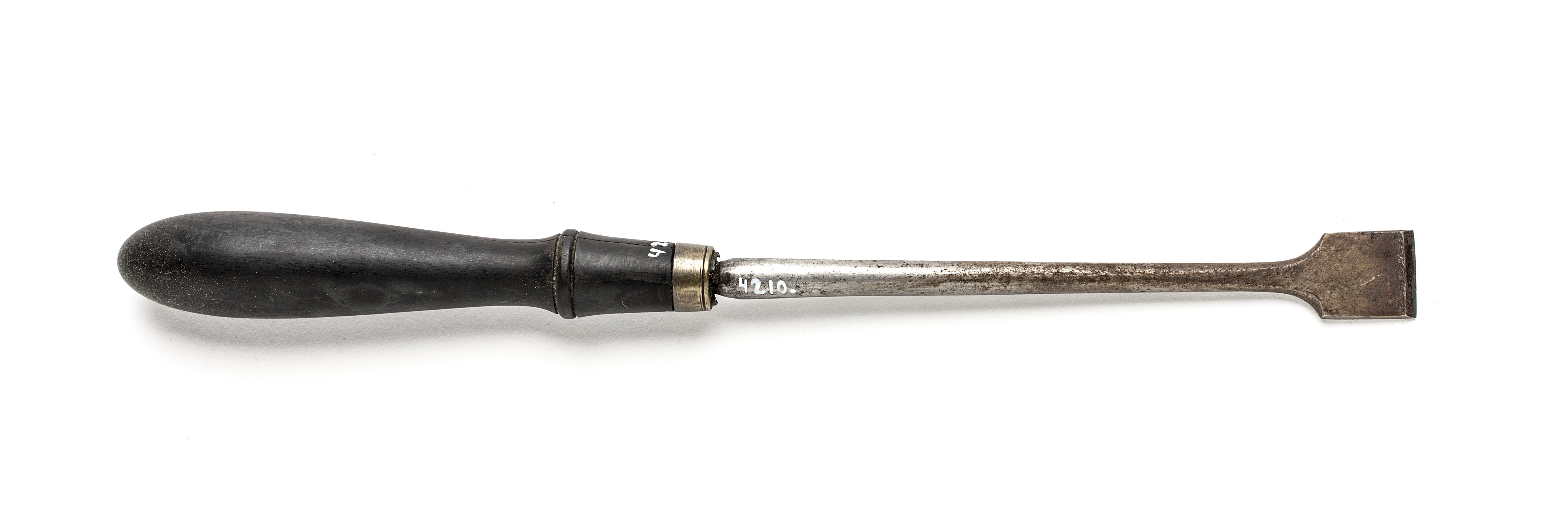 Rund klinga, framtill brett, rektangulärt stål med rak egg, eggen något slipad från ovansidan. Svarvat skaft av ebenholts med en vulst. Mässingsring. Stämplat på klingan: "S B".