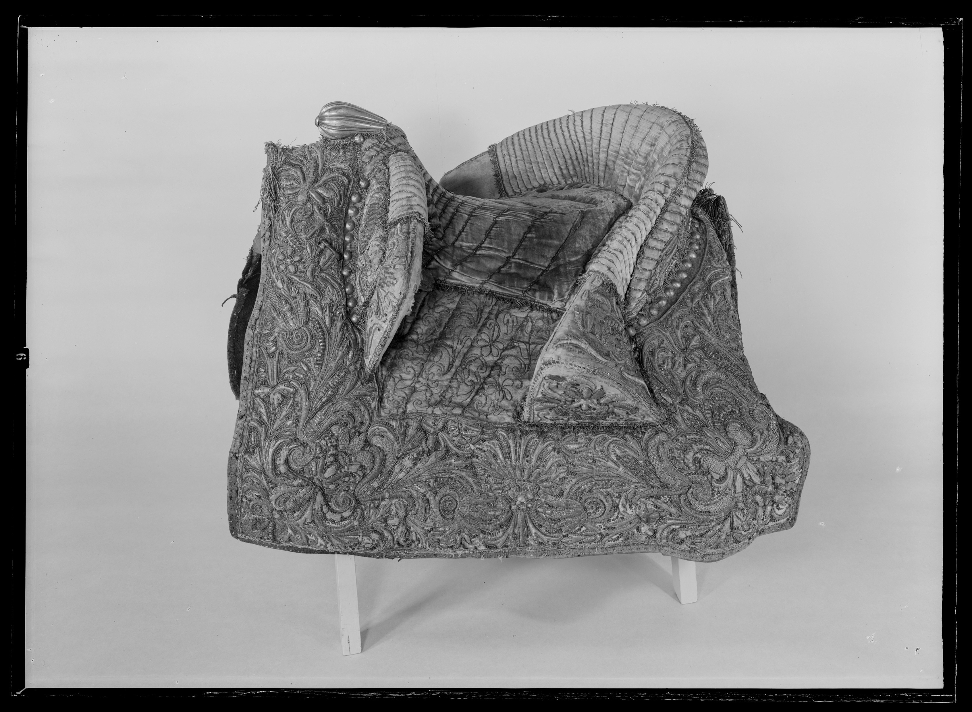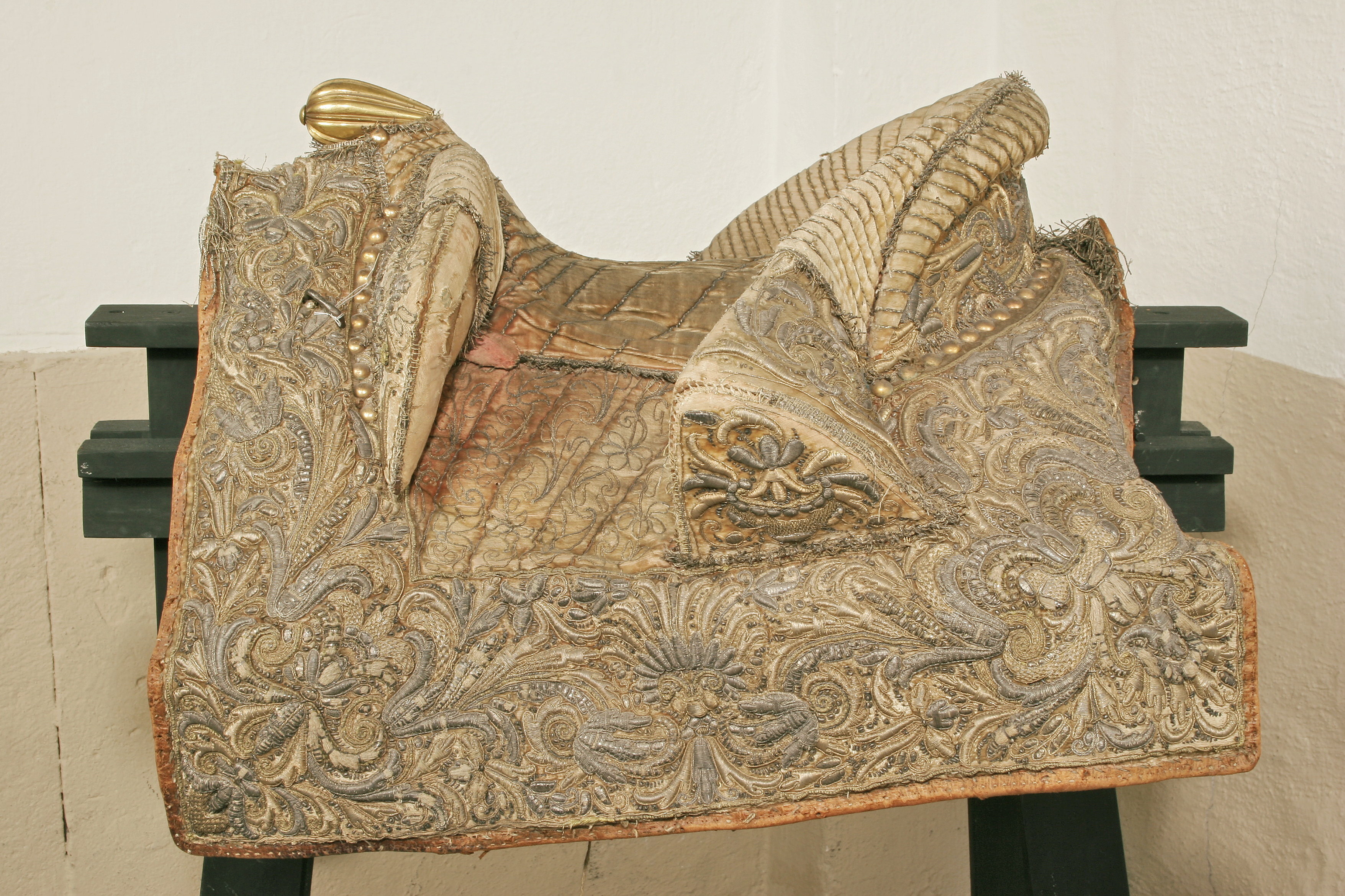 Sadel av ursprungligen röd, numera rosa, sammet med yttäckande broderier med guld- och silvertråd i form av rankor, blommor och voluter. Rektangulära kappor, fodrade och kantade med brunt läder. Tvådelad frambom, 440 mm bred, 100 mm hög. Bakbom med stödbommar, 600 mm bred, 130 mm hög. Bommarnas insidor och sitsen med stickningar av tvinnad silvertråd. Sadelknapp rundad, framåt utdragen, räfflad, av förgylld mässing. Framför frambommen 8 + 10, bakom bakbommen 12 + 12 tännlikor av förgylld mässing. Bom klädd med näver. Fyra stroppar av brunt läder för sadelgjord. Två krampor för hölster, två söljor för stigläder, två för förbygel, alla av stål. Fram- och baktill hällor av läder.