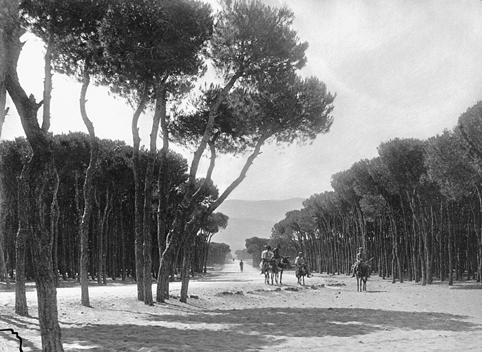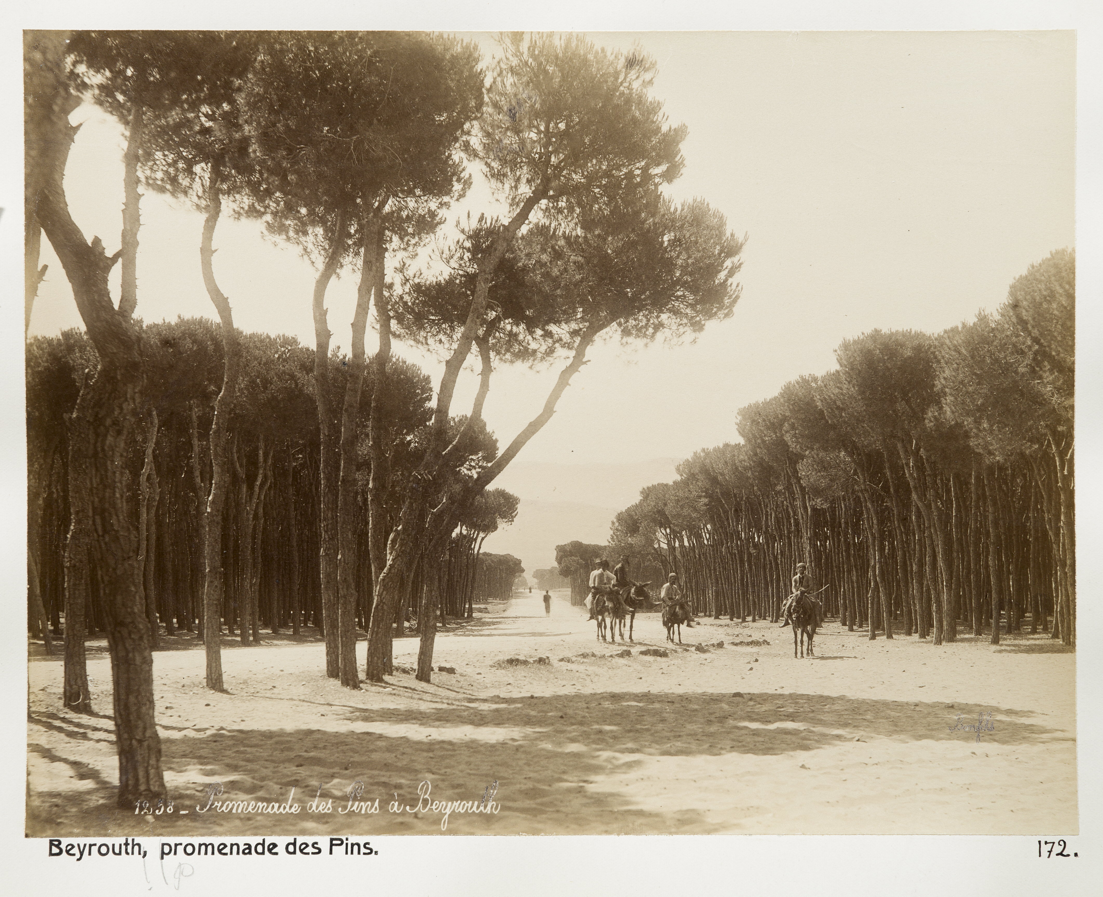 Väg genom pinjeskog, Beirut. Text på originalet: "Beyrouth, promenade des Pins." Fotografierna LXVI:N.01.-180. kommer från resan till Palestina och Syrien som Wilhelmina och Walther von Hallwyl gjorde den 30 mars-27 april 1901. De lämnade Sverige den 5 november 1900 för Egypten, där de stannade till den 28 mars 1901, då de fortsatte till Palestina. Med på resan var Wilhelminas sällskapsdam, fröken Ida Uhse. Den 27 april fortsatte de till Turkiet och Mindre Asien. De mindre fotografierna (utom de från Samos) LXVI:N.90.-100. är tagna av Wilhelmina själv, under en resa till häst från Jerusalem till Damaskus 8-20 april 1901. Övriga fotografier är inköpta av Wilhelmina i Jerusalem, Damaskus och Beirut. Alla uppgifter kommer från Ida Uhses reseanteckningar.