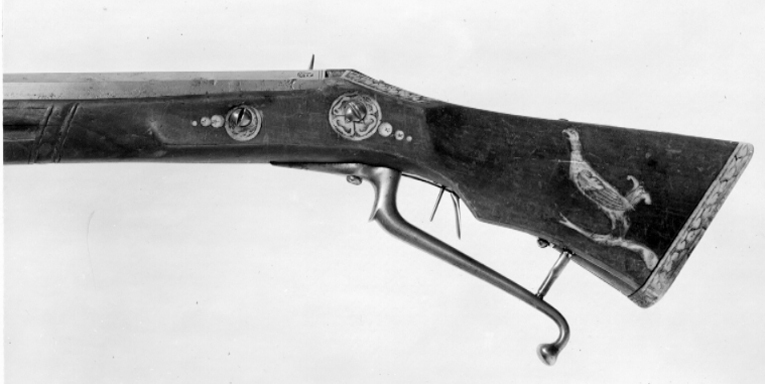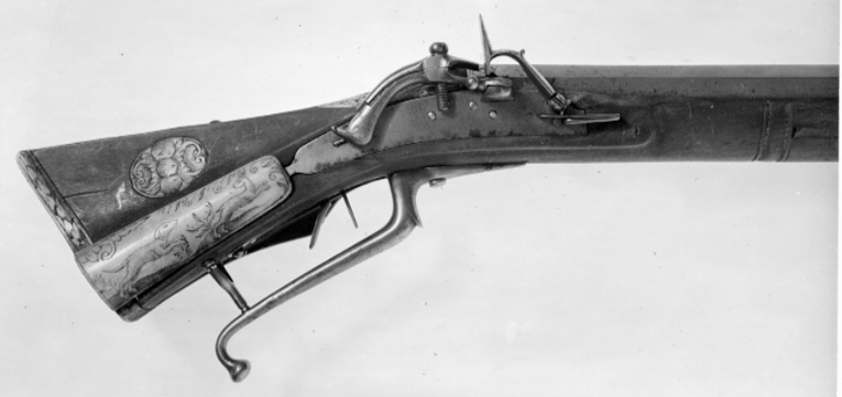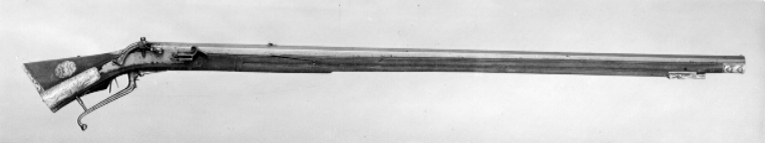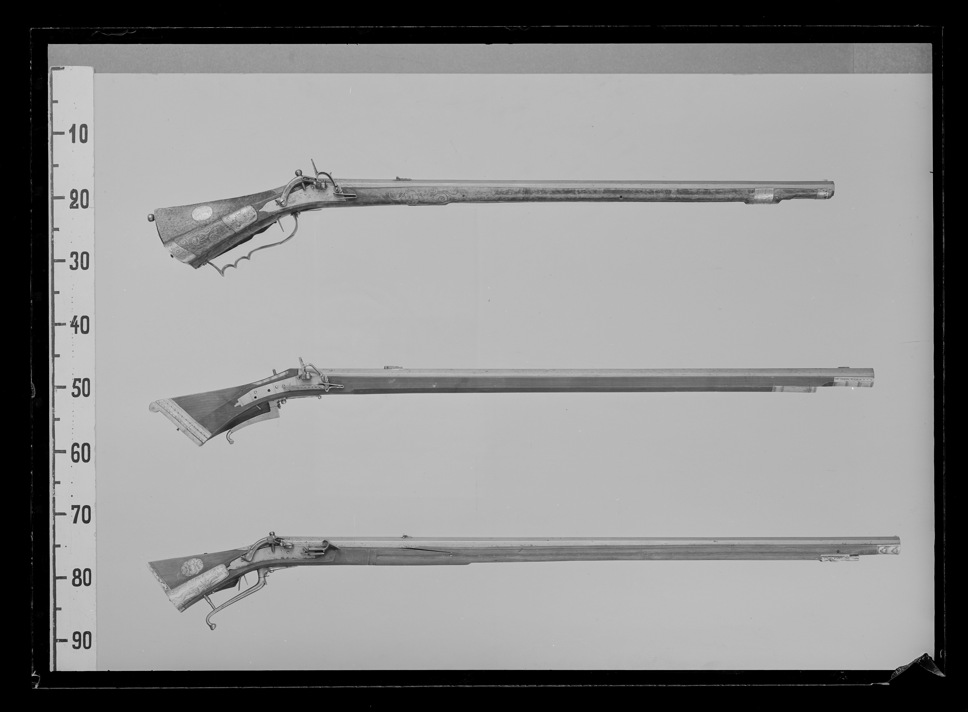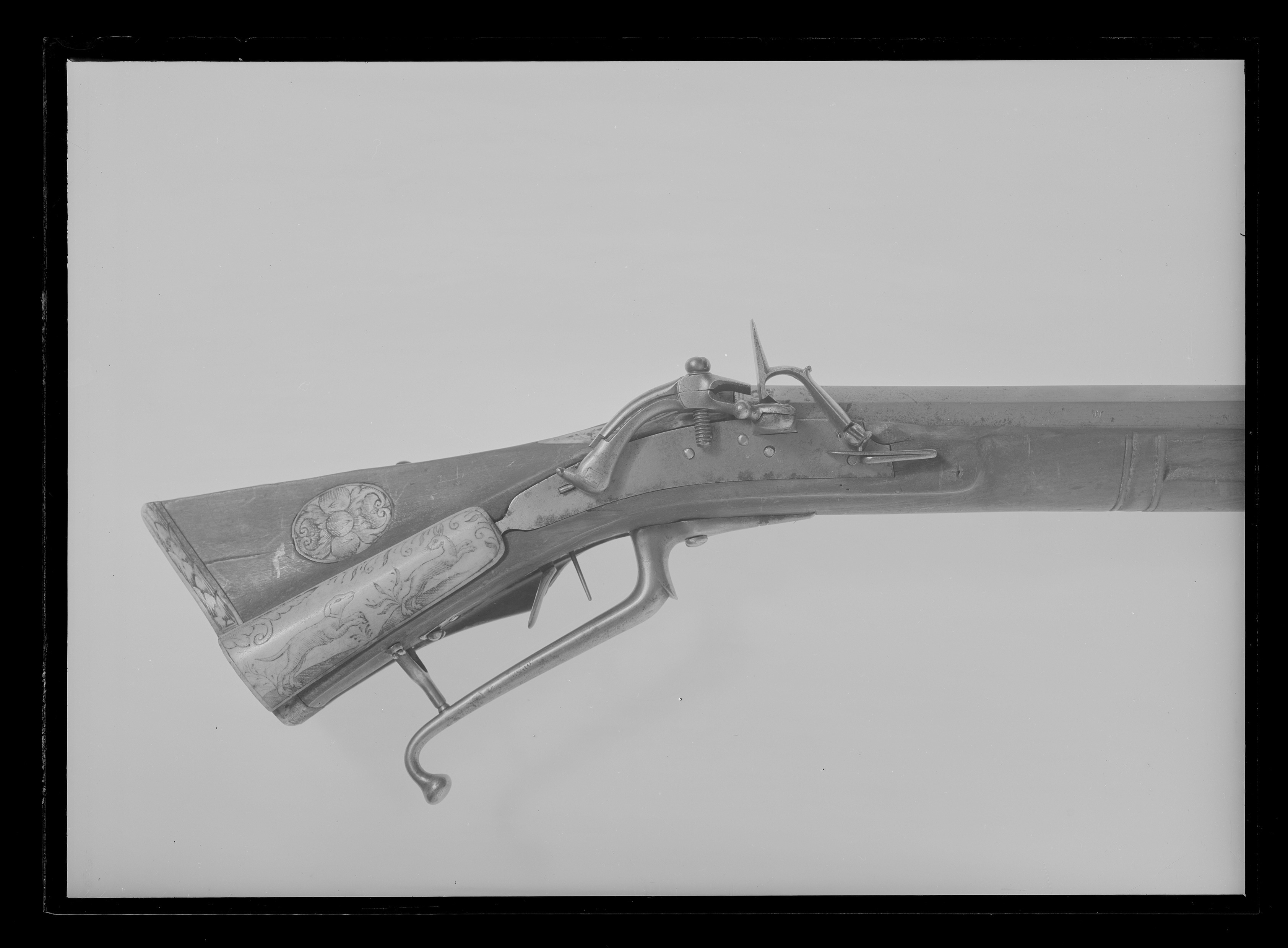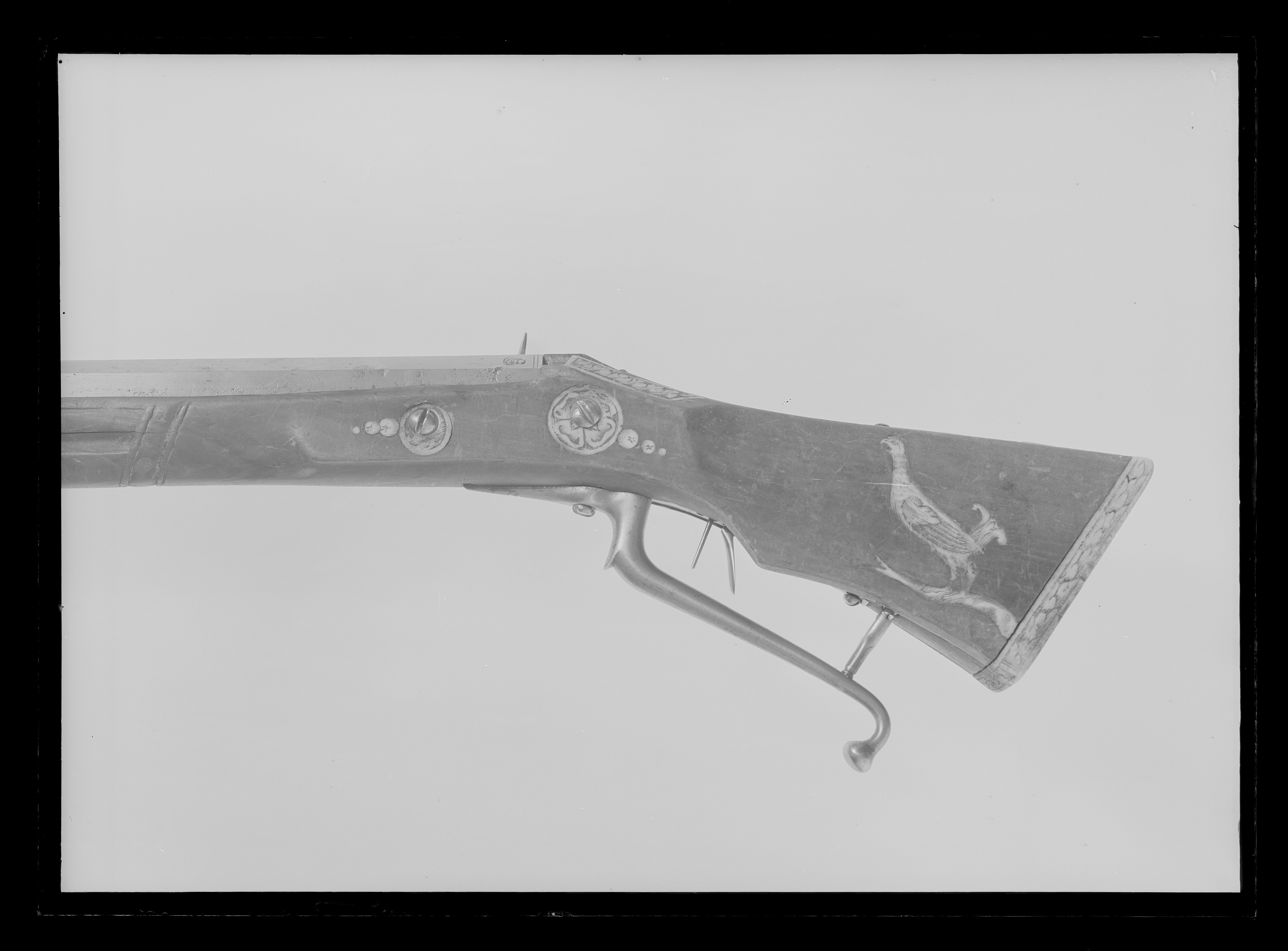 Åttsidig pipa av stål, 8 räfflor. På kammarens ovansida två stämplar: HHS över riksäpple (Stöckelnr 2901). Riktmedel: Över kammaren en siktskåra fram till vingsiktet av stål. Spolformigt stolpkorn av mässing. Fästning: Tre häften. Pipan fäst med krysskruv underifrån. Snapplås, lägglås av stål med plant låsbleck. Böjd hane med hake på foten, inlaxad överkäke. Fängpanna med vridbart lock. Batteri med separat fängpannelock. Fästning: Två låsskruvar. Avtryckare med snälltryck. Helstock av trä med kolv av triangulär form med kolvlåda och liten vinge. Framstockens sidor något profilerade. Beslag och inläggningar av graverat ben. Bakplåt fäst med benstift. Kolvlådelock helt täckt av benplatta med dekor i form av hare och hund. På kolven därovanför en oval benplatta med bladornament. Runt svansskruvbladet inläggningar med bladdekor. På anslaget en platta med en orre. Två runda låsskruvbrickor. Genombruten rörka och näsband med dekor i form av frukter och voluter. Varbygel av stål, rak, bakåt avsmalnande med nedåtsvängd bakre del avslutad med kula, fästarmen tvådelad. Tillbehör: Laddstock av trä med doppsko av ben.