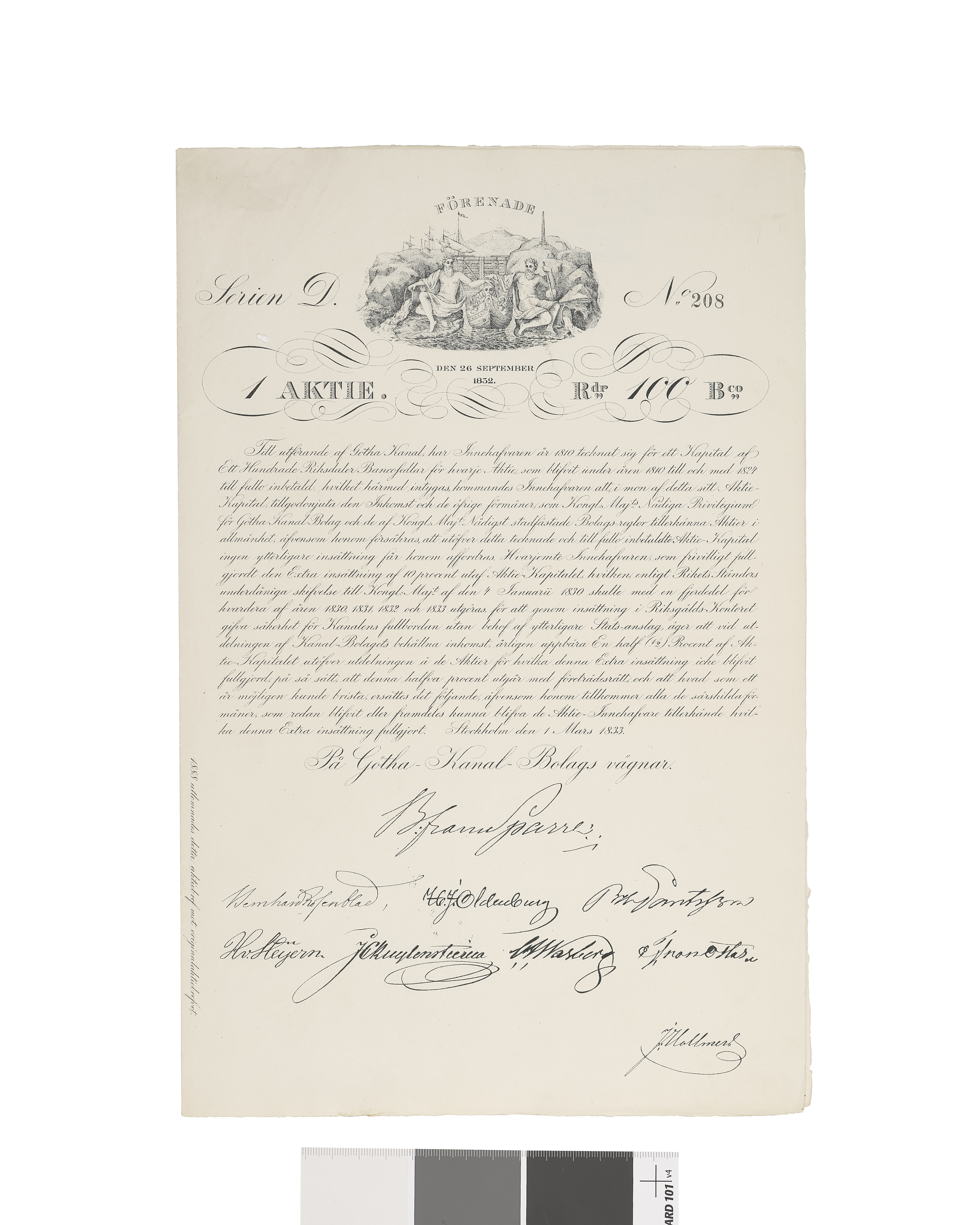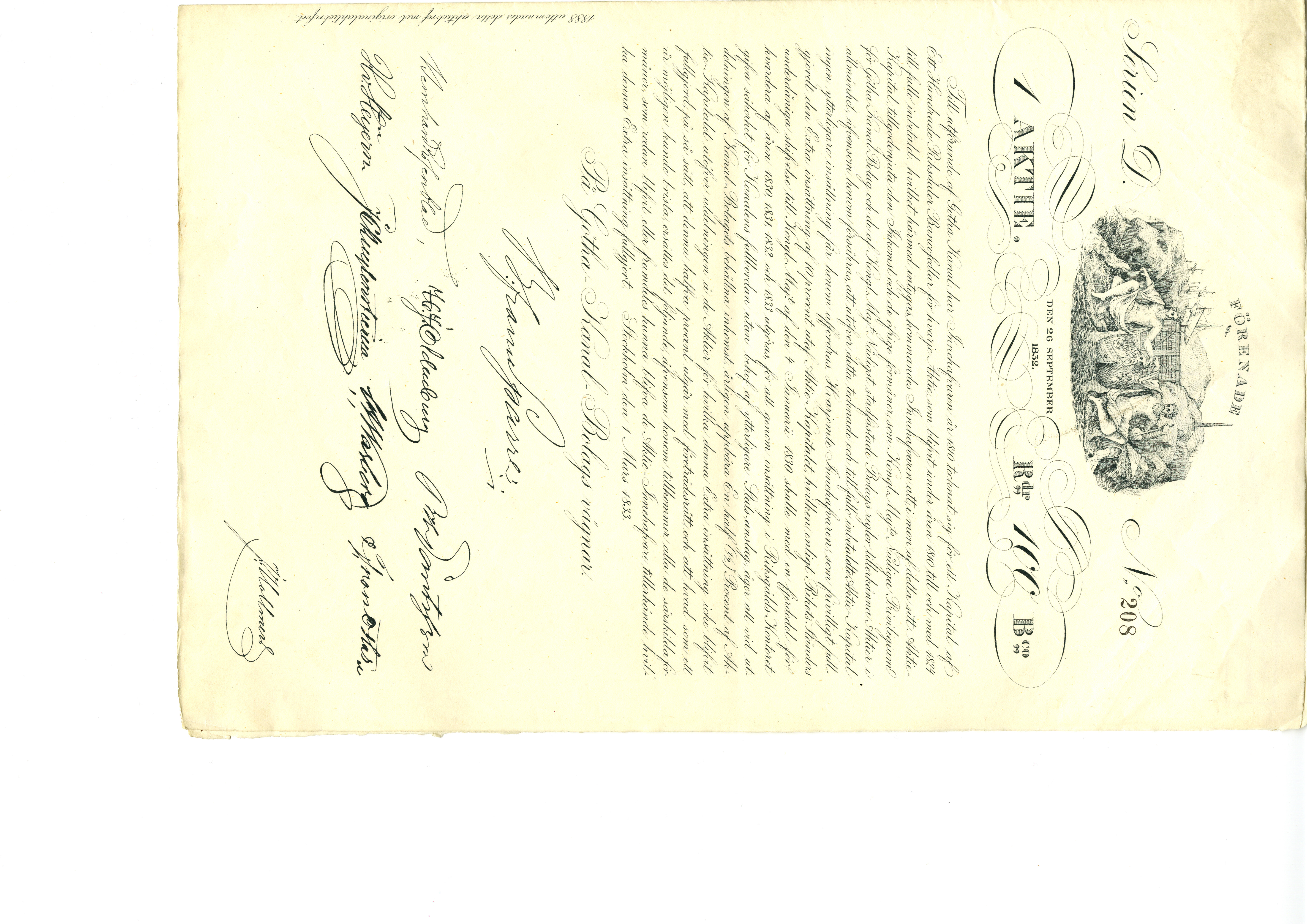 Aktiebrev utgivet av Göta Kanal bolaget, lydande på 100 rdr banco.