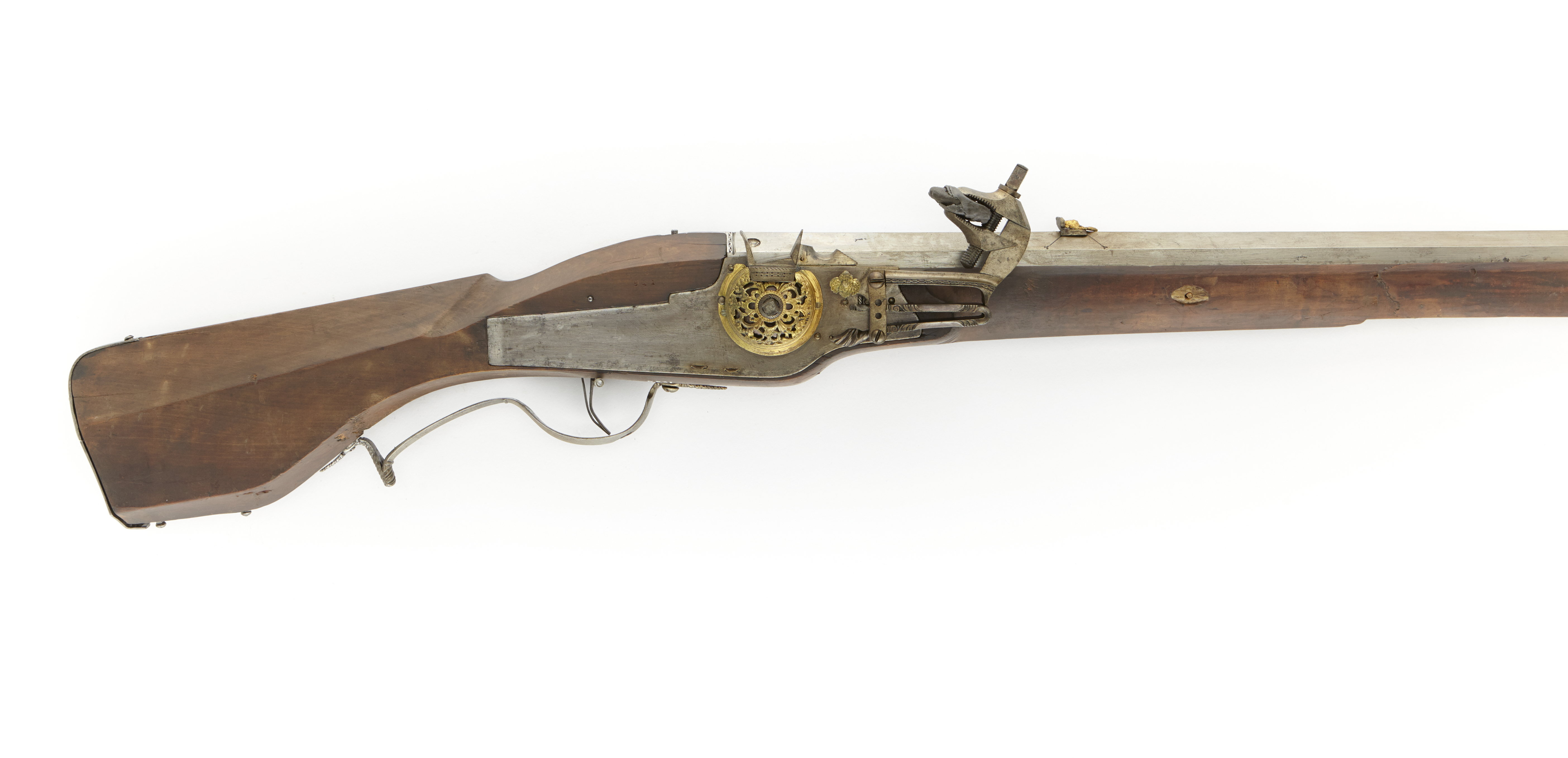 Sexkantig, svinryggspipa. Slätborrad. På kammaren två gånger Elias Pedersens stämpel slagen i silver: "EP" övre ankare (Stöckel 2442). Ståndsikte av stål, med framförliggande förgylld änglabyst. Från siktets vardera hörn utgår ett inslaget streck. Knoppkorn av mässing. Siktränna från svansskruv till korn. Hjullås. Låsbleck av blånerat stål, bakåt avsmalnande genom två fall. Låsblecket baktill rakt avskuret. Kullrig hjulkapsel av förgylld och genombruten mässing. Tryckknapp likaså av mässing, och utformad som änglabyst. Låg, rundad krutskärm. Hane med lös underkäke. Hel stock av ljust trä. Muskötliknande kolvtyp, kantig med rundad anslagssida. Bakplåt av stål, med undre delen gångjärnsförsedd - fungerar som lock åt kolvlådan, vilken är djup och läderfodrad. De båda låsskruvarna samt tre pipstiften har brickor av hjorthorn. Varbygel av stål, liknande karbinvarbygel. Tillbehör: Laddstock med balusterformig doppsko av stål, med holk och skaftskenor. Svavelkis i blymantel. Märkt: 521 ovanför låsblecket, stanstyp 5376. 25 med blyerts på anslaget. 1710 års inventarium p. 11, rum II: "7-521-1 Svinrygg med blanck pijpa, Hiulåås och förgylt puckla . . .-. .-".