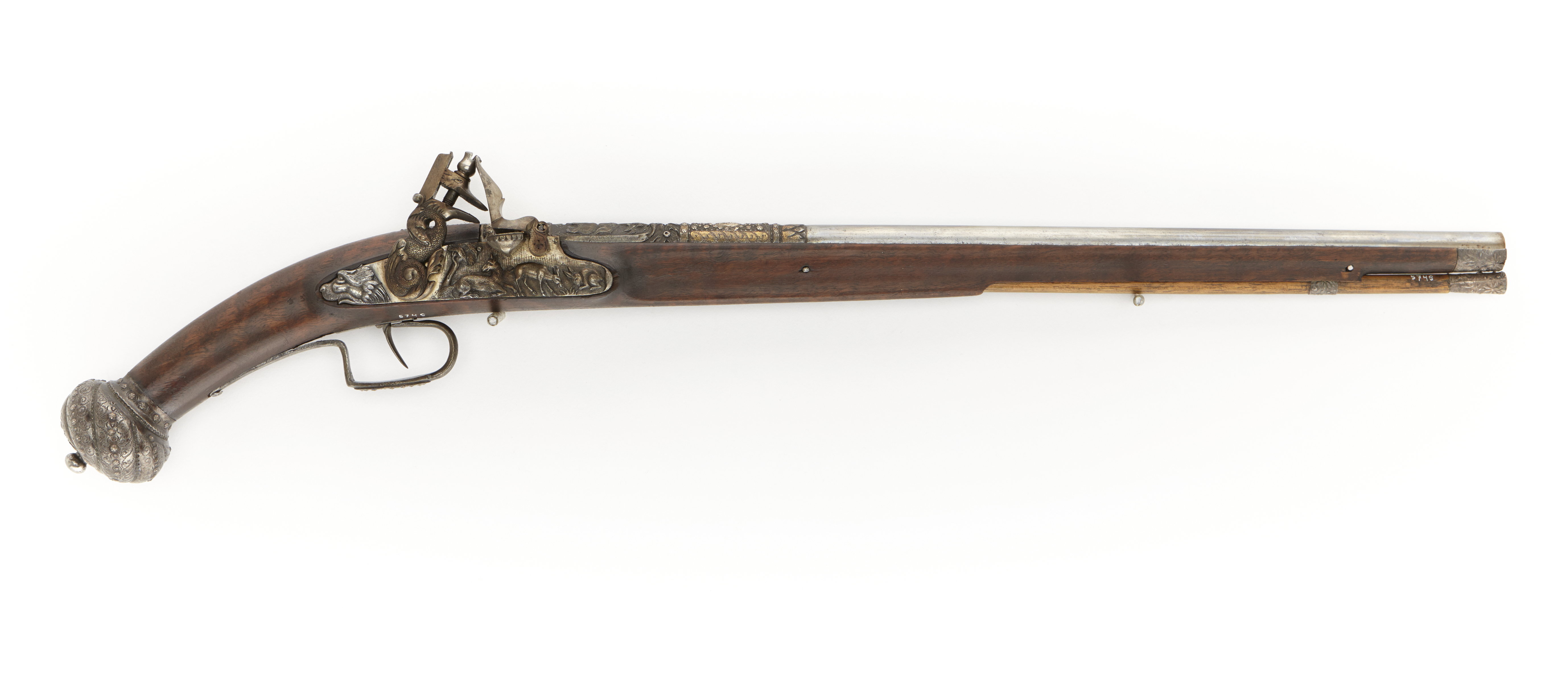 Rund, slätborrad pipa av stål. Över kammaren inlagda stjärnor av silver, ett reliefsnidat mässingsbleck inlagt baktill, skulpterande djur av stål och medaljong av silver med lagerkrönt profil. Två häften. Flintlås av stål med plant låsbleck med ciselerade djur, baktill ett odjurshuvud. Hane med lös överkäke, hankropp i form av hopringlad orm. Eldstål med åsad rygg, kantig fängpanna. Brun helstock av valnöt med rund turbanliknande kolvkula av brunerat stål med spiralformiga räfflor. Punsad dekor och inläggning av silverstjärnor. Rund nitknapp av stål med sexflikig bricka av silver. Överrörka av silver liksom näsband med bladdekor. Varbygel av brunerat stål, utvidgad till en platta på bygelns mitt, inlagd med silverstjärnor. Tillbehör: Laddstock av trä, doppsko av ciselerat silver. Märkt: 45 bakom låsblecket, stanstyp 5376.
