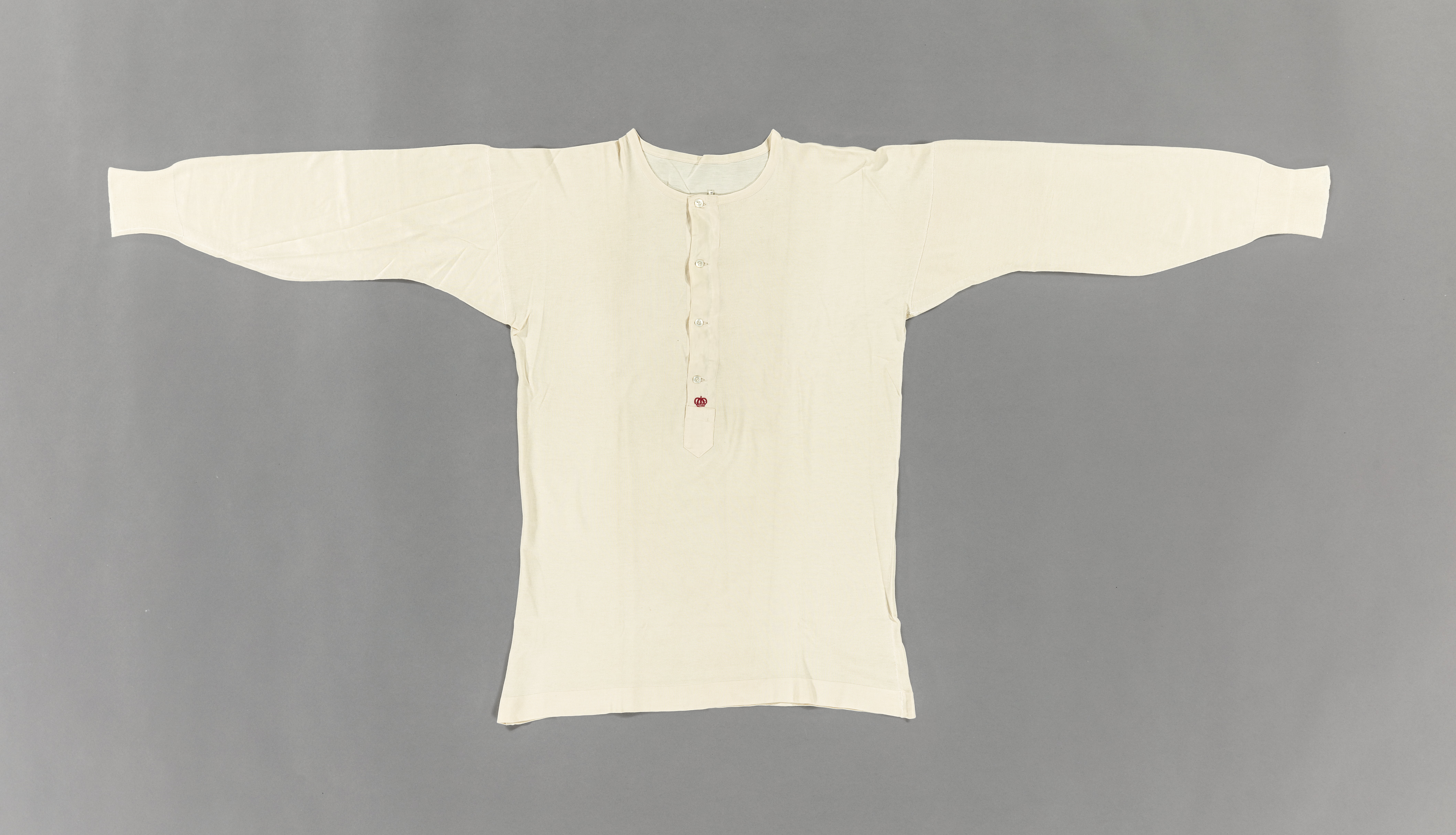 UNDERTRÖJA med rund halsringning och lång ärm, av tunn benvit bomullstrikå. Fram en öppning med knappslå av benvitt bomullstyg, 33,5 cm djup, 4,2 cm bred. Knappslån avslutas nedtill i en spets. Tröjan knäpps med fyra vita pärlemoknappar i fyra horisontalt sydda knapphål. På kappslån, vid dess spets finns broderat en kunglig krona i rött. I halsringning och nedtill finns dubbelvikta kanter. Lång ärm, nedtill på ärmen en ribbstickad mudd, ca. 8,5-9 cm bred. Jämför inv.nr 20882, 20888, 20889, 20890, 20891, 20892.