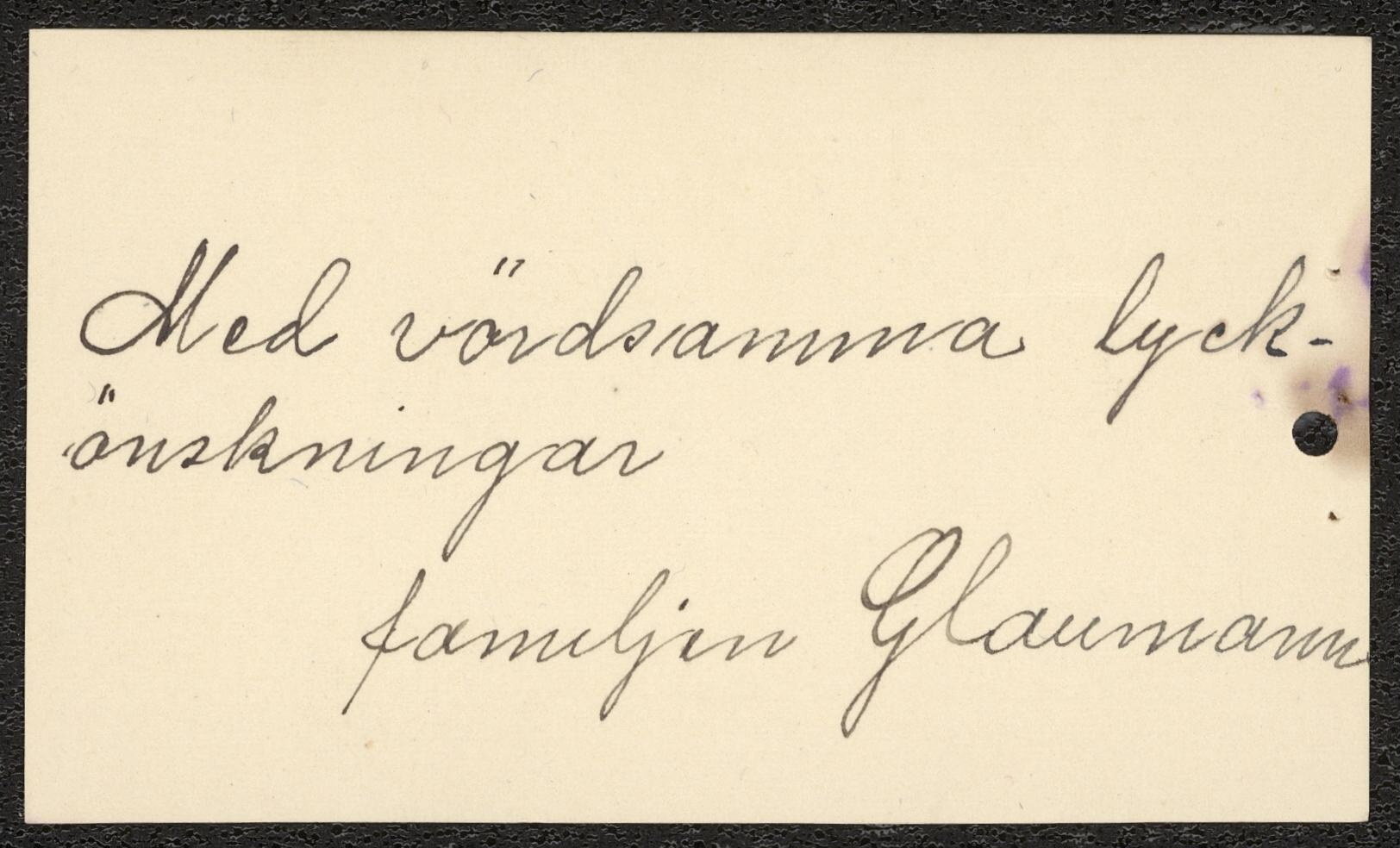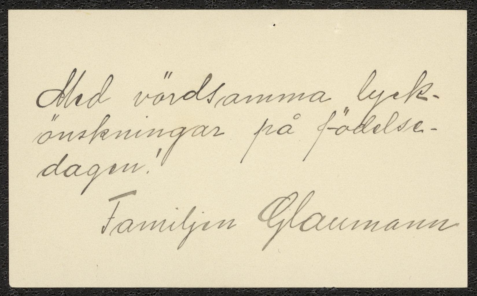 Fyra visitkort från Familjen Glaumann. Första kortet daterat 1925, handskrift "Med vördsamma lyckönskning, Familjen Glaumann". Andra kortet daterat 1925, handskrift "Med vördsamma lyckönskning på födelsedagen. Familjen Glaumann". Tredje kortet daterat 1926, handskrift "Med vördsammaste lyckönskningar. Familjen Glaumann". Fjärde kortet daterat 1929, handskrift "Vördsamma lyckönskningar på födelsedagen. Familjen Glaumann".