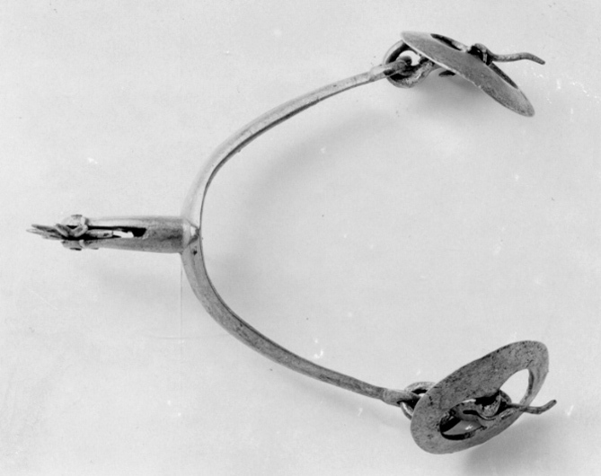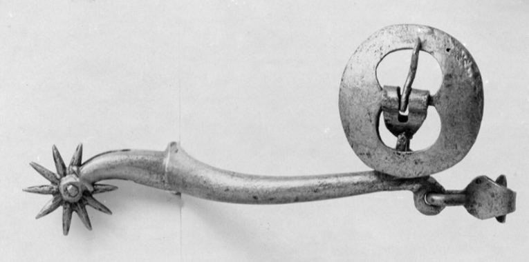 Sporre av förtent stål med u-formade skänklar, den ena något längre och 38 mm lång något nedåtböjd hals och 10-uddig klinga. Skänklarnas ändar med två ringformiga hållare för stora, runda, något välvda remsöljor med bred kant och hakar för hålfotsrem.