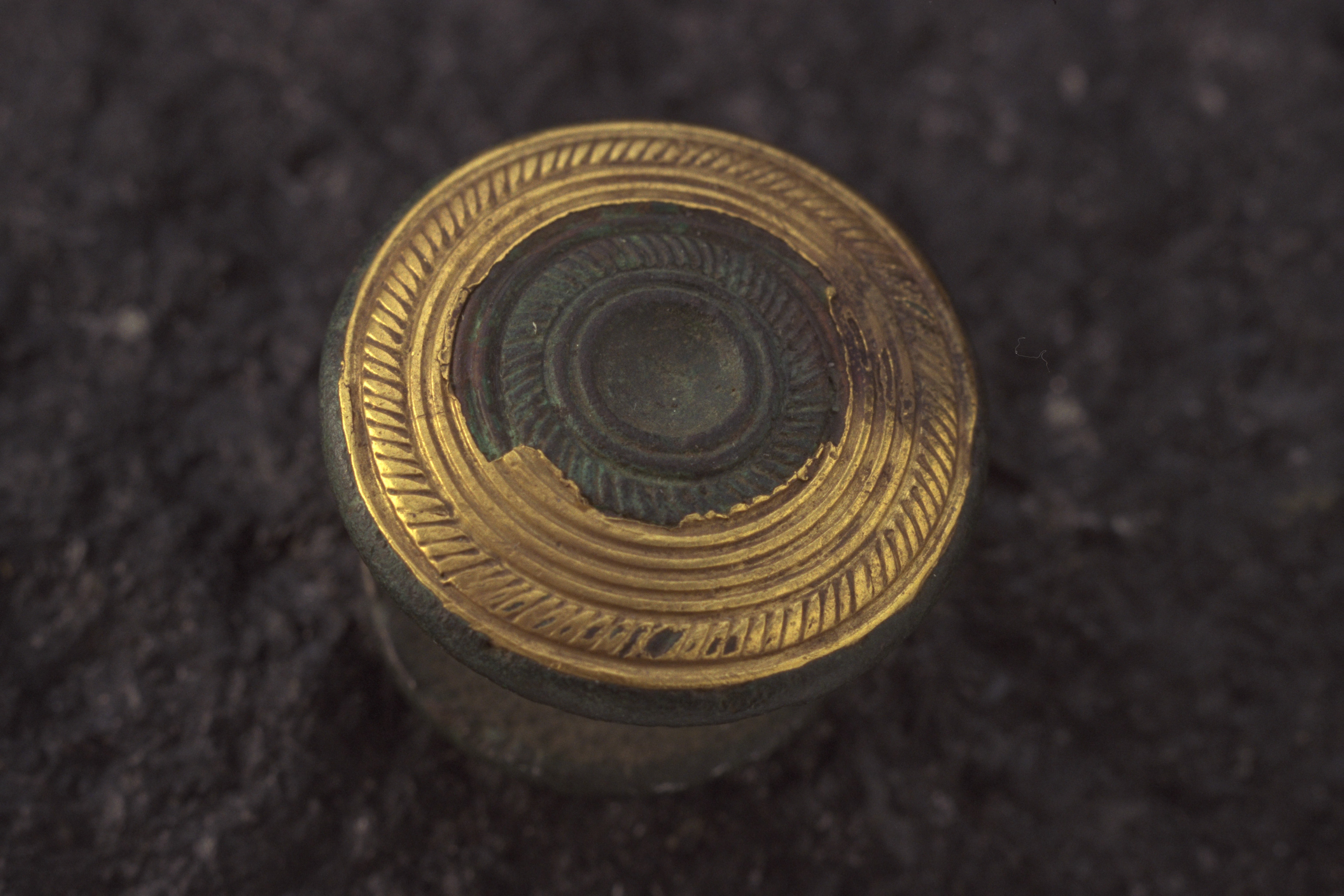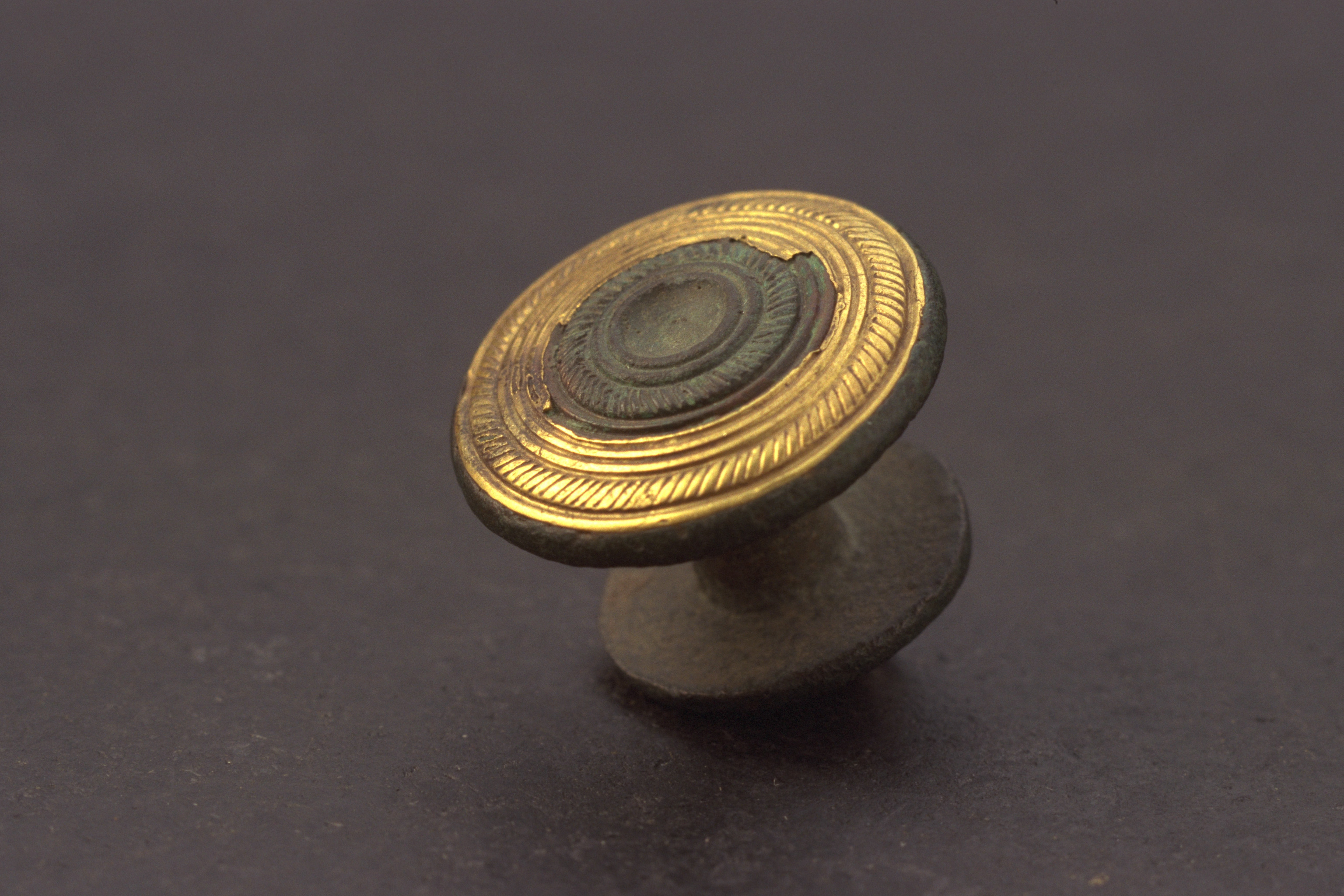 Dubbelknapp med guldbleck. Funnen i hällkista i gravhög. M per IV.