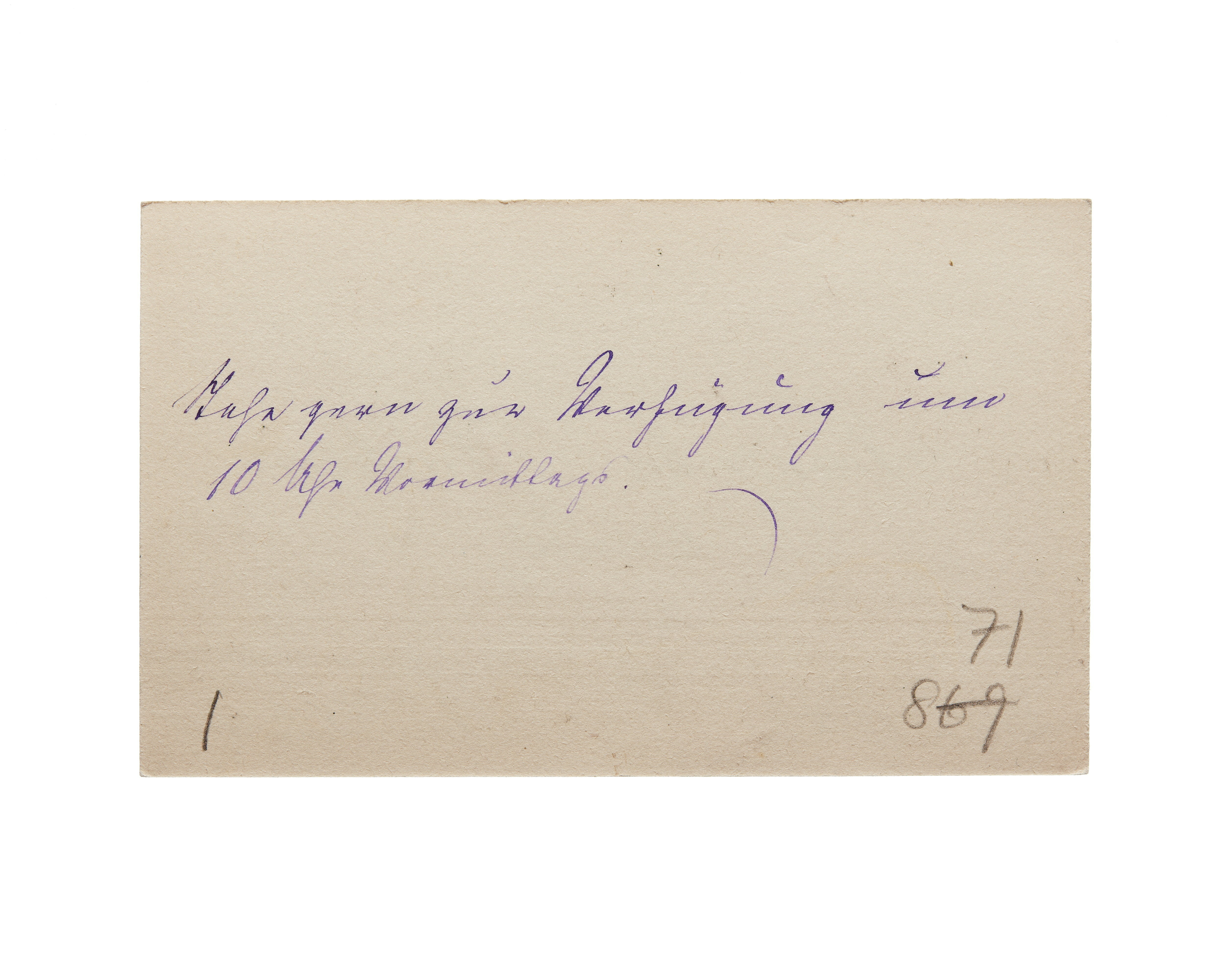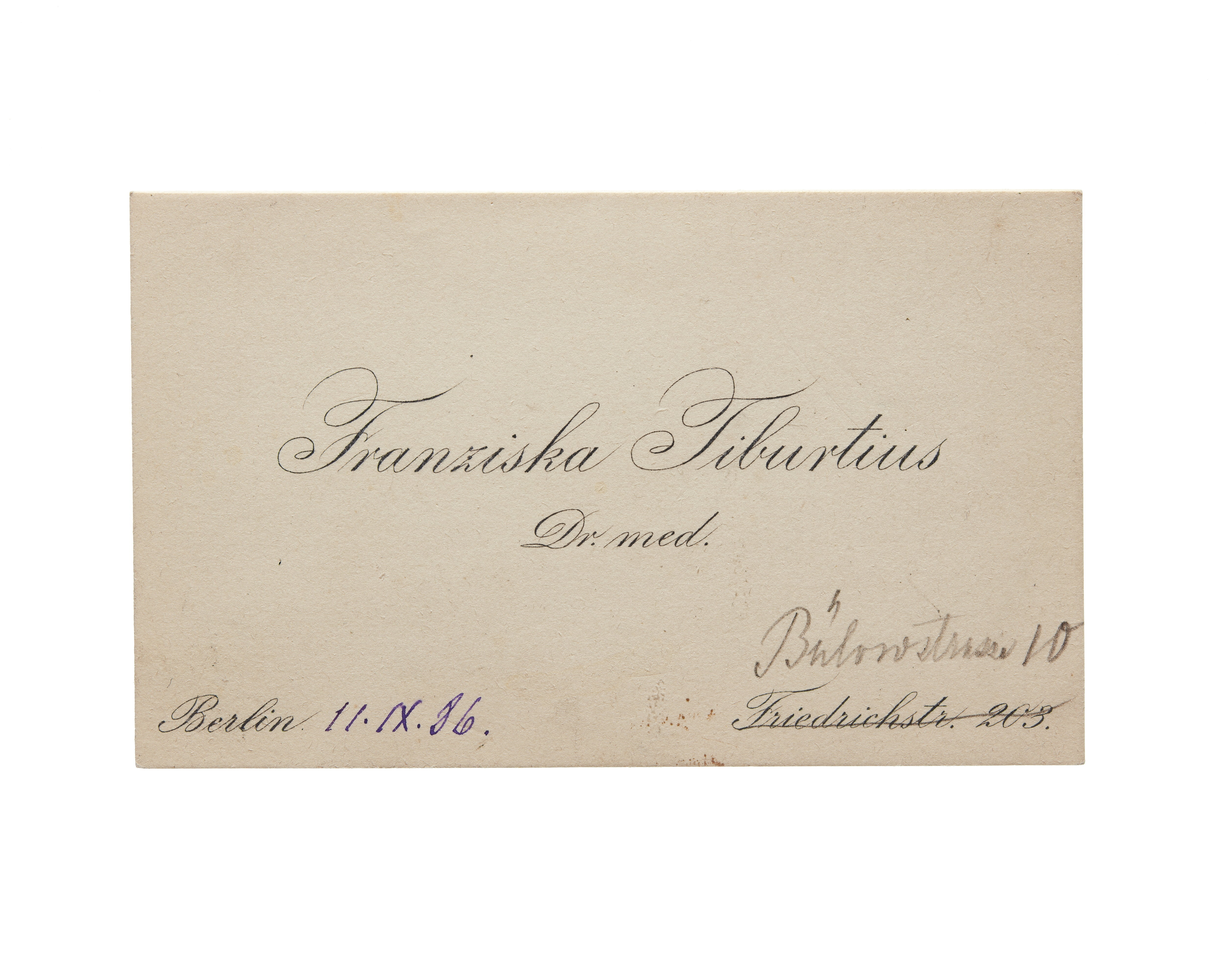 Ett visitkort från Dr. med. Franziska Tiburtius, är utan datum. Adress (nedre vänstra hörnet) Berlin, (nedre högra hörnet, handskrift) "II.IX.86". Handskrift "Bülowstrasse 10"
